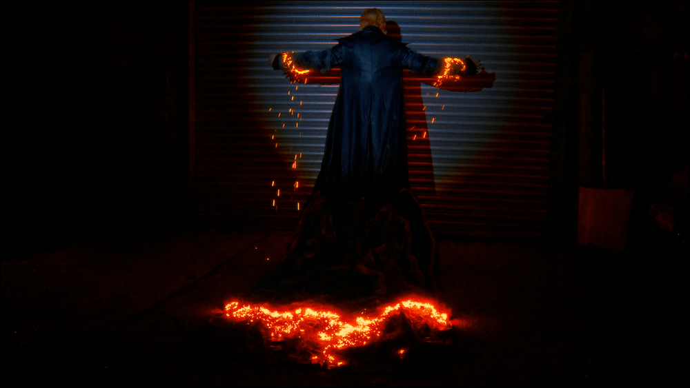 The funniest moment was Mercedes and our assistants having to rub gallons of glycerin all over my body to make my cold sweats come to life. The wildest was probably setting myself on fire on the day of the ambulance strikes in the UK. Sam Macer originally designed the fire jacket for Julia Fox and it was pretty intense experiencing flames burning just millimetres away from my skin.