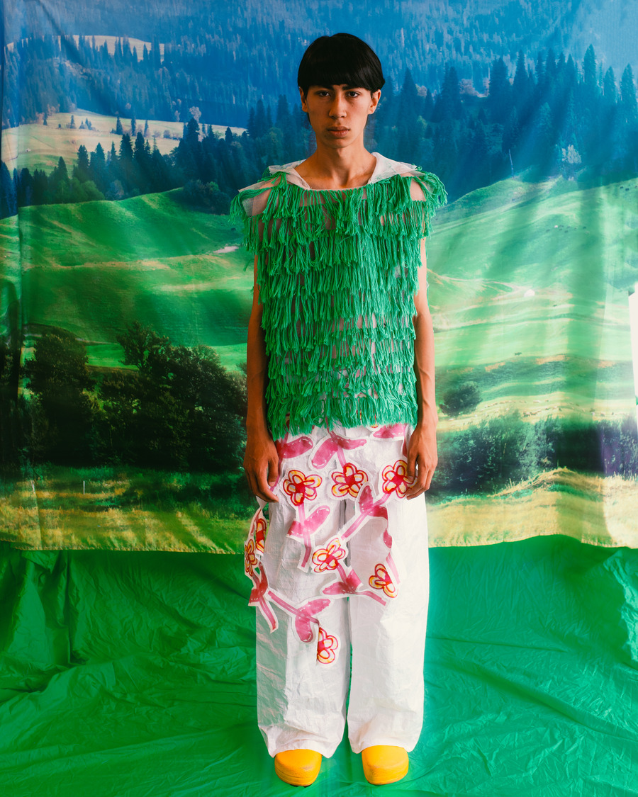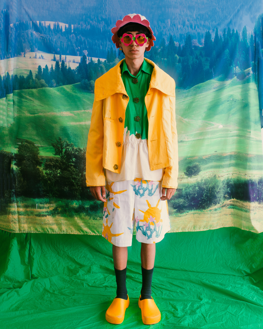 The collection revels in the cherished theme of childhood, with graphic prints that breathe life into each piece. Intricate textures, meticulously crafted with modelling clay, dance alongside hand-drawn illustrations, cut-outs, frayed edges, and vibrant dyes. Every garment effortlessly intertwines playful sophistication with artful craftsmanship.