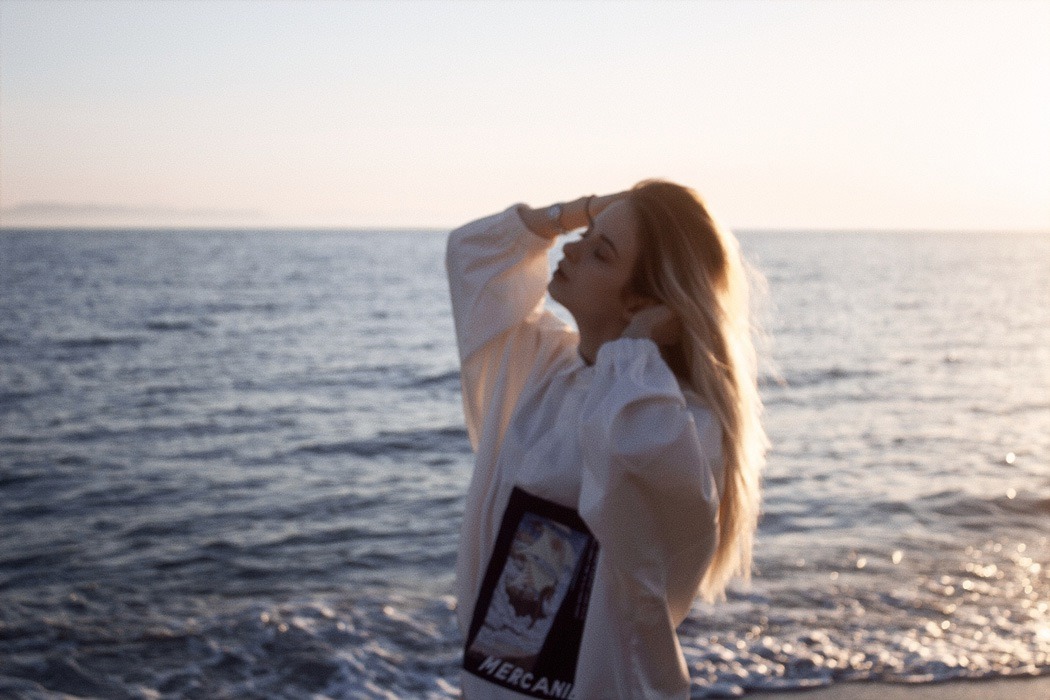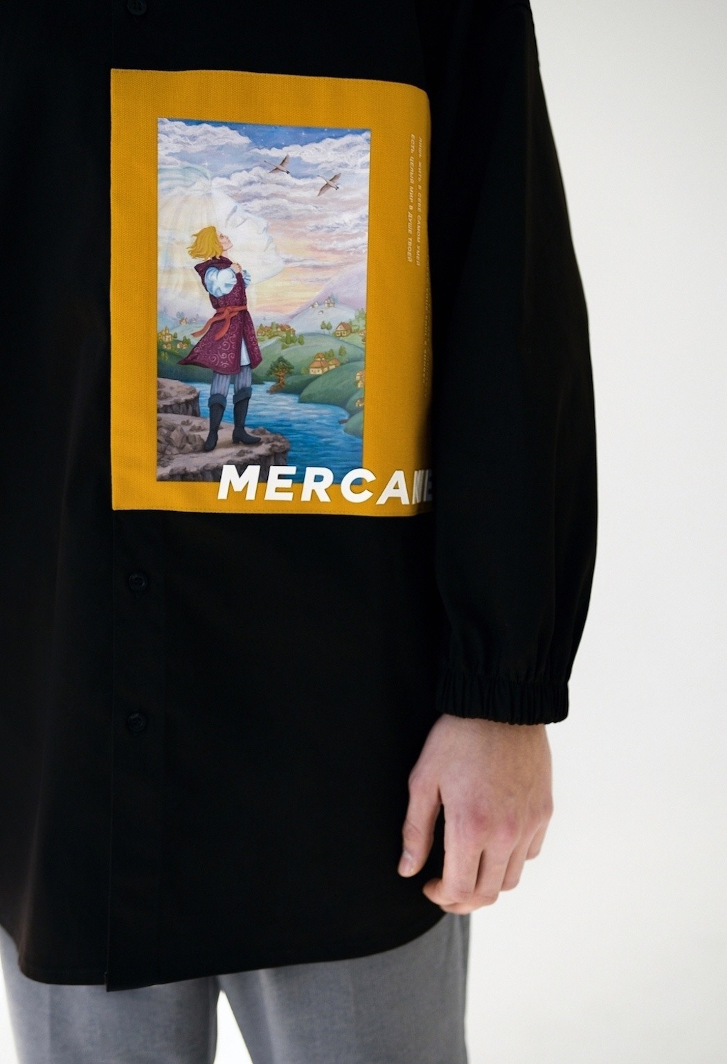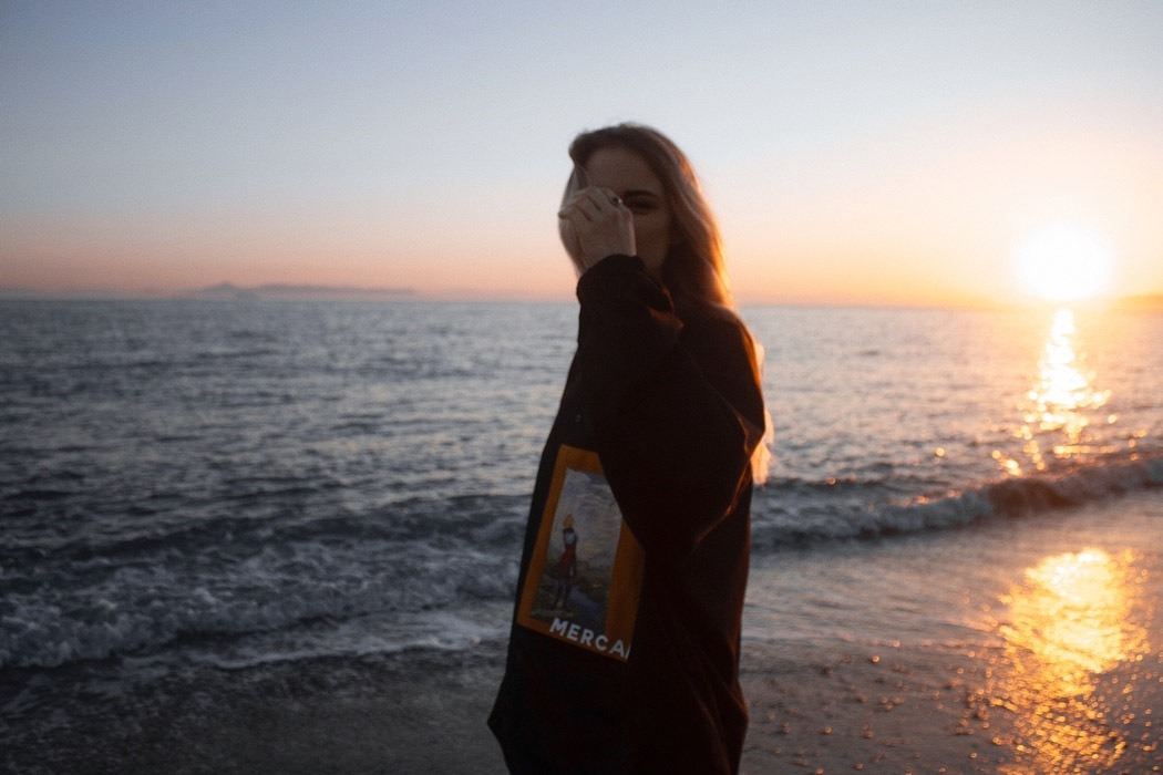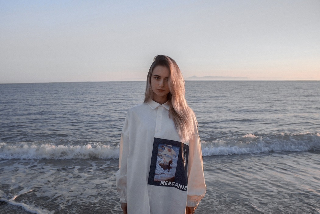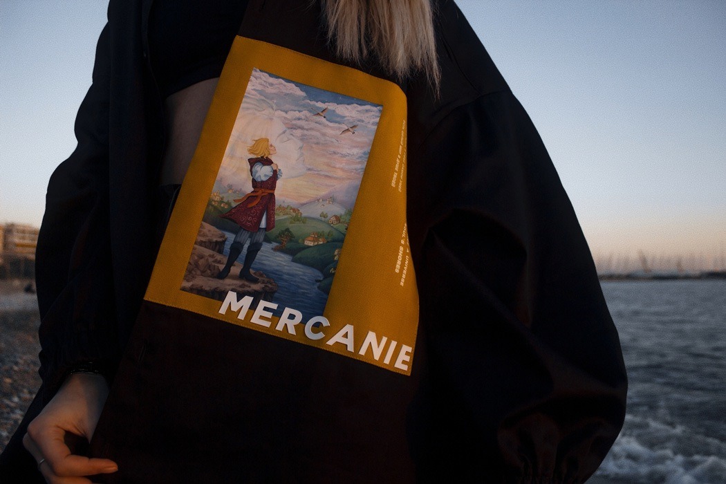 In our times, people love to share values of different cultures and nationalities, so we took the inspiration for our debut collection “From Far-Off Lands” from Eastern Europe culture (especially 3 poems of the famous Russian poets: M.Lermontov “The Sail”, F.Tyutchev “Silentium!”, A.Pushkin “There is a green oak by the sea”) of the era of romanticism. With the sunset and beach vibe, we want to show our vision of what are those poems about discovering your own personality, searching for the dreams and to be open for something that could be strange at the first time, but afterwards could turn into something beautiful. So whole these meanings and ideas we’ve put on the pictures (drawn by our team artist) and printed them with parts of the poems on our shirts. The idea of unisex oversized architecture has come by itself when we thought about the word “freedom”, not only physical but also mental.