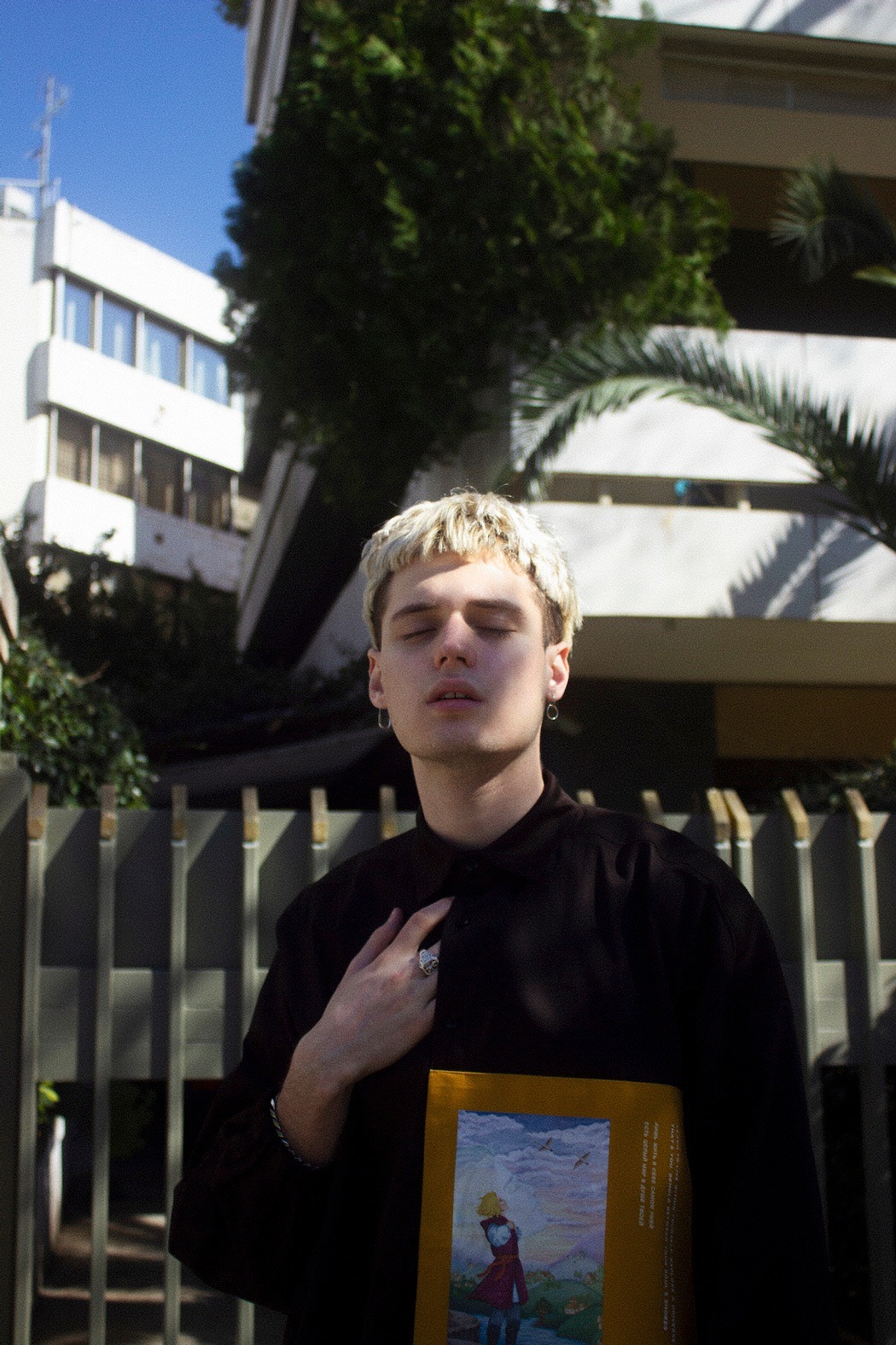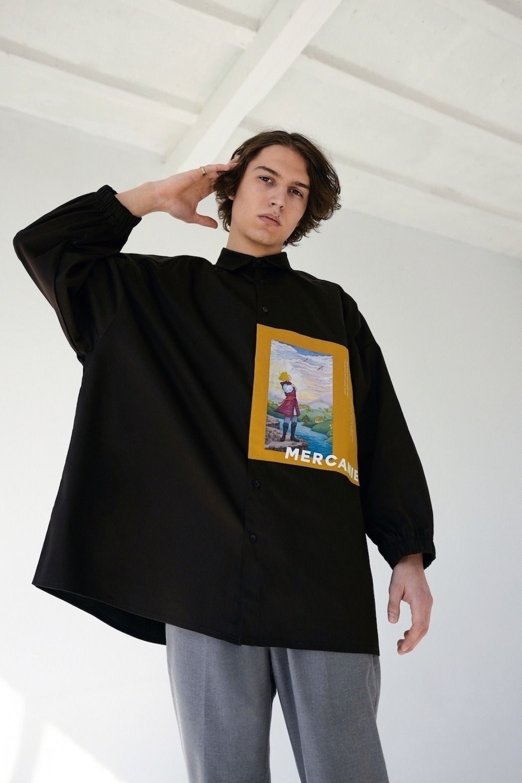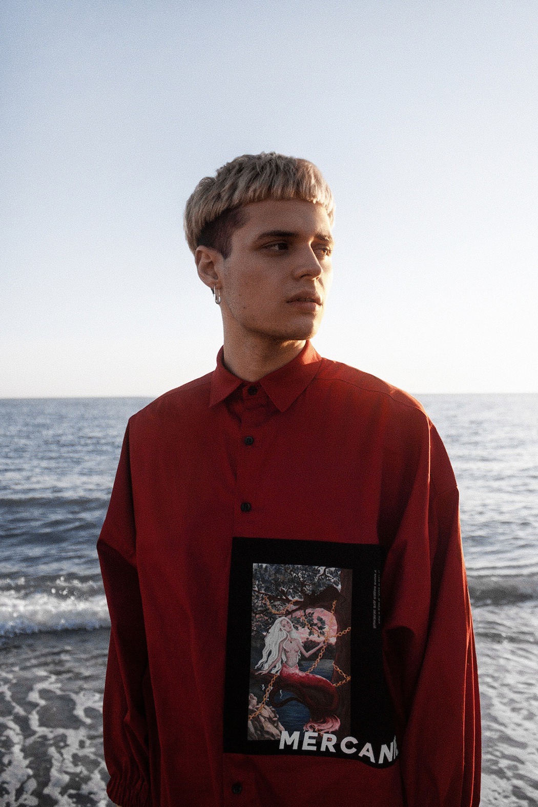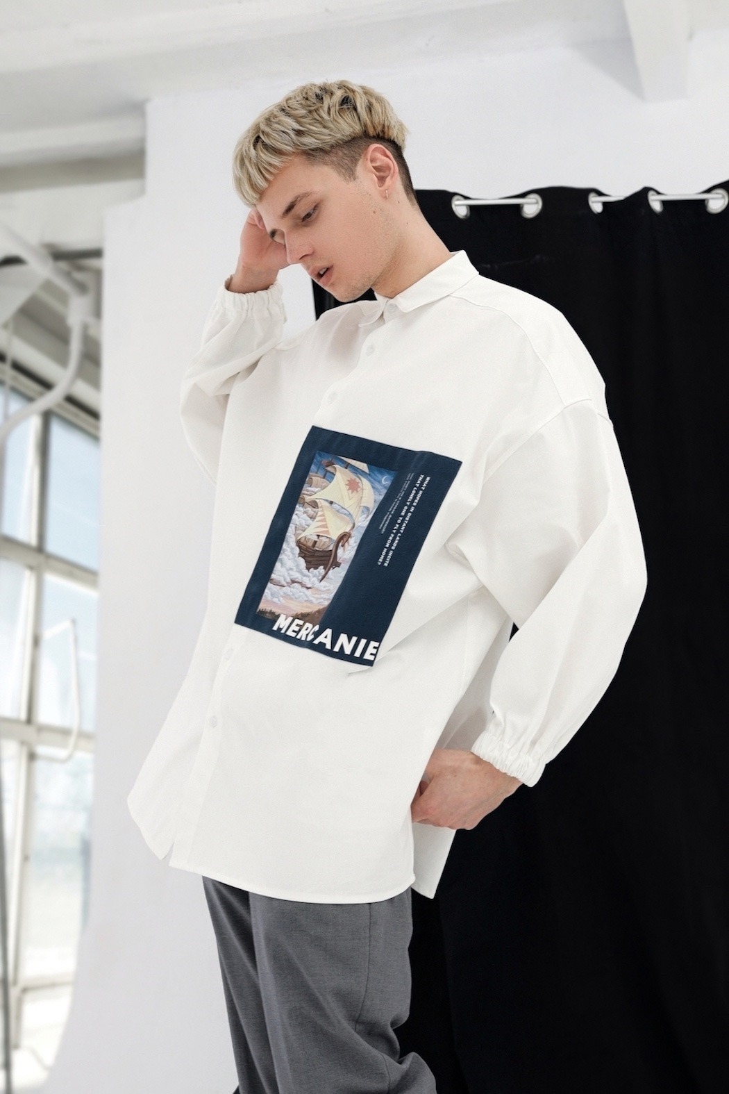 In our times, people love to share values of different cultures and nationalities, so we took the inspiration for our debut collection “From Far-Off Lands” from Eastern Europe culture (especially 3 poems of the famous Russian poets: M.Lermontov “The Sail”, F.Tyutchev “Silentium!”, A.Pushkin “There is a green oak by the sea”) of the era of romanticism. With the sunset and beach vibe, we want to show our vision of what are those poems about discovering your own personality, searching for the dreams and to be open for something that could be strange at the first time, but afterwards could turn into something beautiful. So whole these meanings and ideas we’ve put on the pictures (drawn by our team artist) and printed them with parts of the poems on our shirts. The idea of unisex oversized architecture has come by itself when we thought about the word “freedom”, not only physical but also mental.