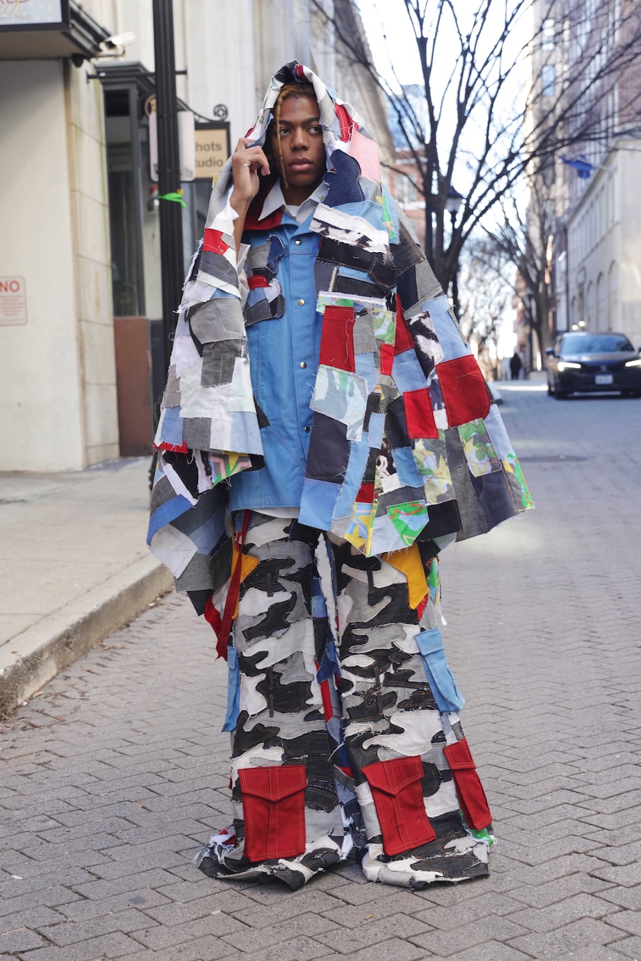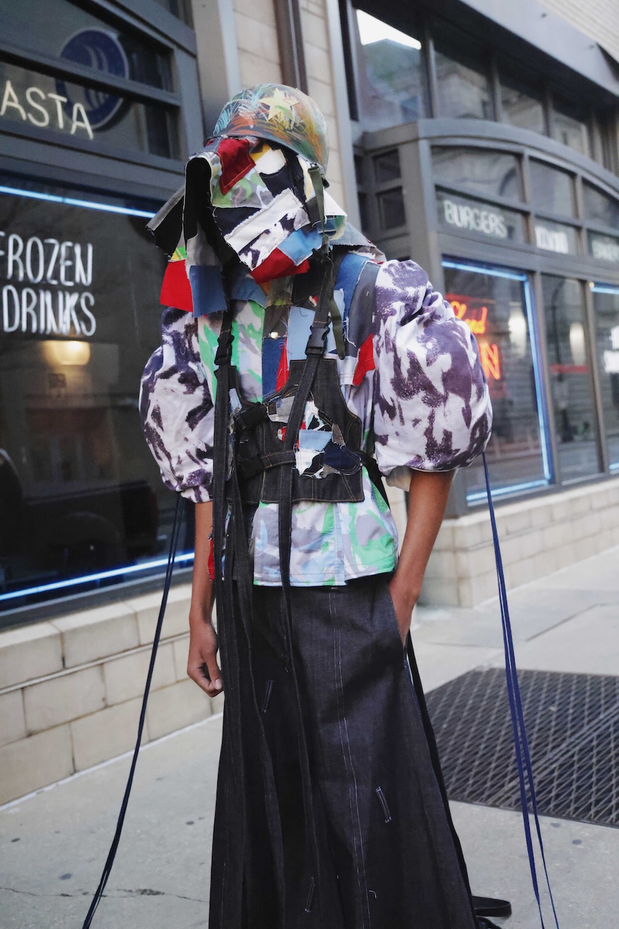 Rooted in sustainability, the project translates child-inspired collage techniques into reconstructed denim patchwork, developing a custom camouflage motif through layered textile composition rather than surface print. This innovative approach reframes camouflage as a constructed narrative—built from fragments, memory, and material experimentation—rather than conventional military repetition.