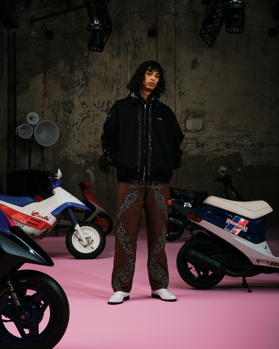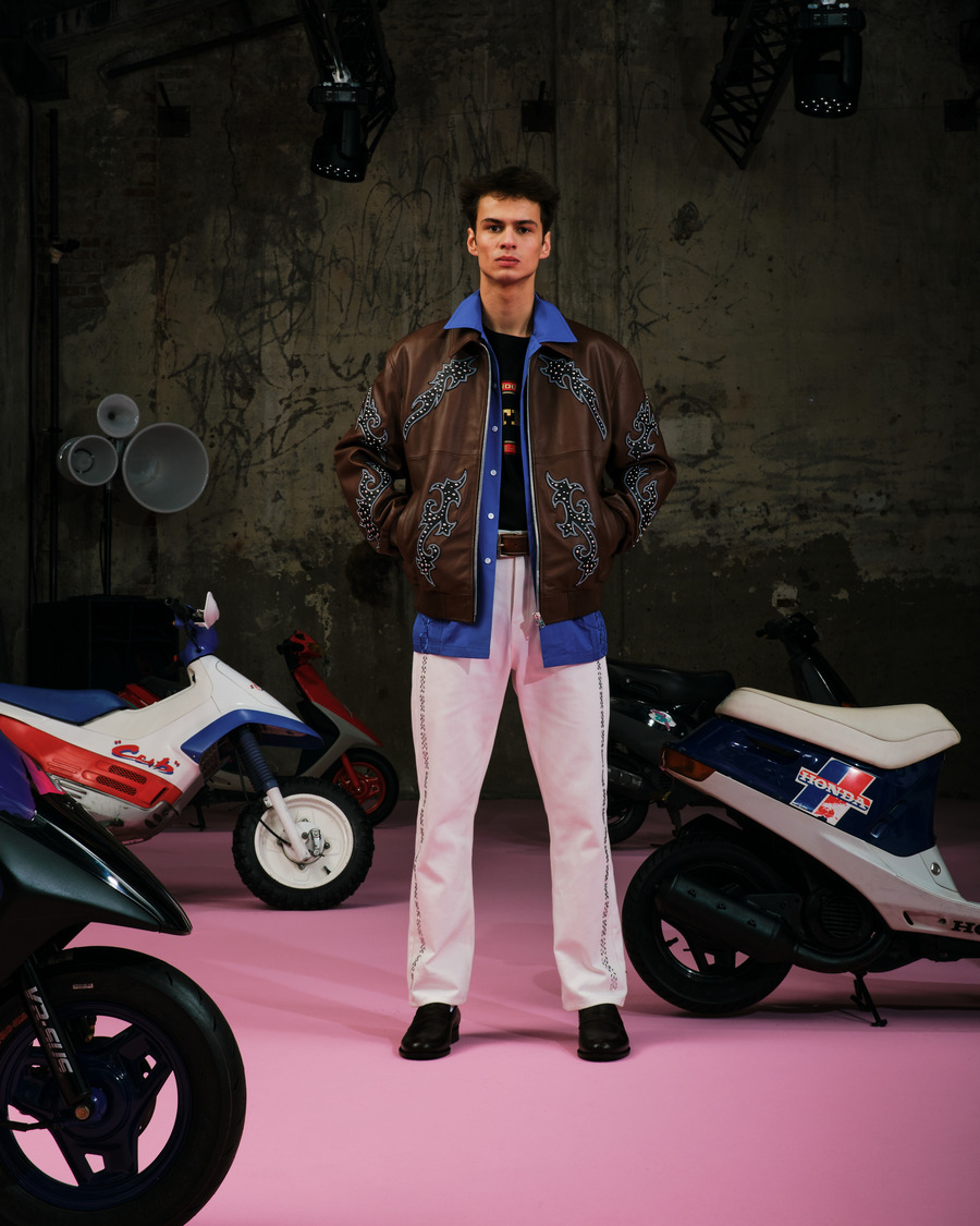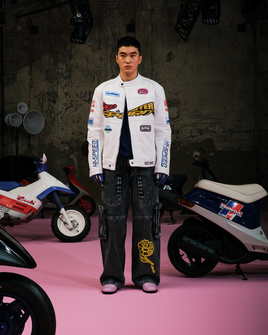 The FW23 collection includes collaborations with military specialist Alpha Industries, Italian tuning master Polini, and David Lynch’s cult serial drama Twin Peaks, featuring embroidered racing leather jackets with inlay patches, a subculture-inspired flight jacket with oversize patches, and a Laura Palmer printed leather jacket. As part of the collection, IUTER will present two-needle stitched denim, custom-made embroidered paisley, printed velvet, 3d reverse-textured Cordura® garments, 3-layer heat-welded shell, rhinestones and crystals embroidered details, Majotech® reflective fabrics, pearl inserts, and many more flashy tricks.