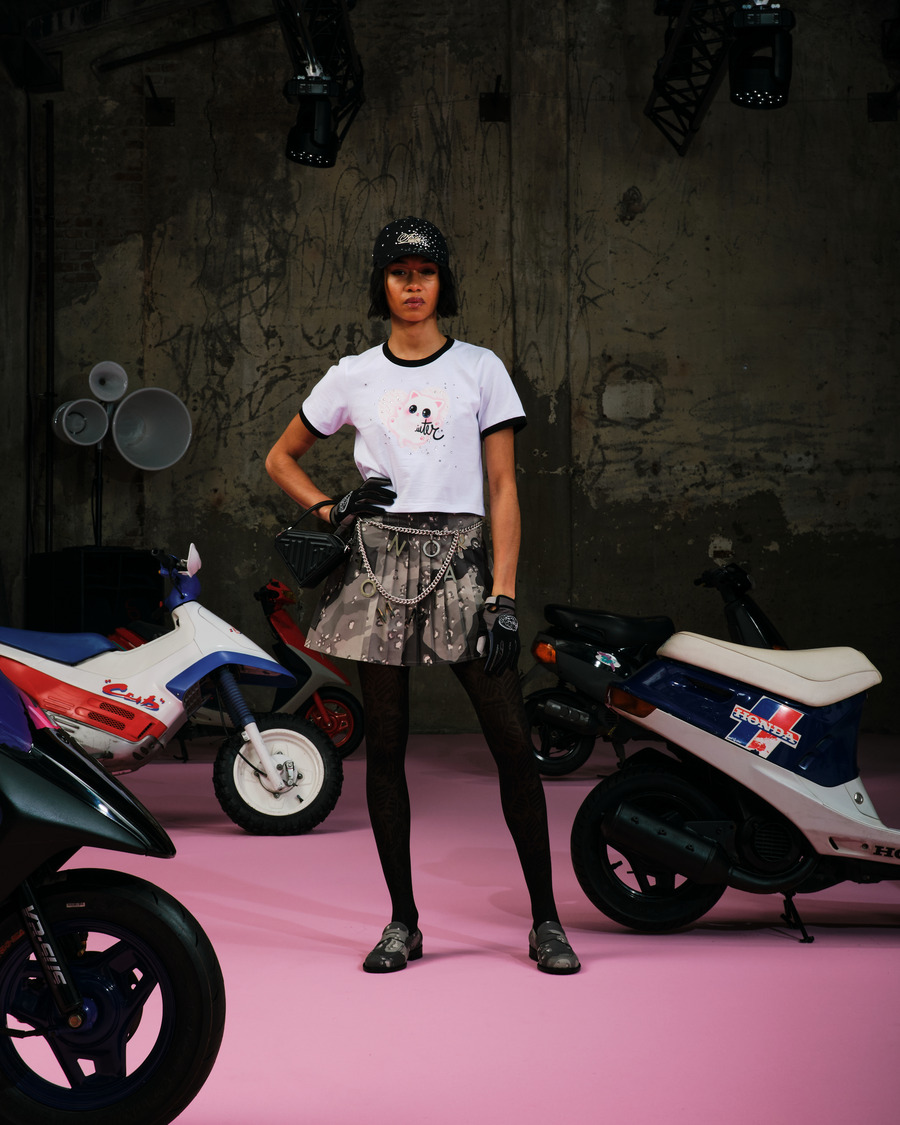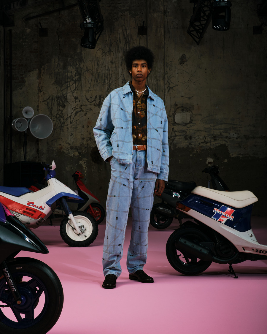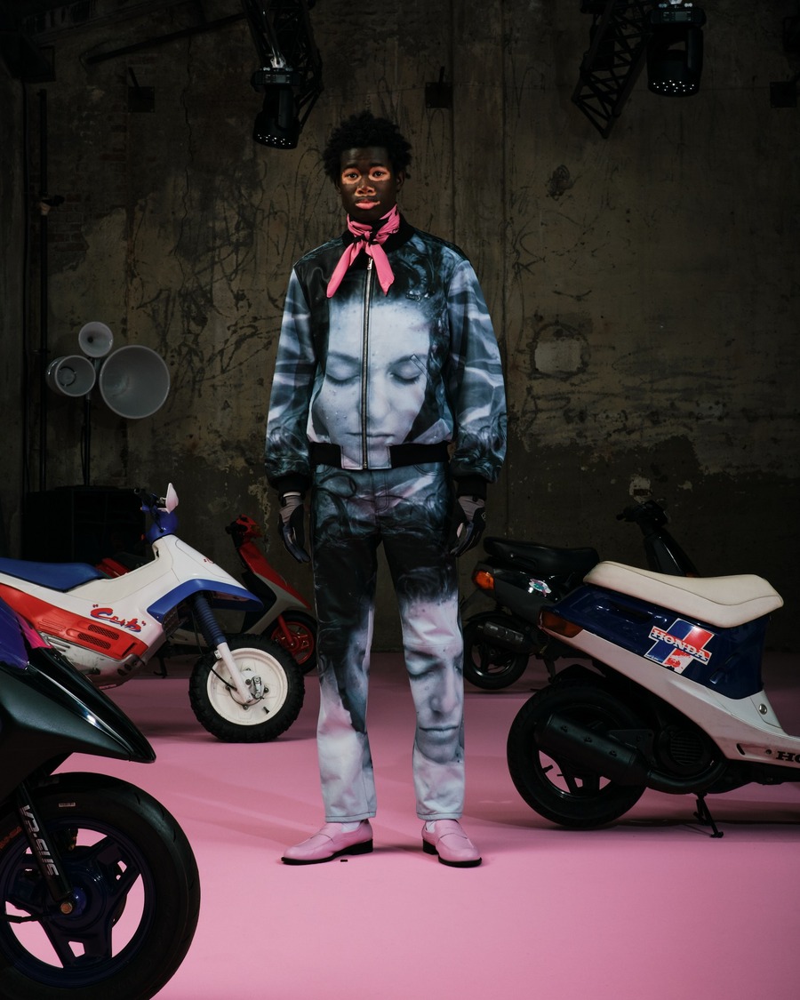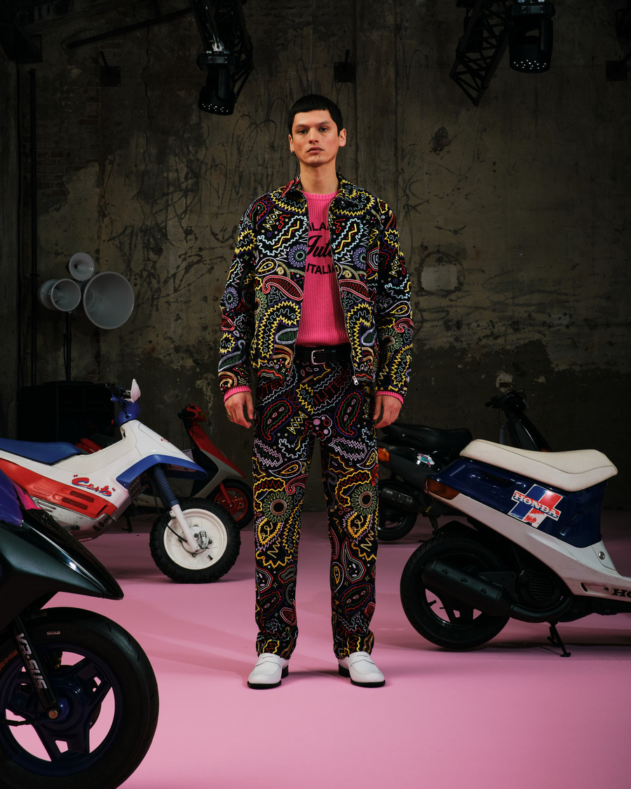 The FW23 collection includes collaborations with military specialist Alpha Industries, Italian tuning master Polini, and David Lynch’s cult serial drama Twin Peaks, featuring embroidered racing leather jackets with inlay patches, a subculture-inspired flight jacket with oversize patches, and a Laura Palmer printed leather jacket. As part of the collection, IUTER will present two-needle stitched denim, custom-made embroidered paisley, printed velvet, 3d reverse-textured Cordura® garments, 3-layer heat-welded shell, rhinestones and crystals embroidered details, Majotech® reflective fabrics, pearl inserts, and many more flashy tricks.