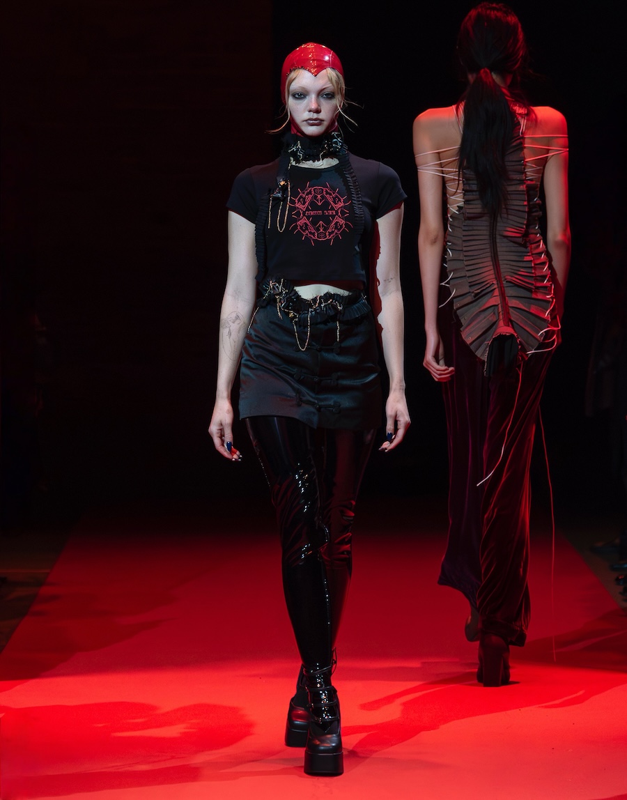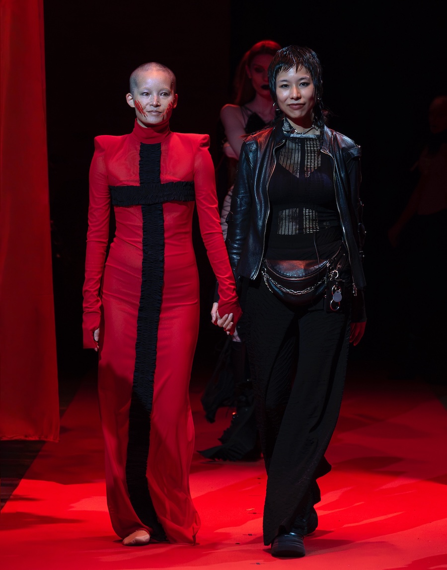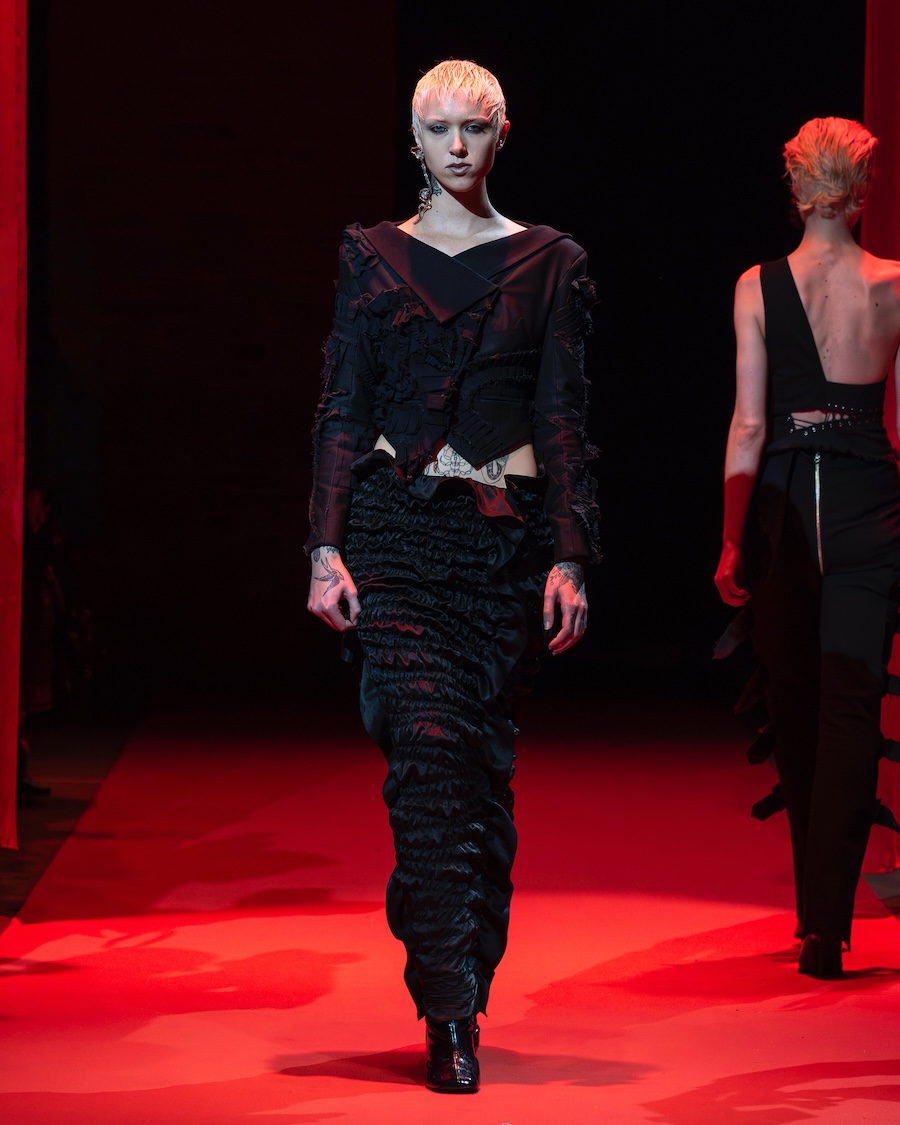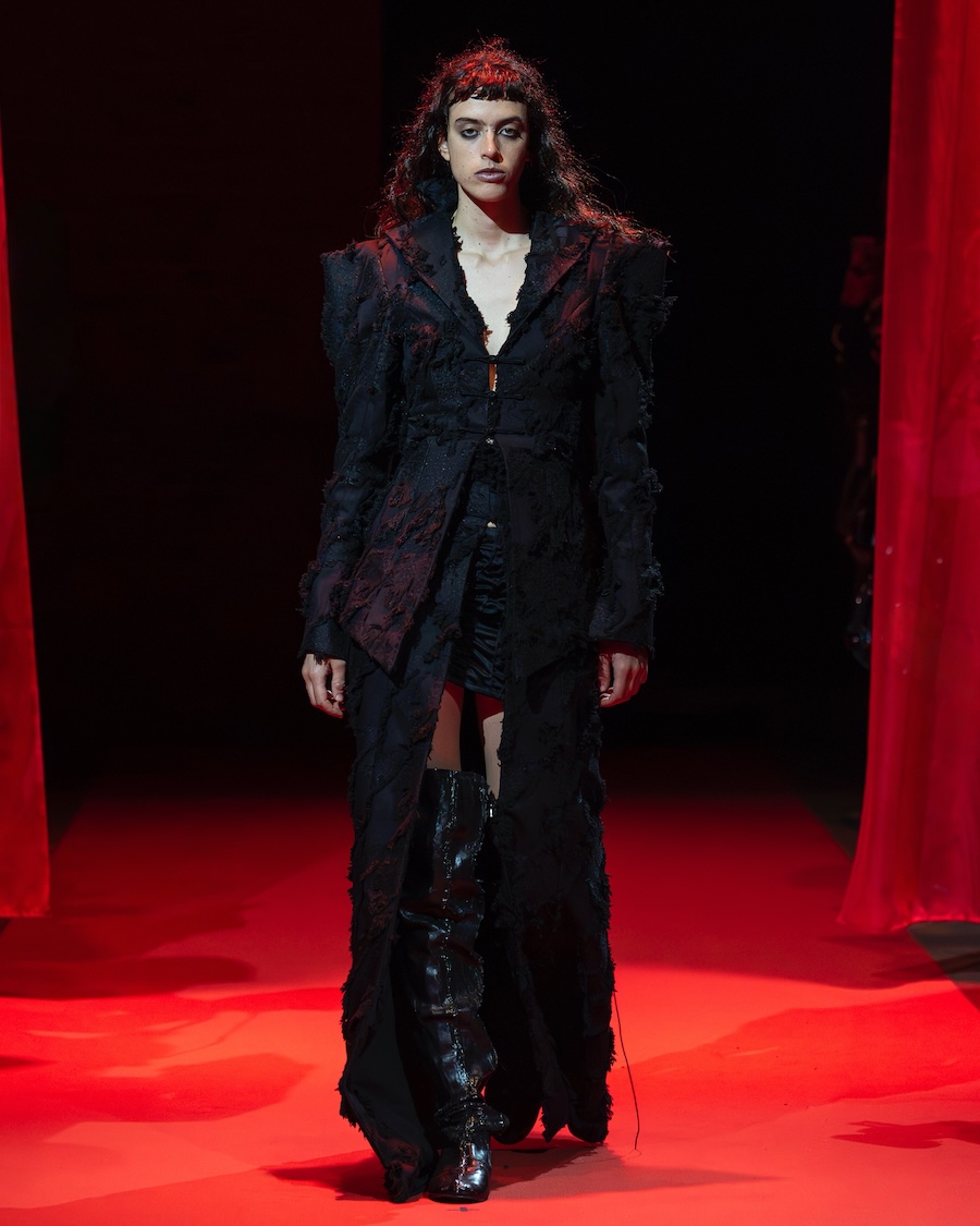 Known for ripping clothes apart and stitching them back with philosophy, this season JENN LEE swerved into Dream of the Red Chamber, yes, 18th-century Chinese lit, but flipped into East Asian sensuality with a vamp bite. Imagine underground club kids dressed by an immortal qipao artisan. Imagine heritage elegance, then dunk it in black leather and blood-red gloss. That’s the mood.