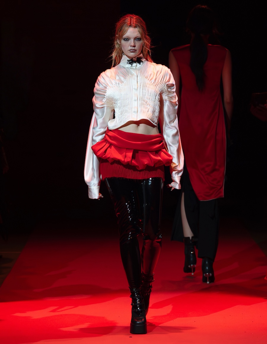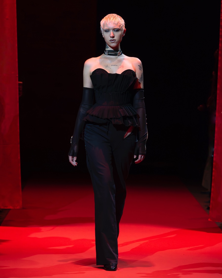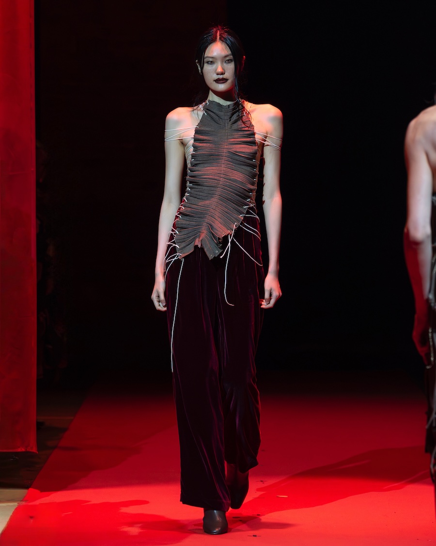 Known for ripping clothes apart and stitching them back with philosophy, this season JENN LEE swerved into Dream of the Red Chamber, yes, 18th-century Chinese lit, but flipped into East Asian sensuality with a vamp bite. Imagine underground club kids dressed by an immortal qipao artisan. Imagine heritage elegance, then dunk it in black leather and blood-red gloss. That’s the mood.
