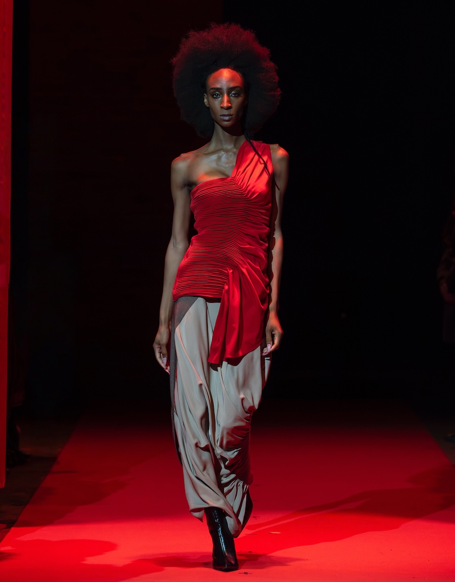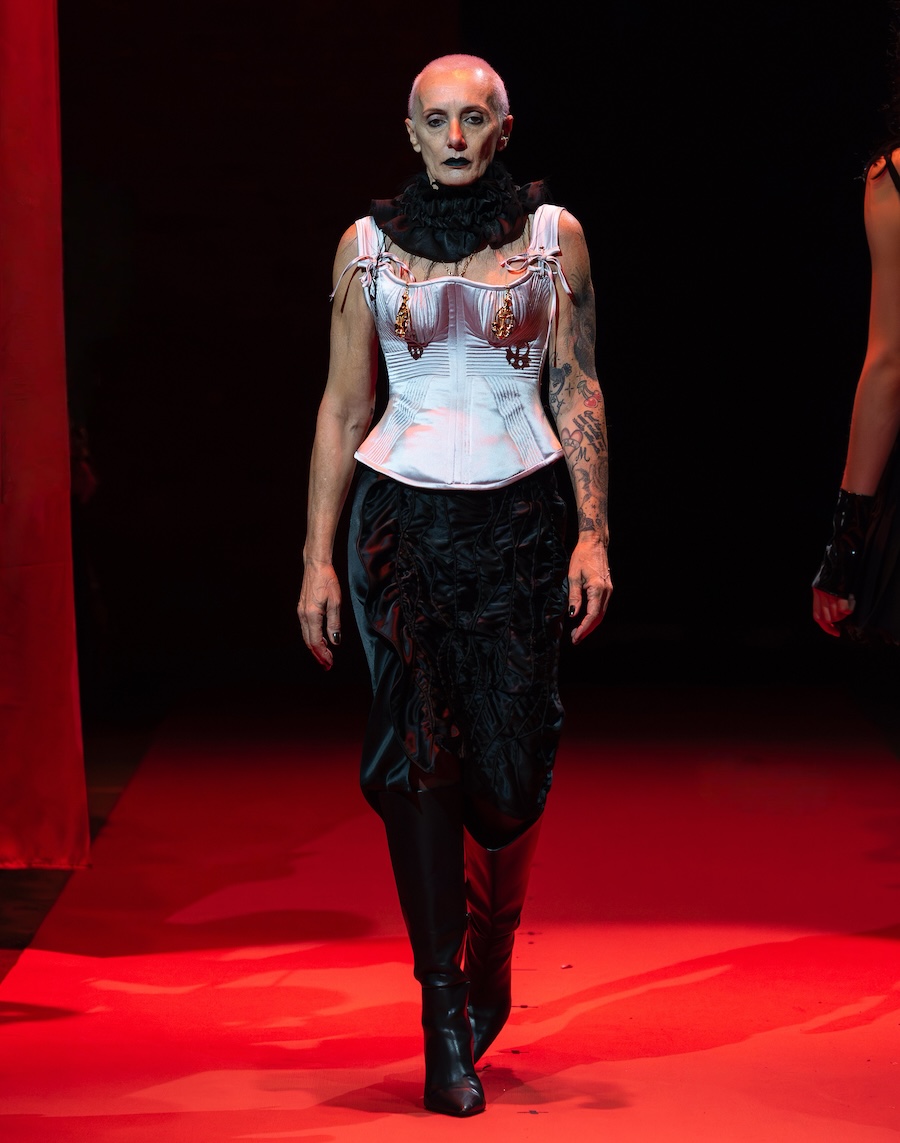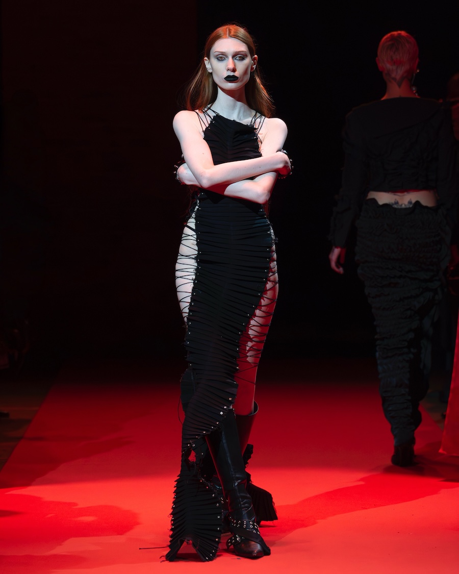 And just when you thought it couldn’t get darker: a square-shoulder leather jacket, resurrected from a ‘70s vintage piece, strutted down like Dracula’s power suit. Handcrafted knot fastenings, exaggerated silhouette, pure vampiric thirst. If Nosferatu had a Pinterest board, this would be it.