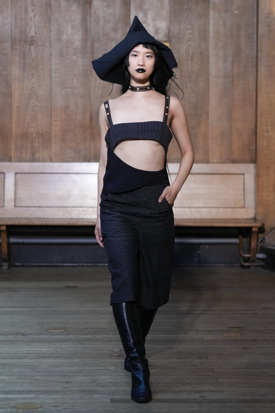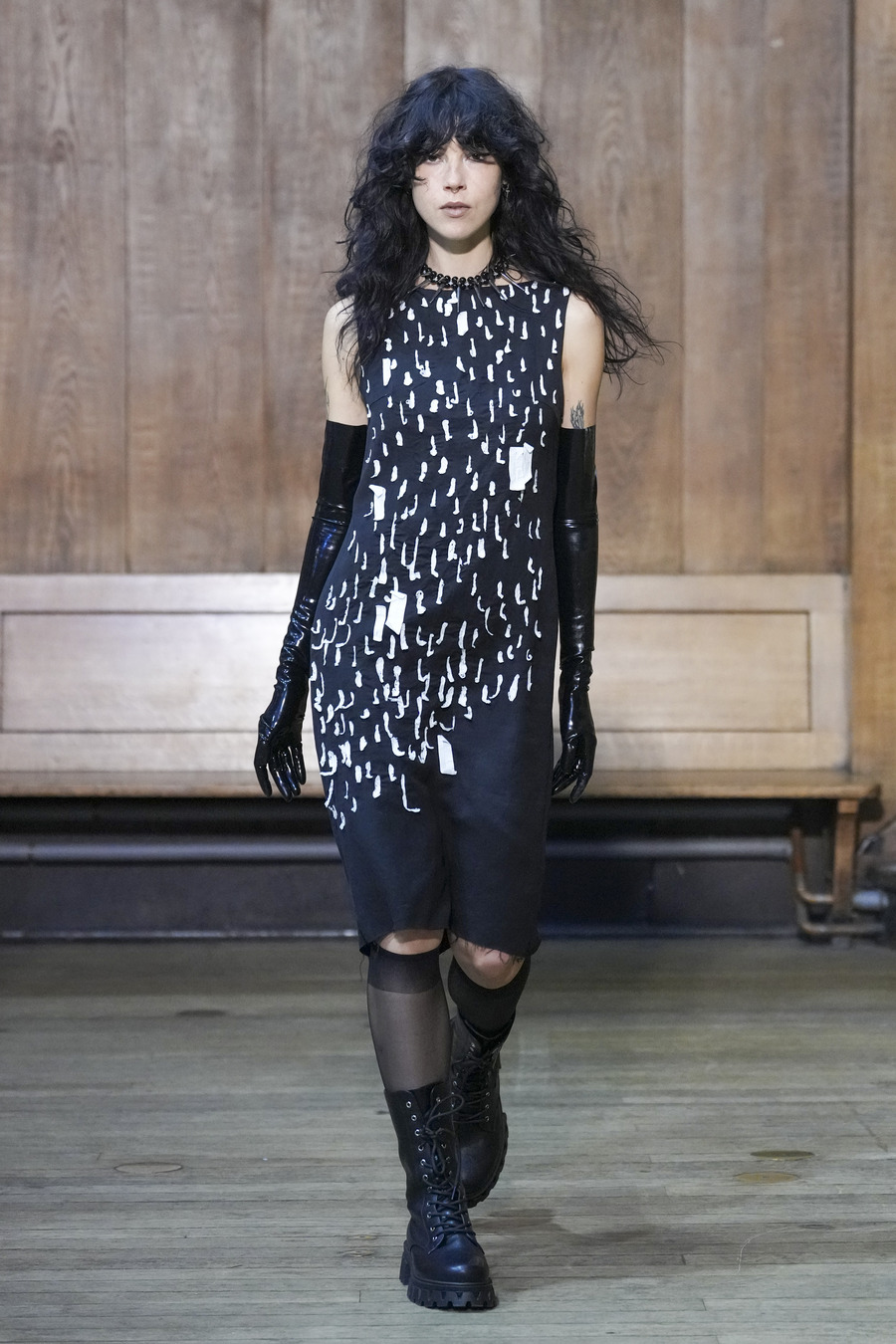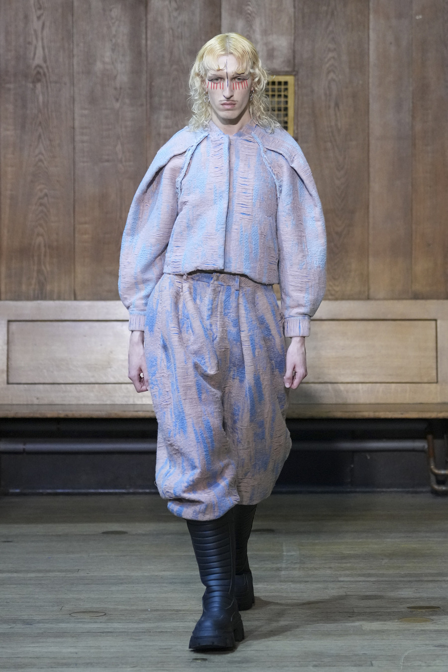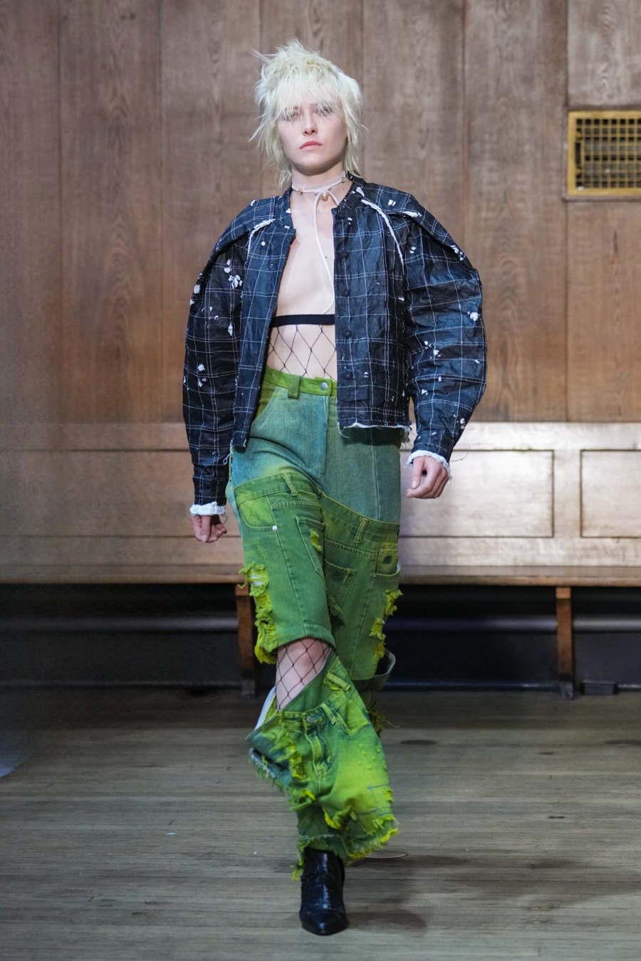 JENN LEE’s creative process? She literally crumpled up paper and let the wrinkles and shapes do the talking! Her designs came to life with unstructured silhouettes, funky geometric shapes, and brushstrokes that looked like they were applied with a sense of who cares, let’s have fun! Styled by Callum Smith, the collection still had JENN LEE’s signature deconstructed coolness, but this time with playful folds, exposed seams, and her iconic heart-shaped zippers. Structure, meet spontaneity.