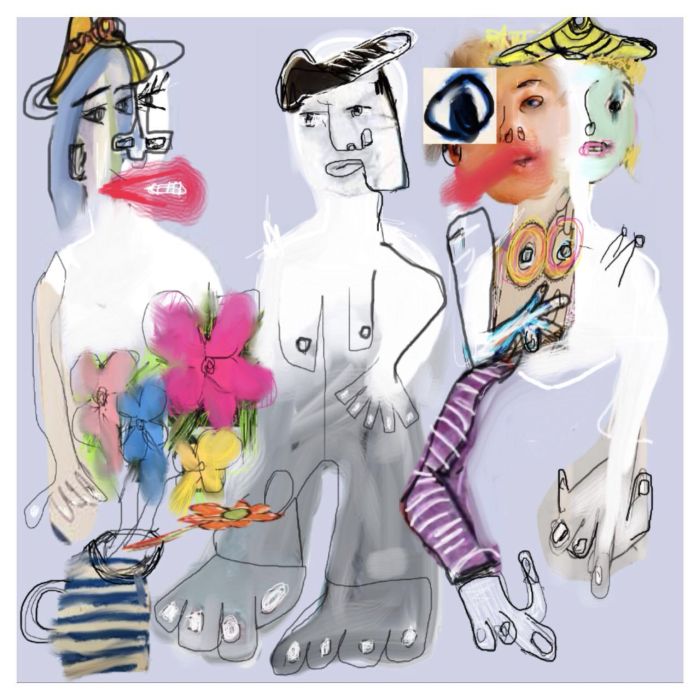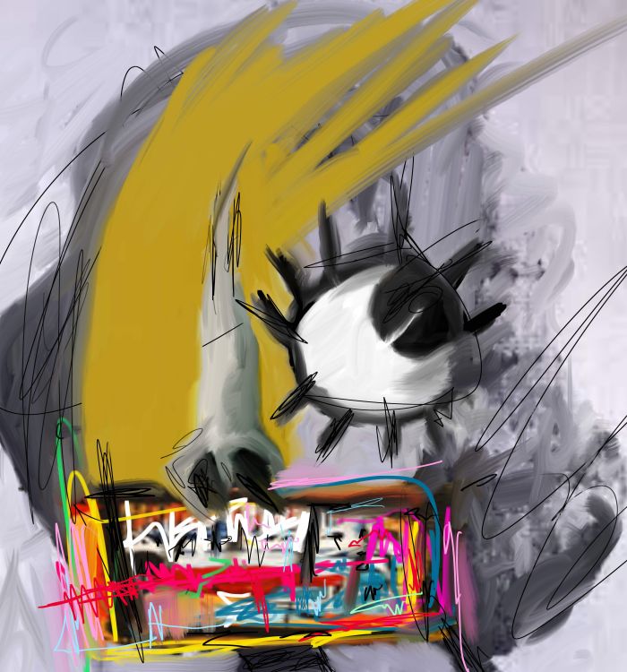 His works show Pop Culture Icons such as Andy Warhol’s Marylin and Disney characters, their figures disassembled and wildly reassembled. The compositions are often close ups, in the tradition of Andy Warhol’s Pop Portraits. The aggressiveness of the computer generated brush work adds up to the presence of International brands like Lacoste or Gucci who are cited in the works. The chaos of references is sometimes softened by the Photoshop blur.