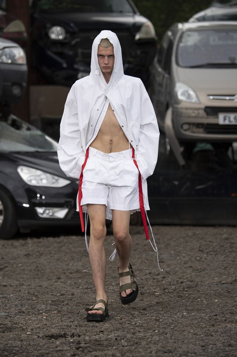 “This is a personal jubilee, a punk-inflected white flag of surrender, interspersed with crisp silk suits and long bridal trains, fine nanny corset knits, rich organza and summer weight knitwear. There are dainty kilts offset by chunky snakeskin patterned boots, white platforms and studded clogs, while figure-hugging mesh tops are cinched in at the waist by buckled leather belts.”