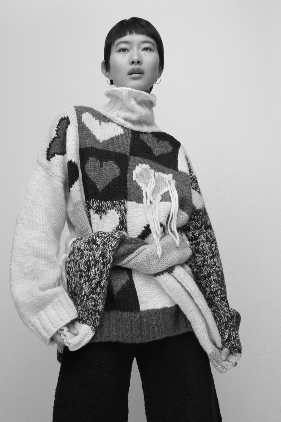 The designs are inspired by iconic JOSEPH TRICOT knitwear from the brand’s archive. The instarsia knit pieces originally released in 1991, have been reworked and updated. The designs feature patchwork hearts, handstitched using solid and mouline wool yarns in shades of black, ivory and grey; with one style including a single vibrant red rose, kept from an original design.