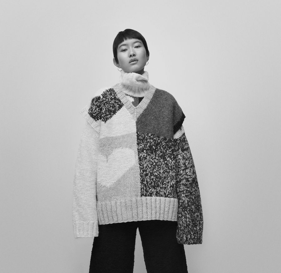 The designs are inspired by iconic JOSEPH TRICOT knitwear from the brand’s archive. The instarsia knit pieces originally released in 1991, have been reworked and updated. The designs feature patchwork hearts, handstitched using solid and mouline wool yarns in shades of black, ivory and grey; with one style including a single vibrant red rose, kept from an original design.