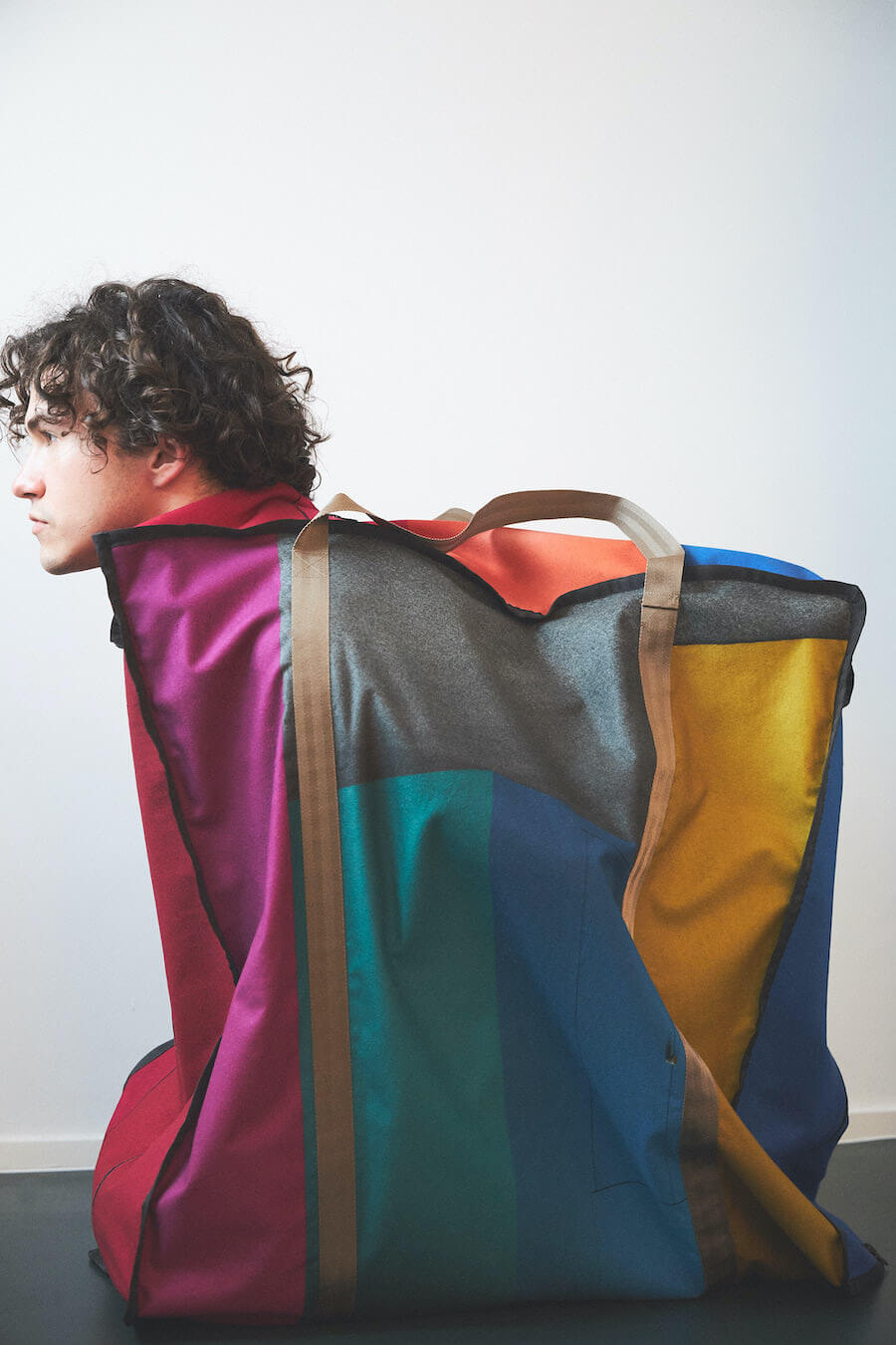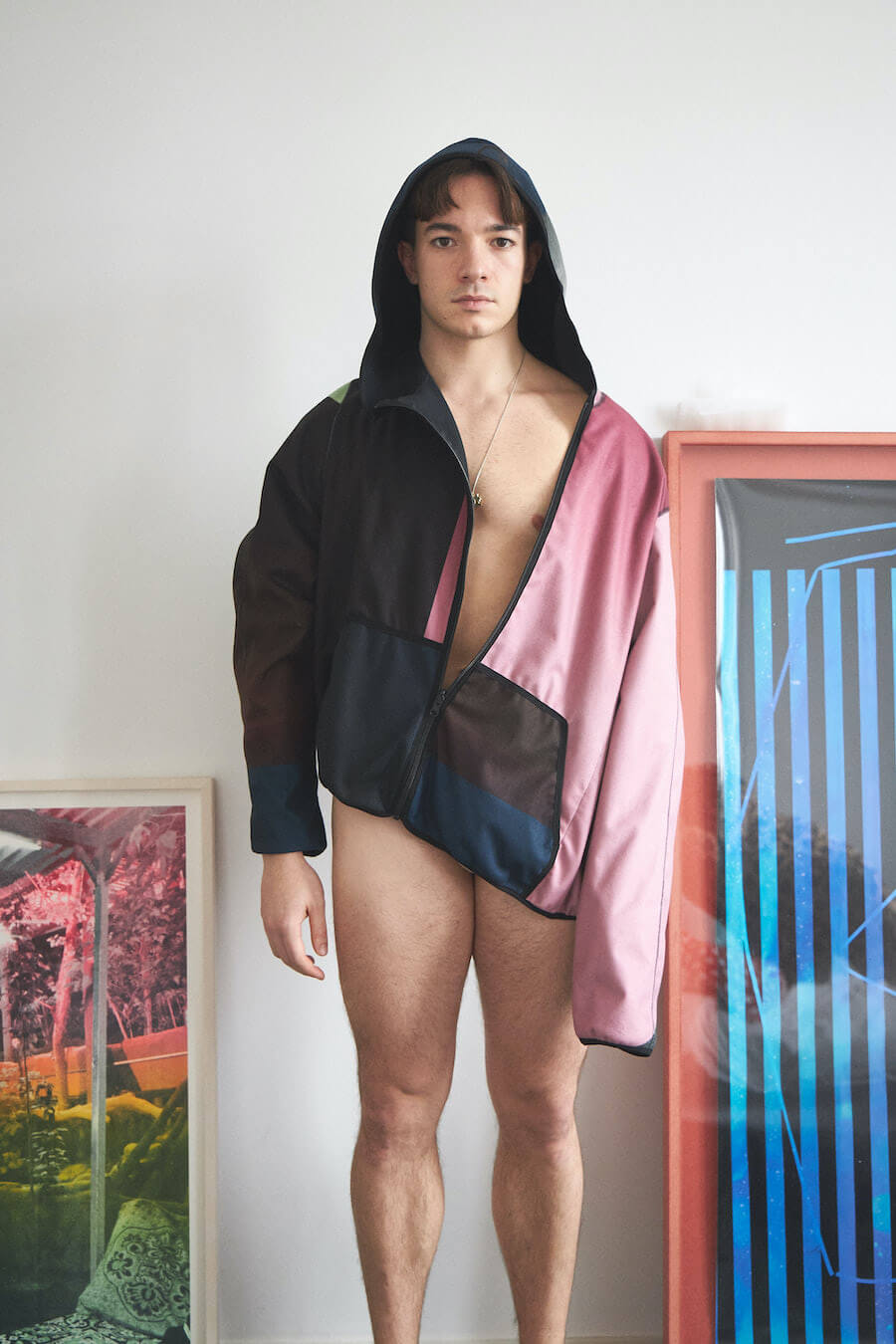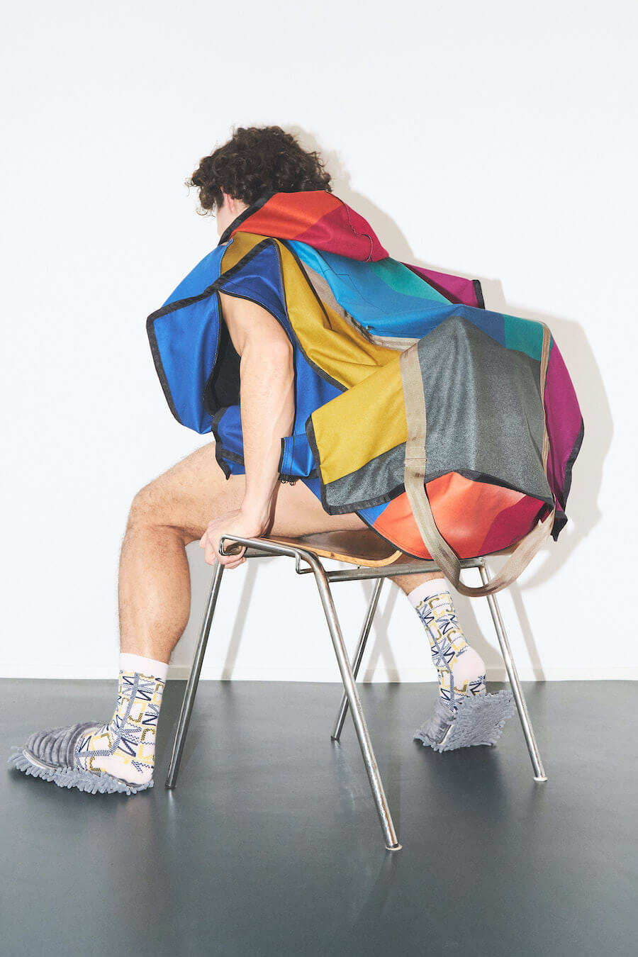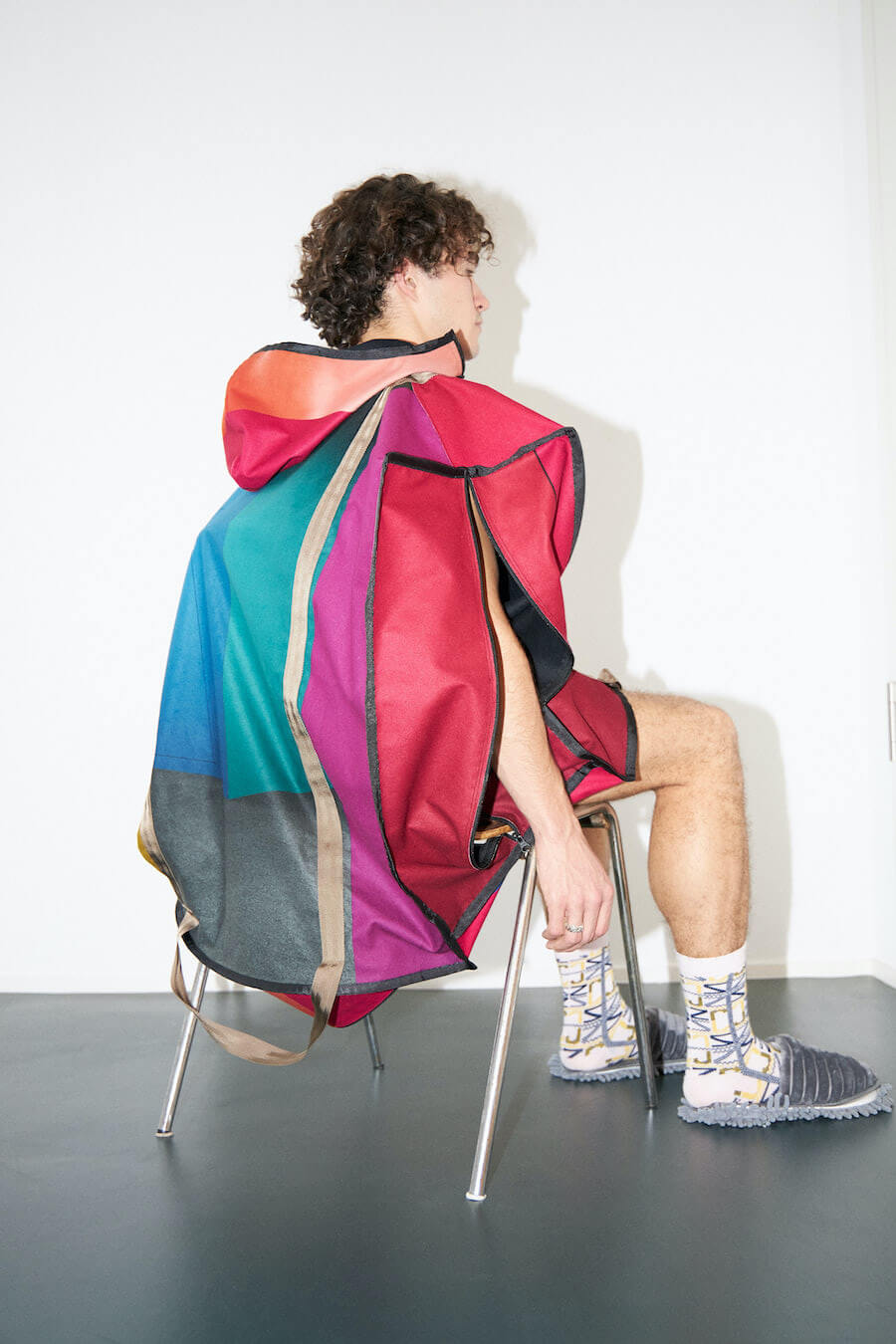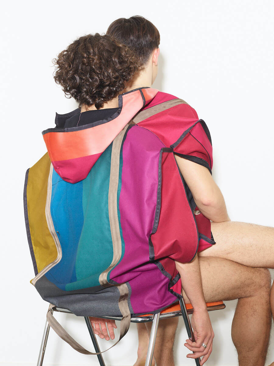 HARD2 – The Hardau development is a building complex in Zurich built between 1976 and 1978. It comprises a total of four high-rise buildings with a maximum height of 95.4 meters. They shape the city’s skyline to this day. Julian living on the 22nd floor, just one short elevator ride away from Shiranas home a few floors up, Hardau fueled all the inspiration for this collection. With Shirana’s colourful room–installations as a core to this collection, we entered a new area of architectural clothing, where the body wrapped in textile gains the dimension of a room.