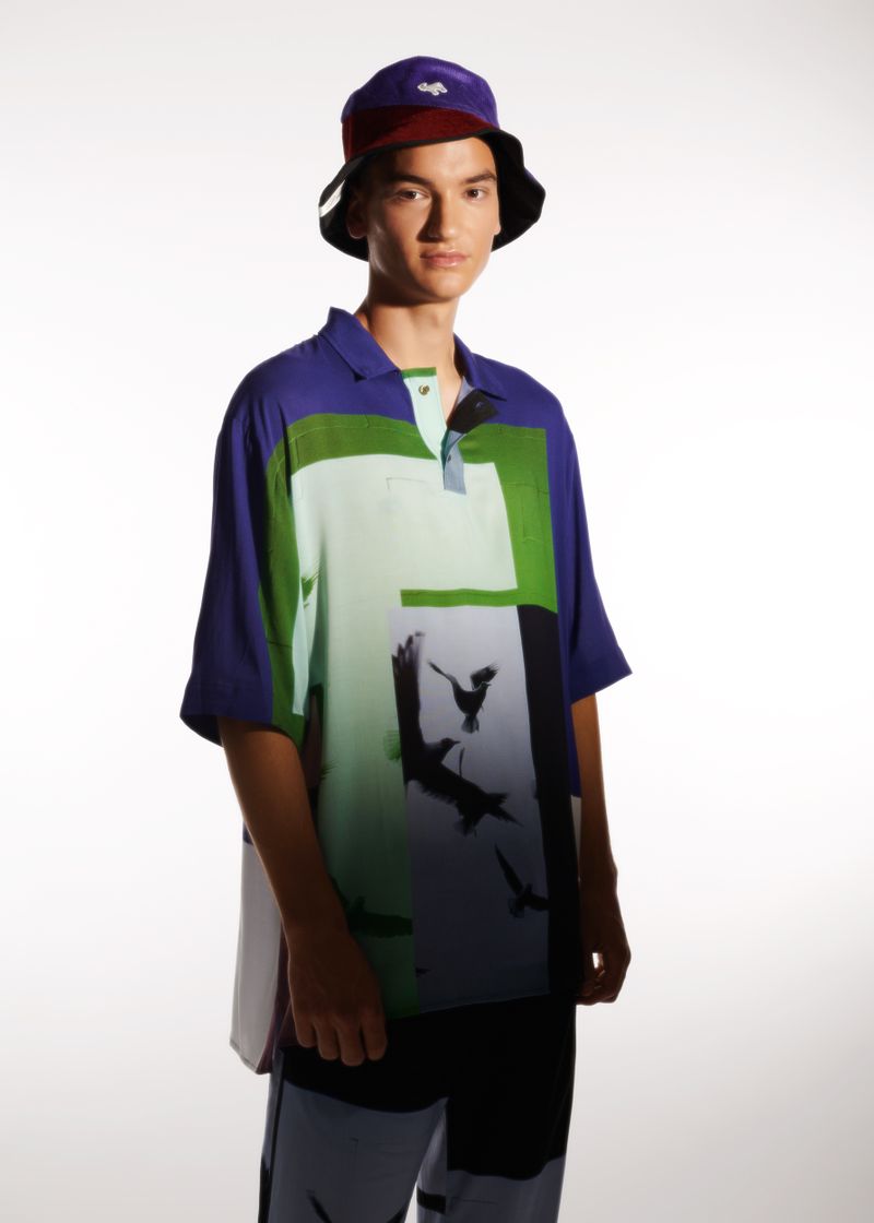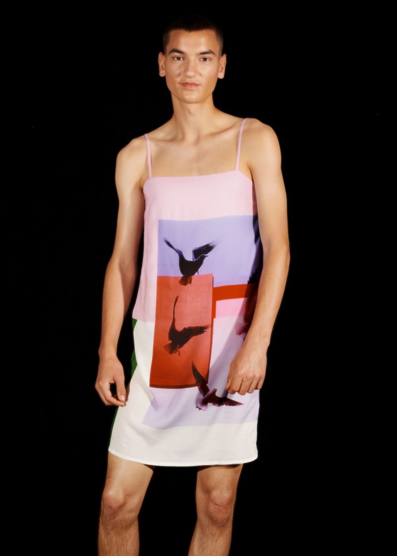 The seagulls crossing path in front of the balcony window, with a sunny Zürich in the background… SHIRANA SHAHBAZI’s work printed on a summery light viscose fabrics. A focuses on colors and shadows.