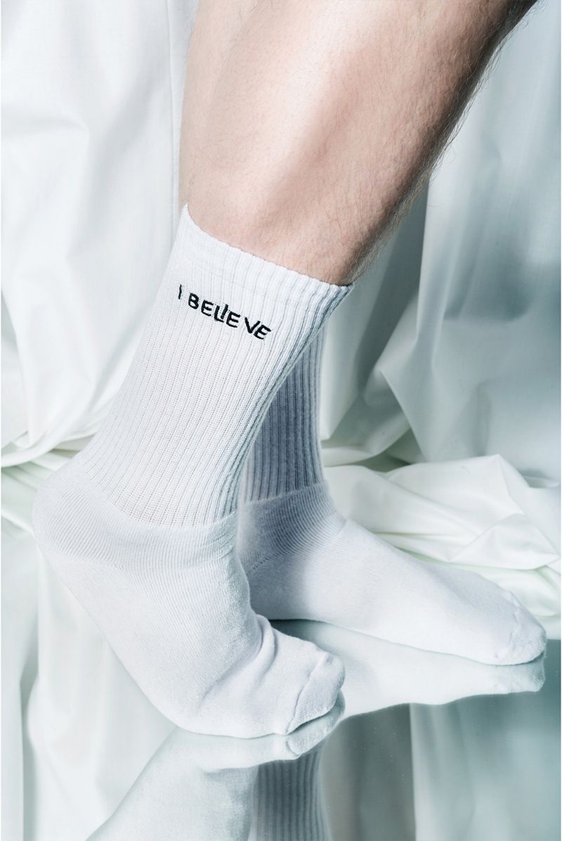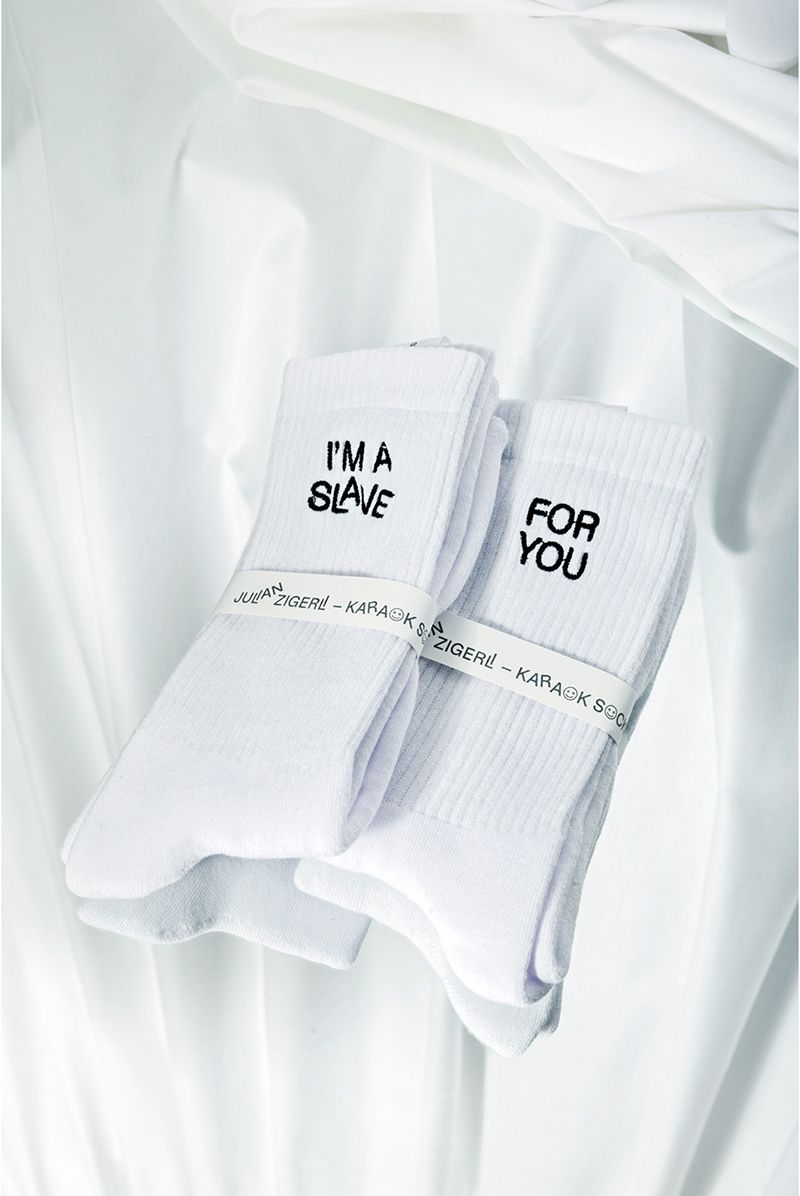 Designer Julian Zigerli presents a new collection of white sport socks featuring some of his favourite Karaoke lyrics embroidered. Iconic songs to sing along!