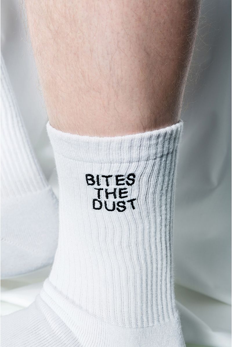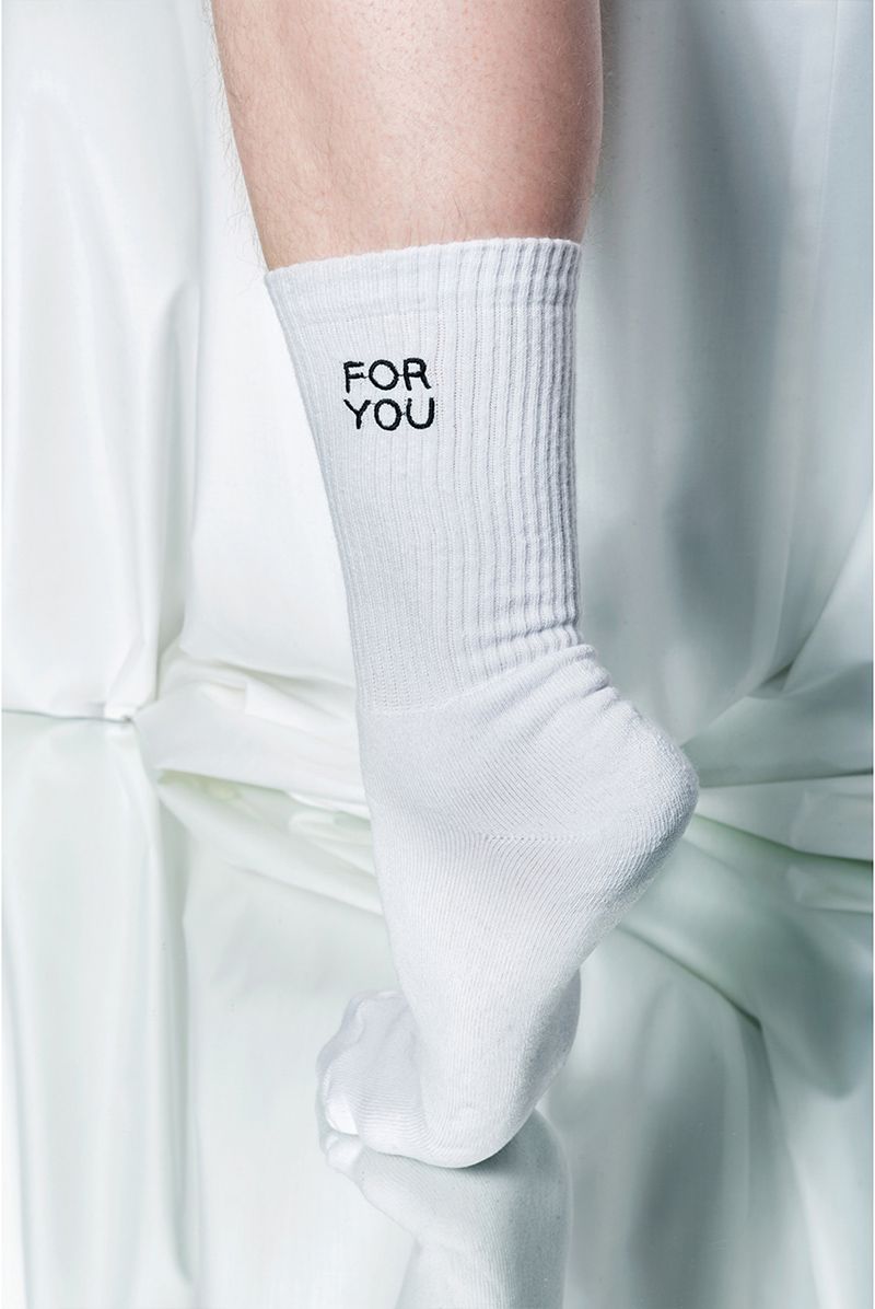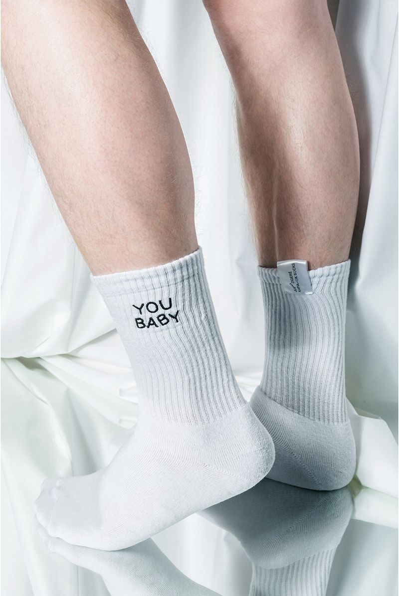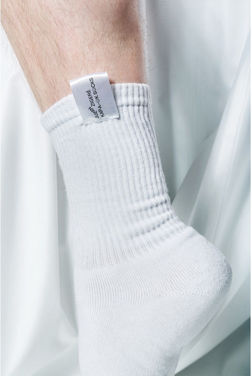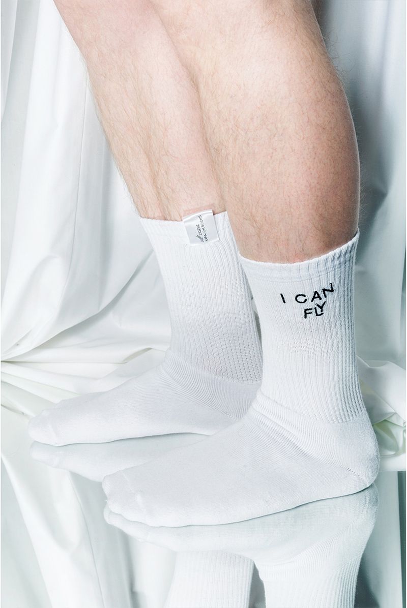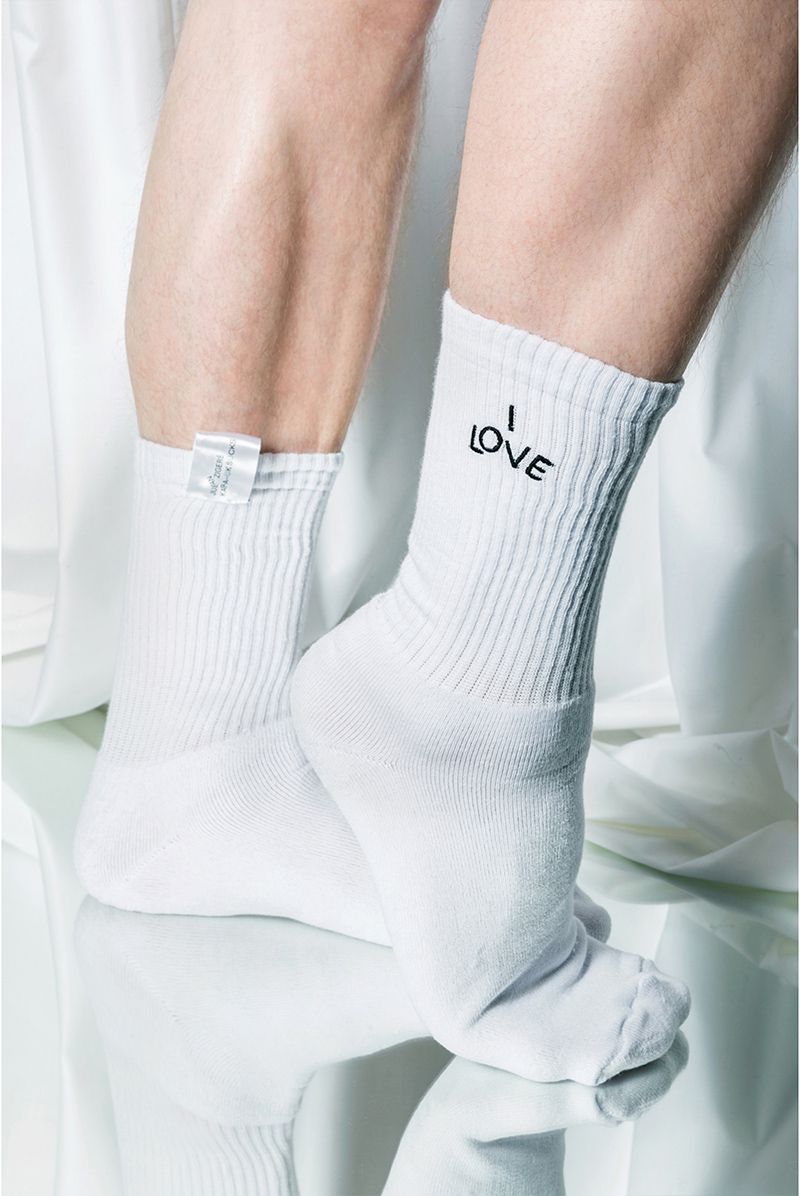 Designer Julian Zigerli presents a new collection of white sport socks featuring some of his favourite Karaoke lyrics embroidered. Iconic songs to sing along!