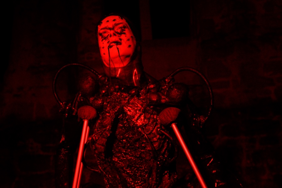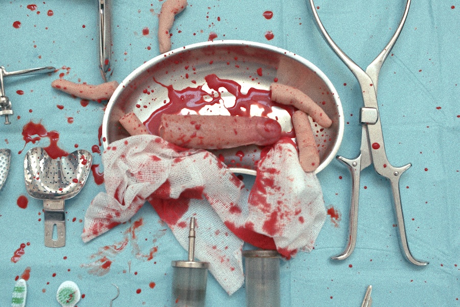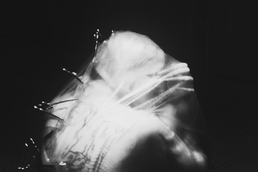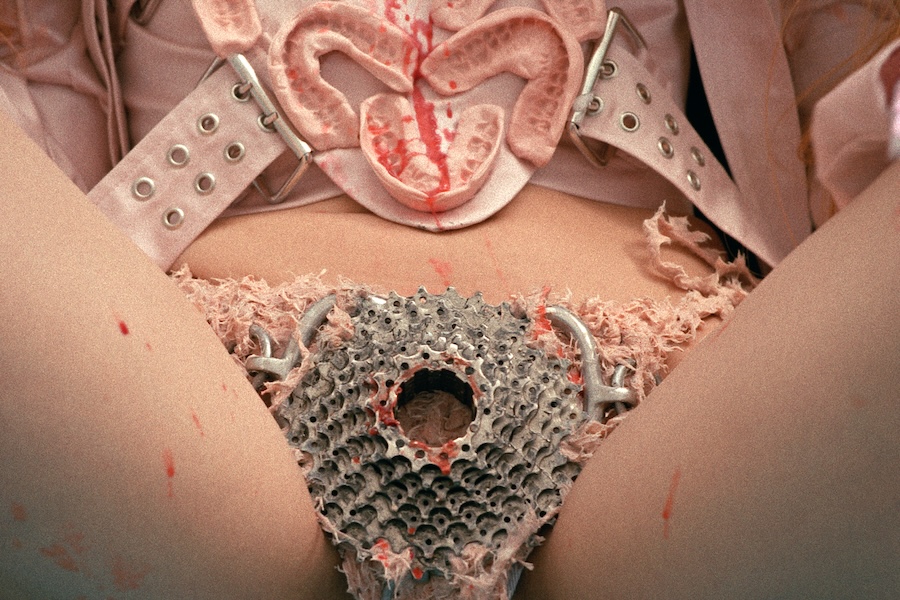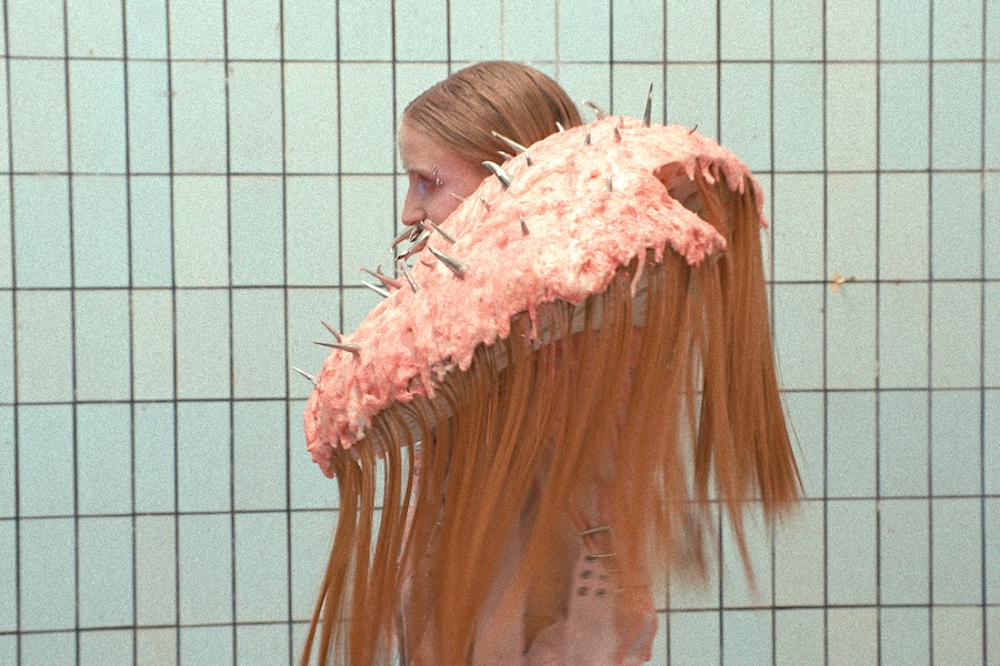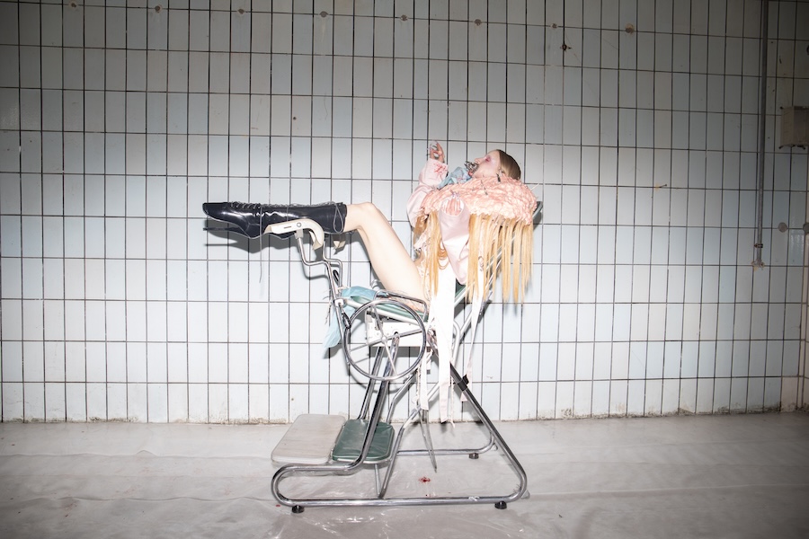 Material and texture have always been a central part of my creative process, and I am intrigued by unconventional materialities that don’t usually appear in fashion. Drawing from the realm of special effects and prop-making felt only natural, seeing as I was creating a collection for a horror film. Bodycasting, silicone moulds and latex shaped the corporeal design language of the collection: Additional extremities created by casting real body parts, reliefs and adornments that were attached and coated over to make them appear as part of the body, under the skin. Cold, hard metal elements digging into soft, fleshy textures, creating almost graphic, surgical, invasive imagery. Everything skin-adjacent, liquid, dripping, wet, glossy surfaces, tissue-like materials, reaching from membranes, eggshells, reptile skin, body hair, bloodied muscle fibres and tearing skin to foreign, alienesque or insectoid armour. I also worked with medical materials – surgical tarps, gauze, bandages, opening up the world of laboratories and medicine, often places of patriarchal control and feminine fears.