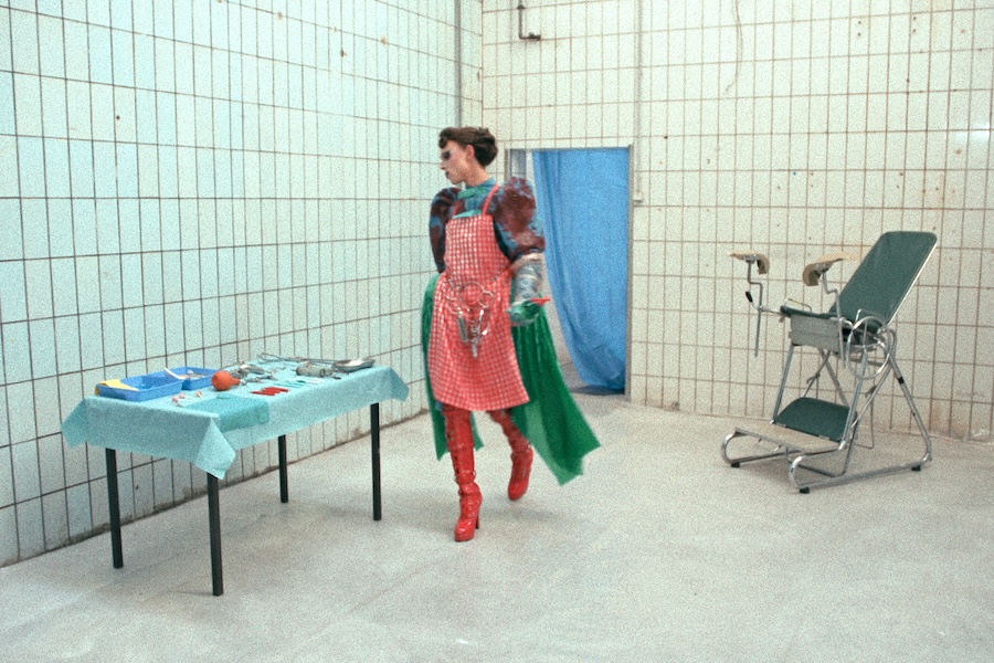 Delving deeper into horror theory, I discovered Barbara Creed, the theorist who first dissected the horror film from a feminist perspective, shaping the term “Monstrous Feminine”. She assigned archetypes, characters or concepts that frequently reappear in horror, such as “Vagina Dentata” and the “Archaic Mother”. From there, I chose the archetypes that spoke to me the most and, together with An, built my own ones as well. It was more a development of characters than looks, really. We wrote character sheets, scripts, and made storyboards, with the film in mind from the very beginning. Simultaneously, I started work on the collection. I have always liked to play with expectations, feeding into stereotypes only to consciously dissolve them. That is why for “The Feminine Urge” I chose to introduce the known, tame and submissive woman, to then distort her into caricature, letting her become dominant, distorted and grotesque. Fashion was the perfect medium for that, offering iconic silhouettes and garments such as the wedding dress, smocks, aprons, lingerie or the straightjacket, that are intrinsically tied to patriarchy, evoking associations of domesticated, suppressed femininity.
