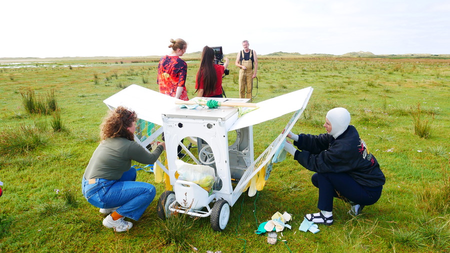 Hanneke: I don’t know if this is interesting, but we shot some scenes on a beach. Because the space was so big and there was a lot of wind it was impossible for us to understand each other. So we brought some walkie-talkies with us to talk with the actor inside the washing machine. The actor clipped the walkie-talkie on the front panel of the machine and it just looked really natural, as if it belonged with the monster. Also, the sound of the walkie-talkie alarm is recognizable. In the editing room, we decided to make the walkie-talkie part of the film. It became the way in which Sock Monster communicated with the other washing machine.