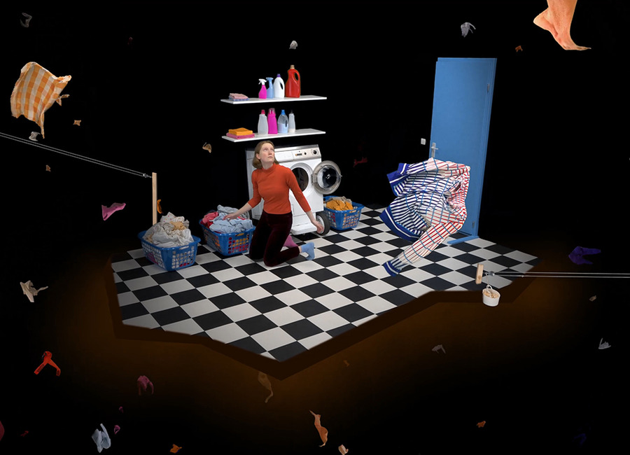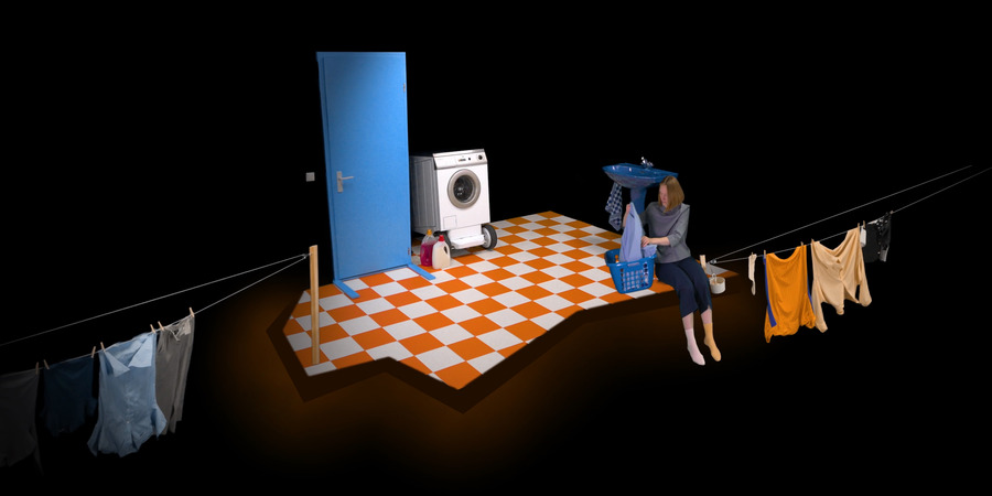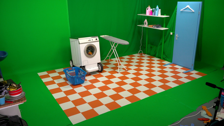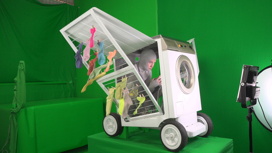 ‘Sock Monster’ takes place in a dreamlike world of laundry rooms. A network of washing lines connects the rooms to one another. The ritual of washing and drying alternates until the human being leaves the room. Then the washing machine comes to life. One has a hidden agenda. Single socks are its object of trade.