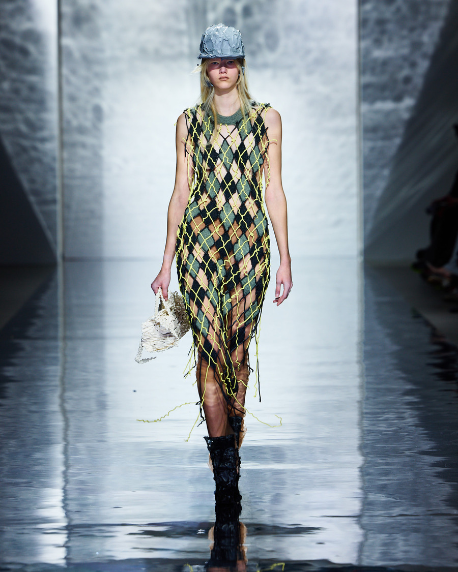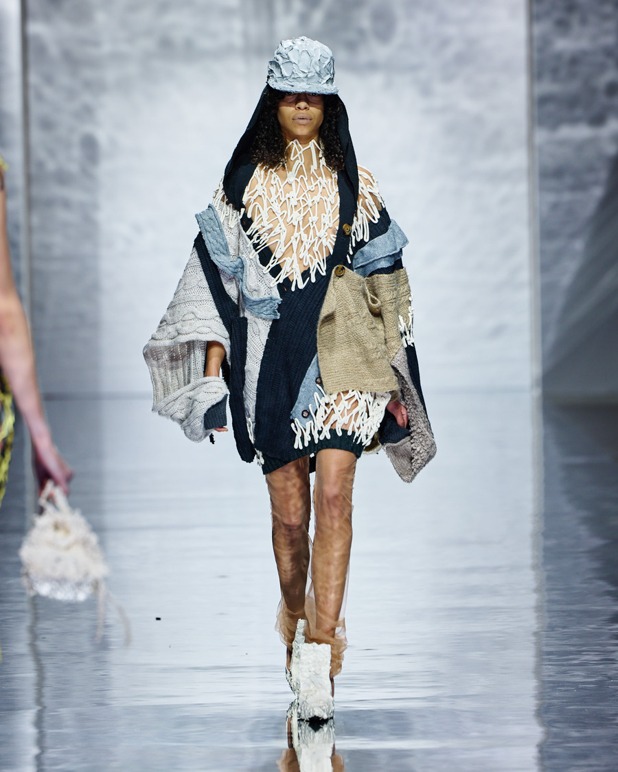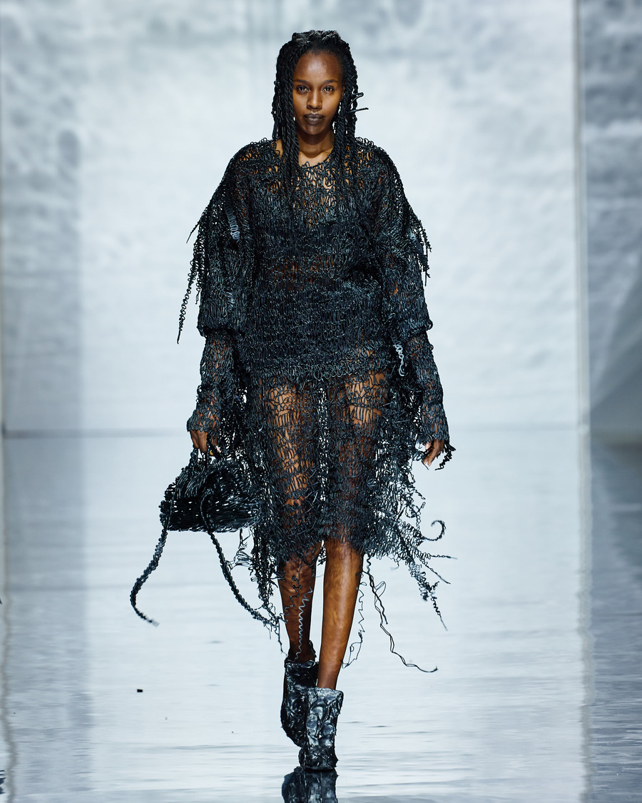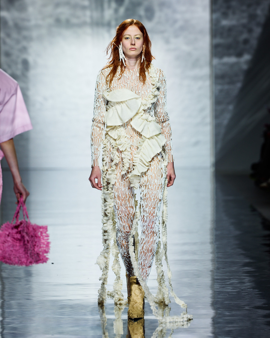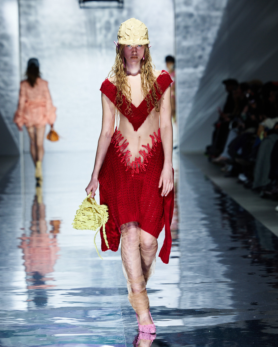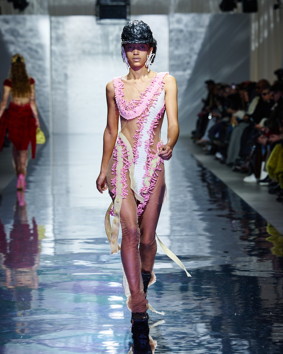 This collection takes us back to the roots of artisanal crafting, showcasing an impressive array of dresses that defy convention—stitched not by a thread but bound together with chic latex accents. By deconstructing vintage preppy knitwear, Kucharska elevates ordinary pieces into whimsical showstoppers, inviting us to escape into a world of better possibilities.