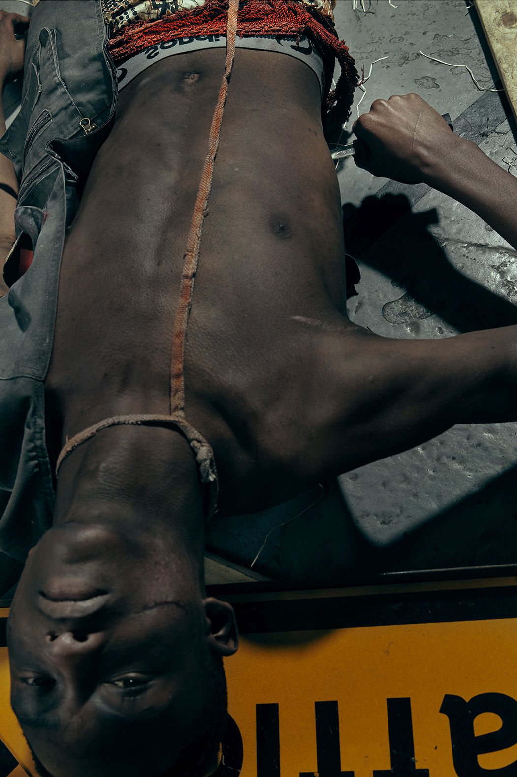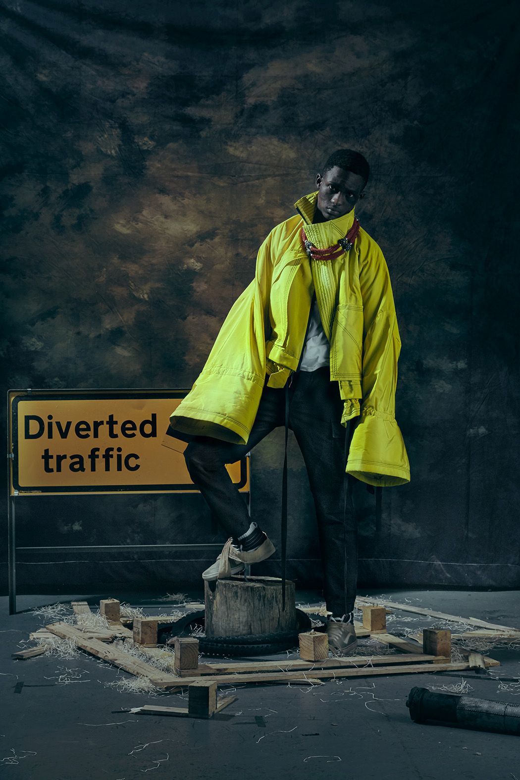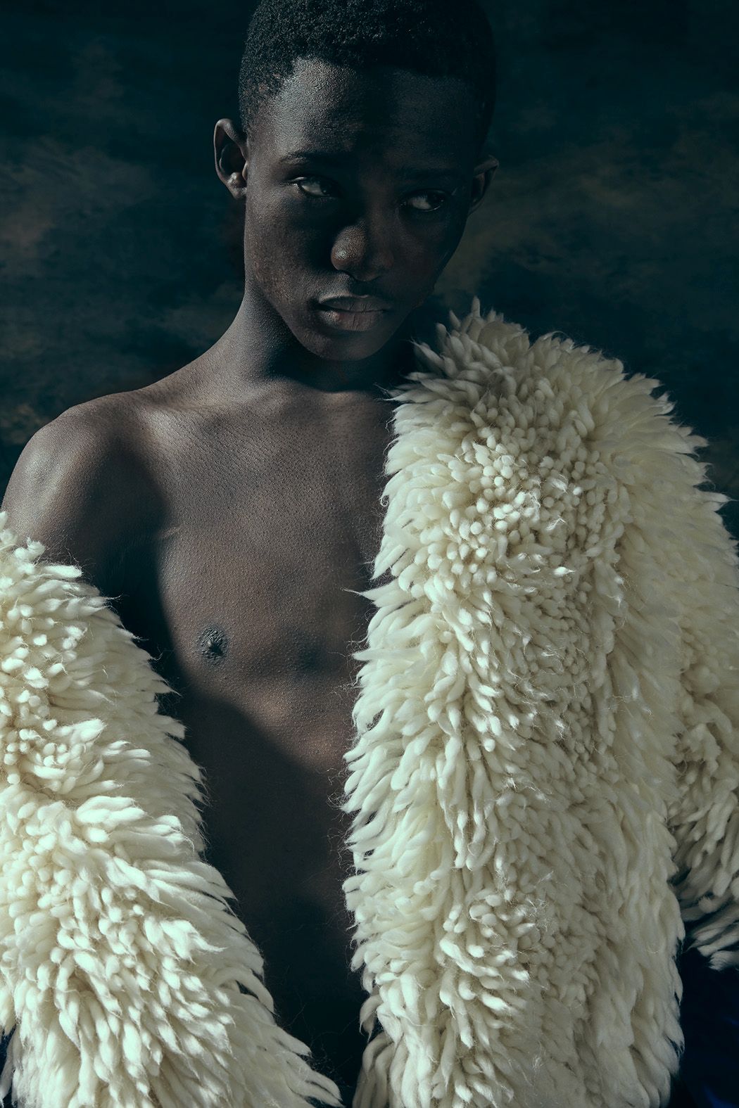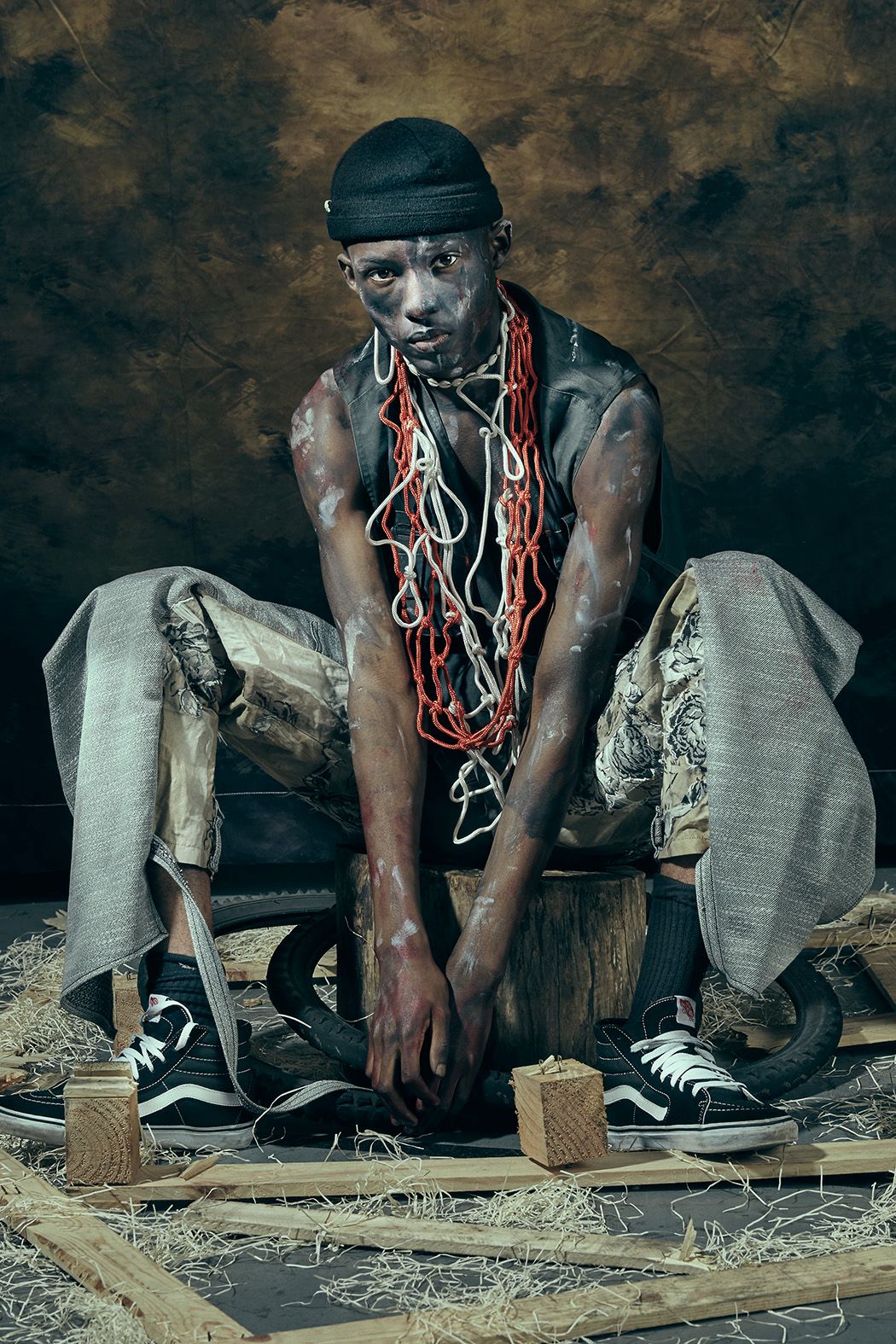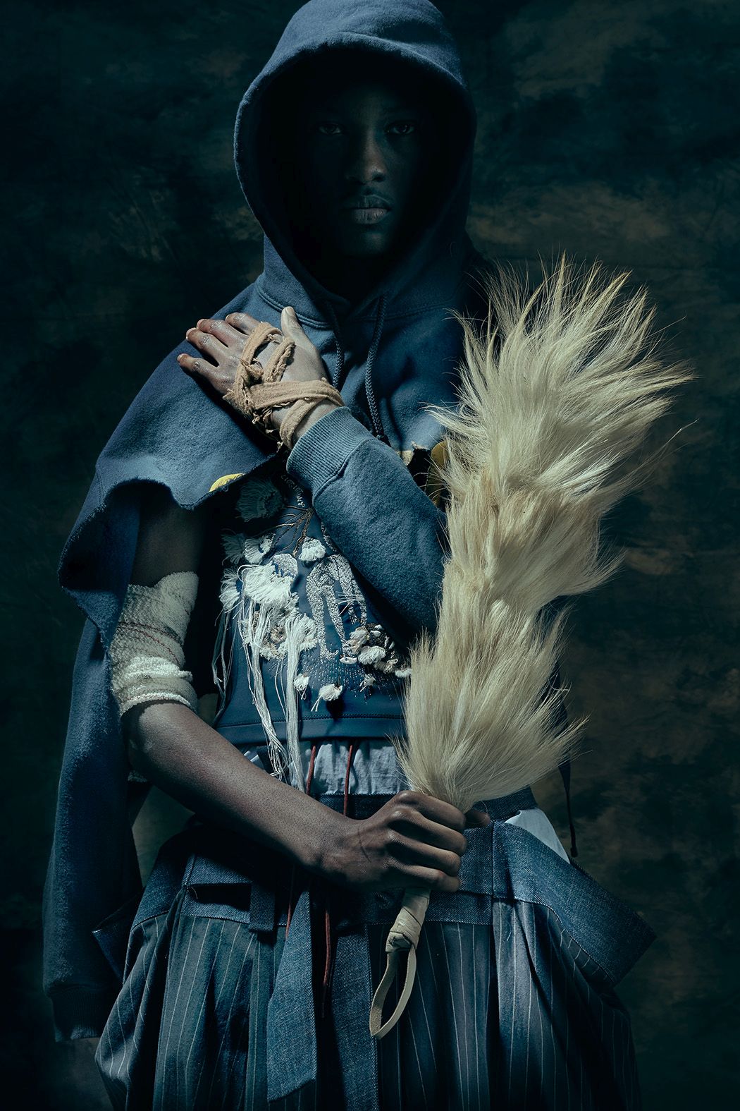 A KALTBLUT exclusive menswear editorial. Photography by Peter Warrick. Styling and set design by Jeremy Mbu. Model is Rabbi Kaninda signed to D1 Models. Make-up by Agata Porszke. “Inspired by the Grayson Perry’s sculpture of the same name and the Van Dyck equestrian portrait of King Charles I; we wanted to explore vulnerability in masculinity through the prism of gang culture in the UK with specific cross references to African culture.” says Peter Warrick.