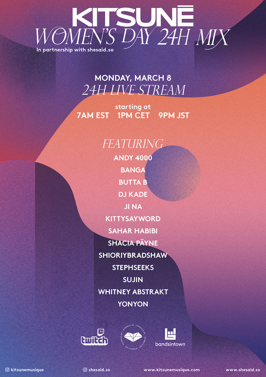 “shesaid.so is proud to partner with Kitsuné Musique to celebrate International Women’s Day with what we both know best: music. What’s special about our collaboration in 2021 is how diverse and global our guest artists are, in true reflection of both our communities. We are very excited to receive the support of BandsinTown who, via their Twitch channel, will enable us to reach an even wider audience at a time when physical gatherings & supporting touring artists is still not possible. With the pandemic disproportionately affecting women and gender minorities in our business, we hope that the funds we raise with our partnership will provide much-needed support to the shesaid.so community worldwide.” – Andreea Magdalina, Founder shesaid.so.