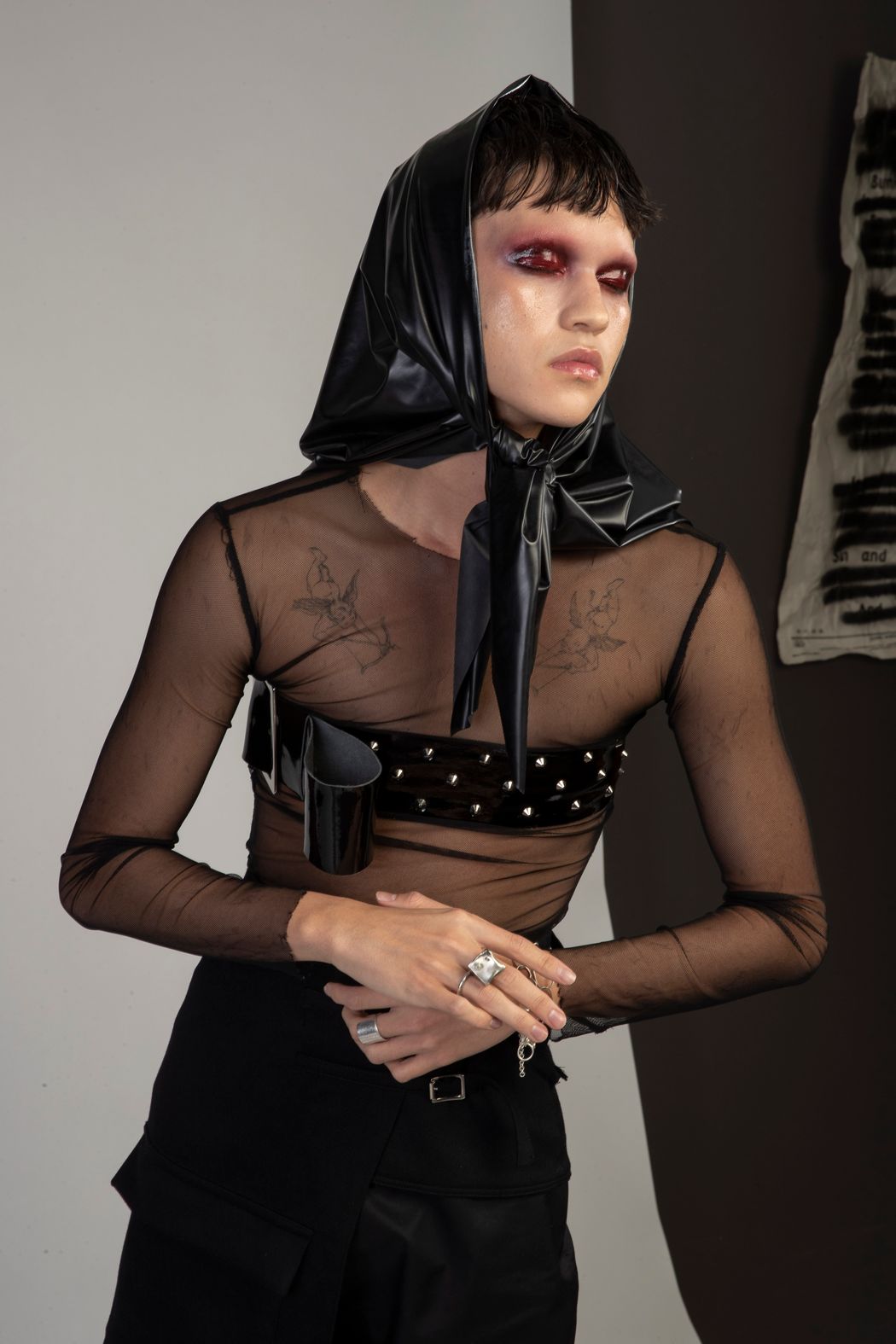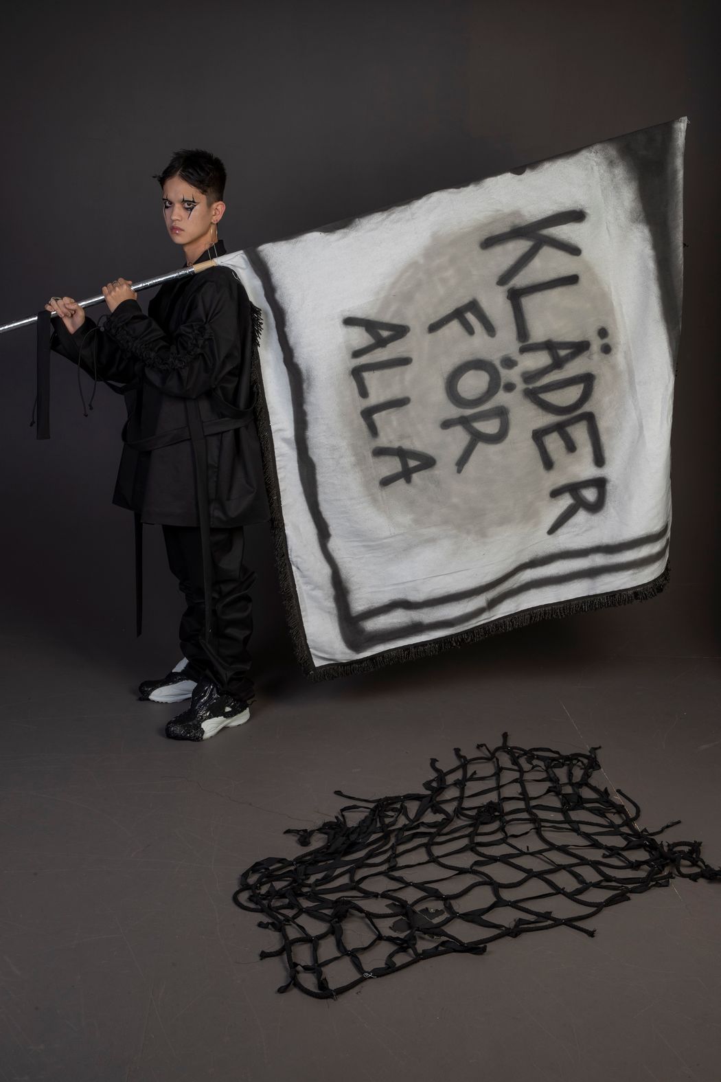 “Kläder För Alla” a found-phrase captured through the window of a Stockholm thrift shop, hints to the designer’s heritage language of Swedish. “Clothing for all” is demanded. The model protests, a sense of inequity is felt in their vulnerable gaze, yet their presence is strong and unforgiving. Will anyone listen to their demands?