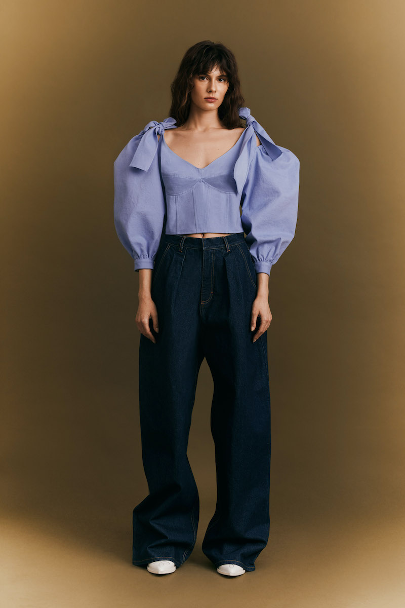 Additionally, in Fall-Winter 2021 Ksenia Schnaider continues to explore the intersection between sporty and delicate – this time turning to baggy 90’s hip-hop clothes and seeing how they fit together with incredibly feminine voluminous sleeves and ribbons.