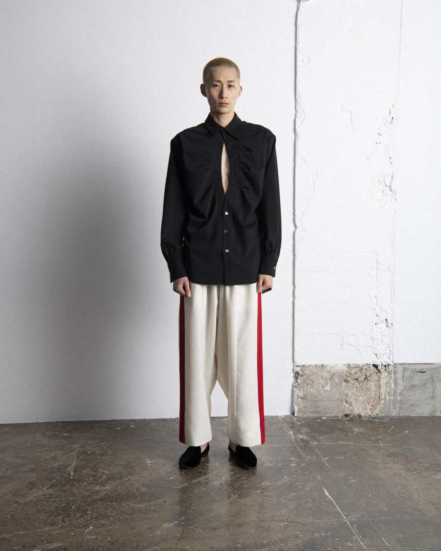 Notably, this season sees a daring shift in material exploration. Wool gabardine takes the spotlight, celebrated for its warmth and versatility, while the ancestral craft of àdìrẹ — the traditional Yoruba tie-and-dye technique — remains a crucial element. Thompson creatively reinterprets àdìrẹ, ingeniously infusing contemporary relevance into this age-old craft. The innovative use of post-àdìrẹ transcends mere dyeing; it embodies storytelling through fabric, illustrating intricate parallels between traditional African symbolism and the nuanced codes of queer communication.