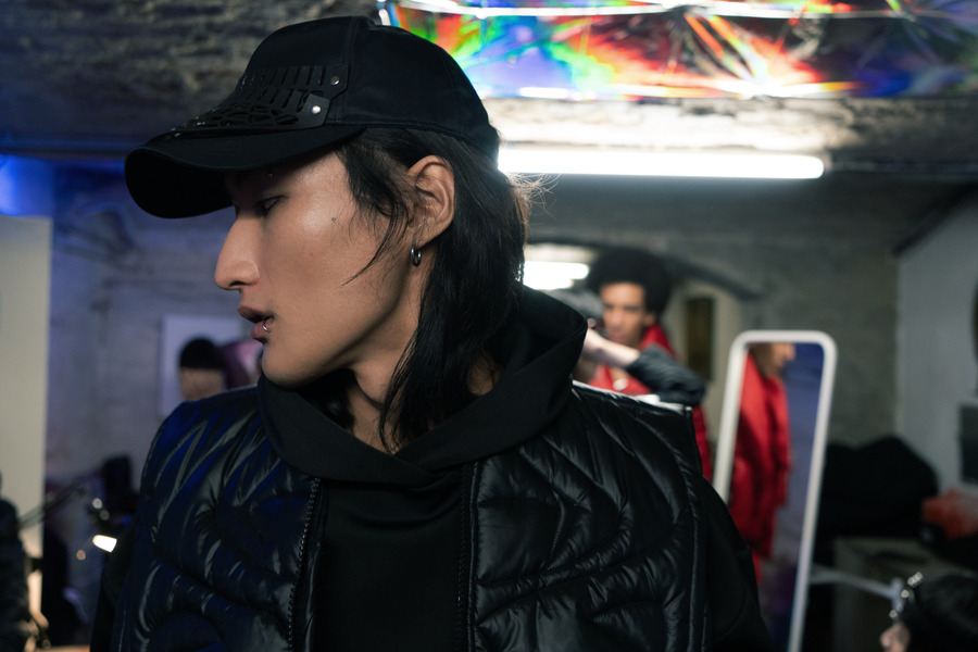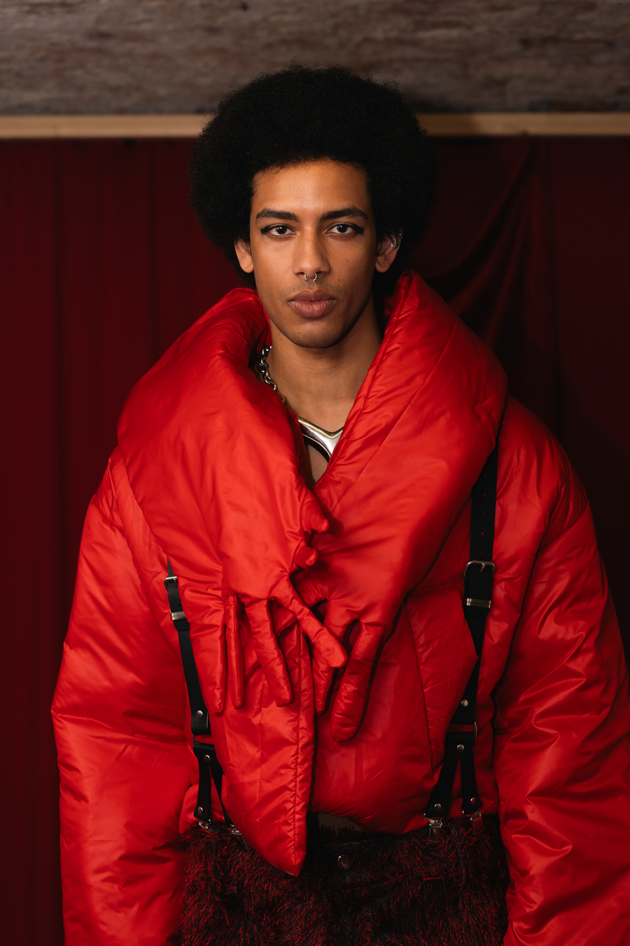 At the core of Laramz’s collection lay the irony of AI-driven creativity. While algorithms may generate pristine visuals, Laramz boldly embraced the beauty of the imperfect. Surreal proportions and whimsical extensions—think oversized hands sporting six fingers—served as clever metaphors for digital glitches, inviting the audience to question the essence of humanity within a tech-driven world. The silhouettes danced between the organic and the mechanical, with unisex designs adorned with oversized hoods and reflective fabrics. Electric neons and deep blacks punctuated the collection, pulsating techno beats transforming the venue into an ethereal dystopian club.