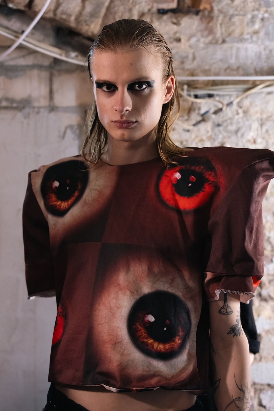 Within this avant-garde staging, Laramz posed existential musings: Where does humanity end, and where does the machine begin? The answers were nestled in the details—from deliberate asymmetries to digitally warped prints, every aspect was an occasion for introspection. The square-shaped eyes featured prominently on T-shirts and worn by some models stood as a cheeky nod to our culture of excessive screen time.