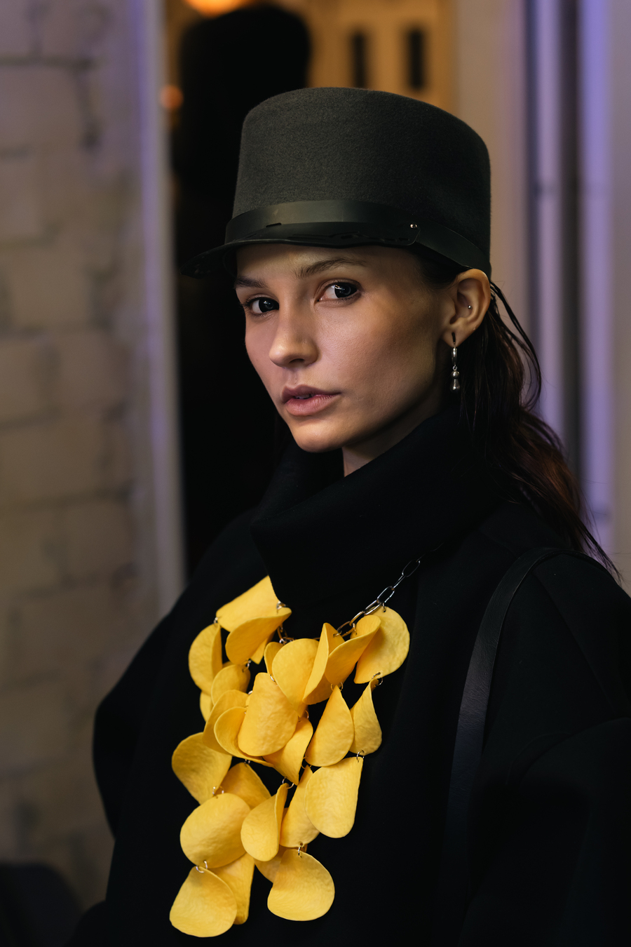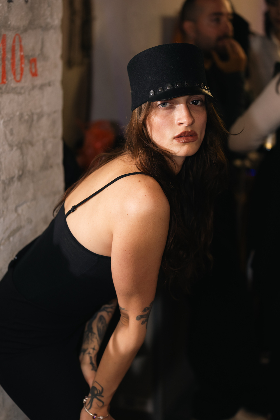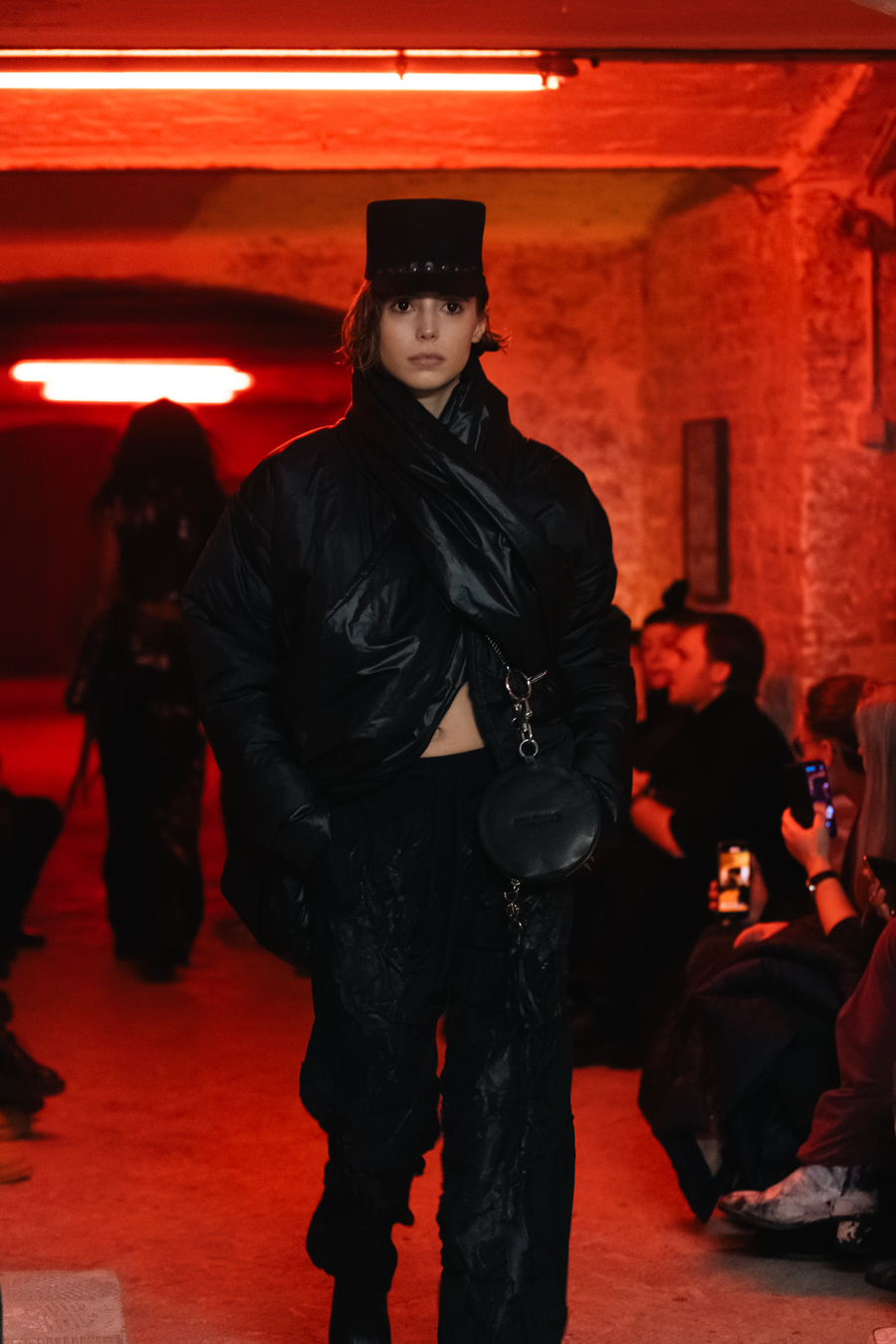 Models embodying the vibrant essence of Berlin’s underground scene graced the runway, many also being designers or DJs themselves. They showcased innovative footwear from Trippen, a label renowned for its avant-garde aesthetic. With unconventional sole shapes and exquisitely cut boots, Trippen effortlessly created a fusion of fashion, function, and art. Further amplifying this creative synergy, House of Mazard’s eclectic hats made a striking statement.