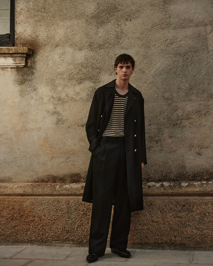 The colour palette is a serene gradient extending from timeless black and tobacco to navy blue, sage green, and hints of antique pink and wisteria. Fabrics, sometimes treated with unique washes and finishes, impart a tactile quality that encourages dynamic outfit compositions.