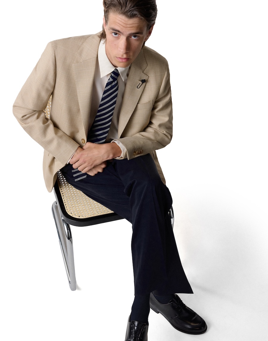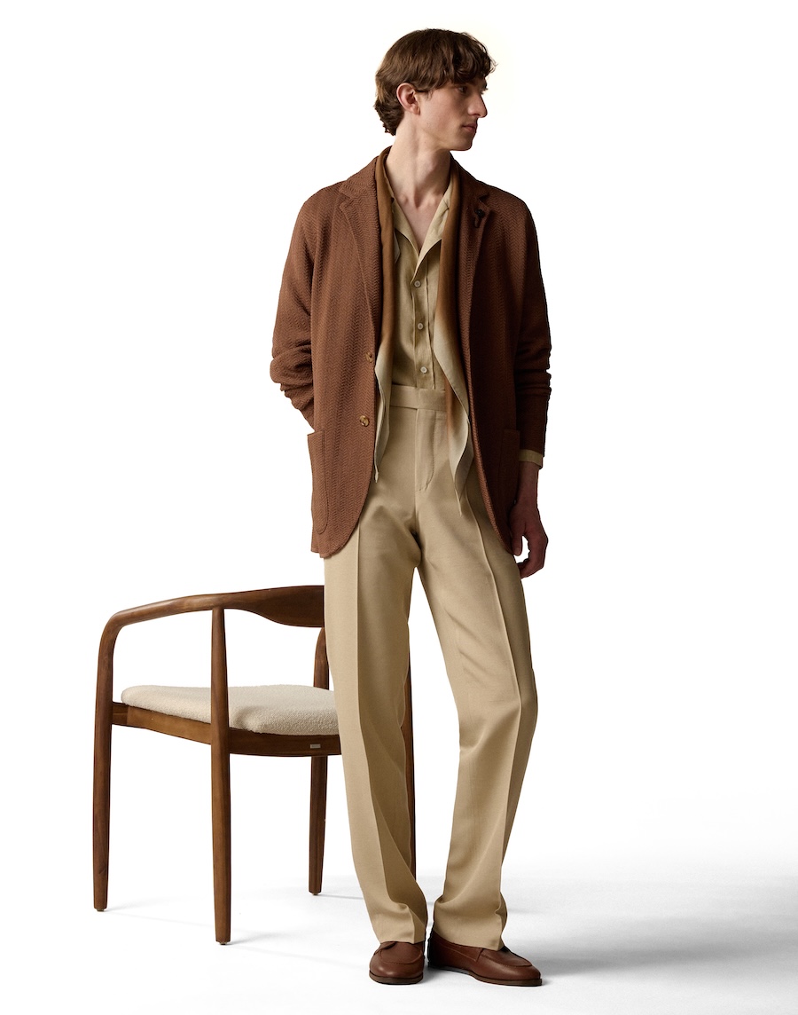 Silhouettes within Nativa celebrate a return to purity, blending refined structures with relaxed silhouettes that eschew excess. The collection is anchored by impeccable blazers—both single and double-breasted—as well as trench coats, cardigans, and chic safari jackets. A standout piece, the tuxedo with shawl lapels, reclaims vintage refinement with its striking black piping, proving that elegance never truly fades. Accessories, handcrafted to perfection, reflect a legacy of artisanal precision; from sophisticated footwear to understated belts, each piece carries a story.