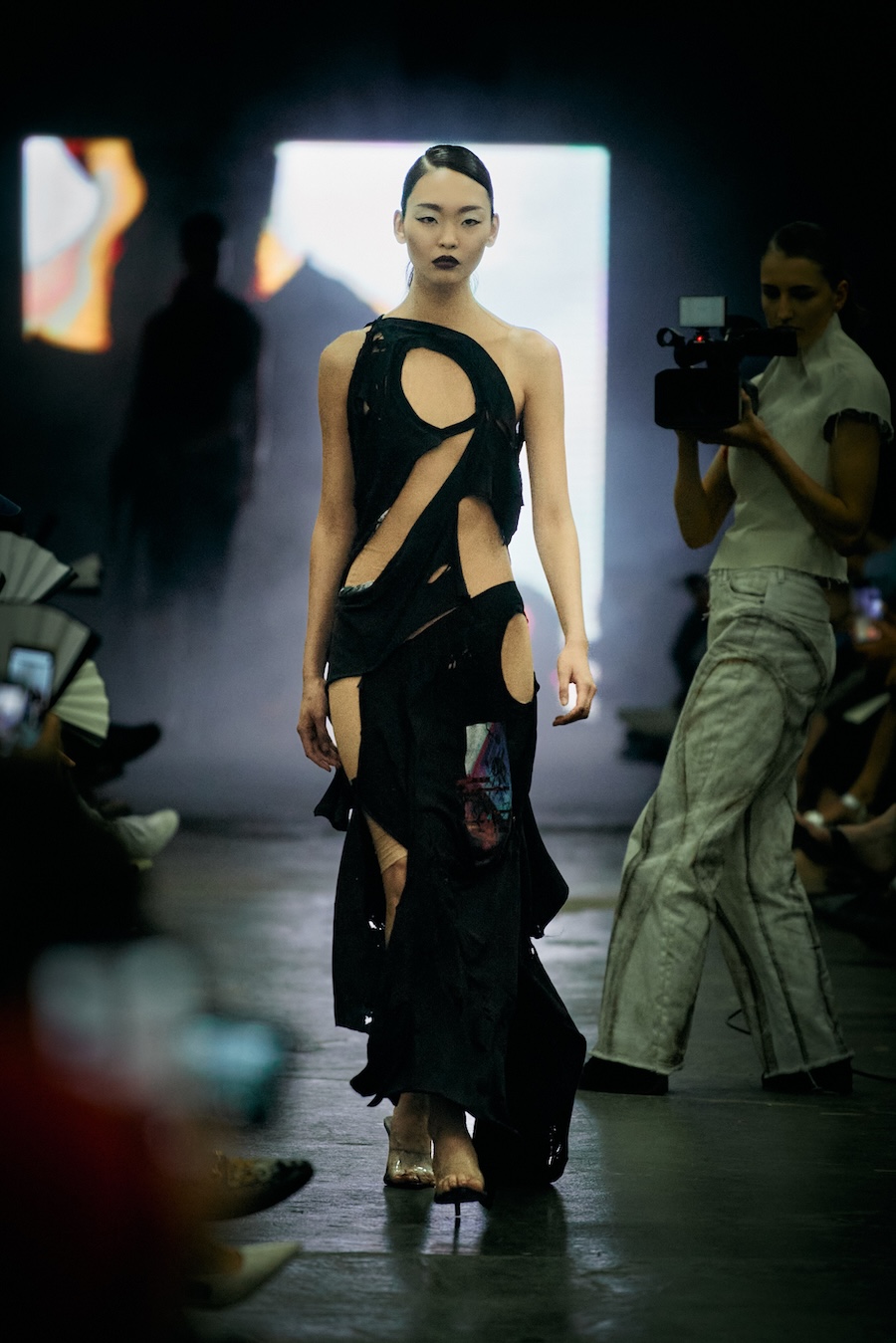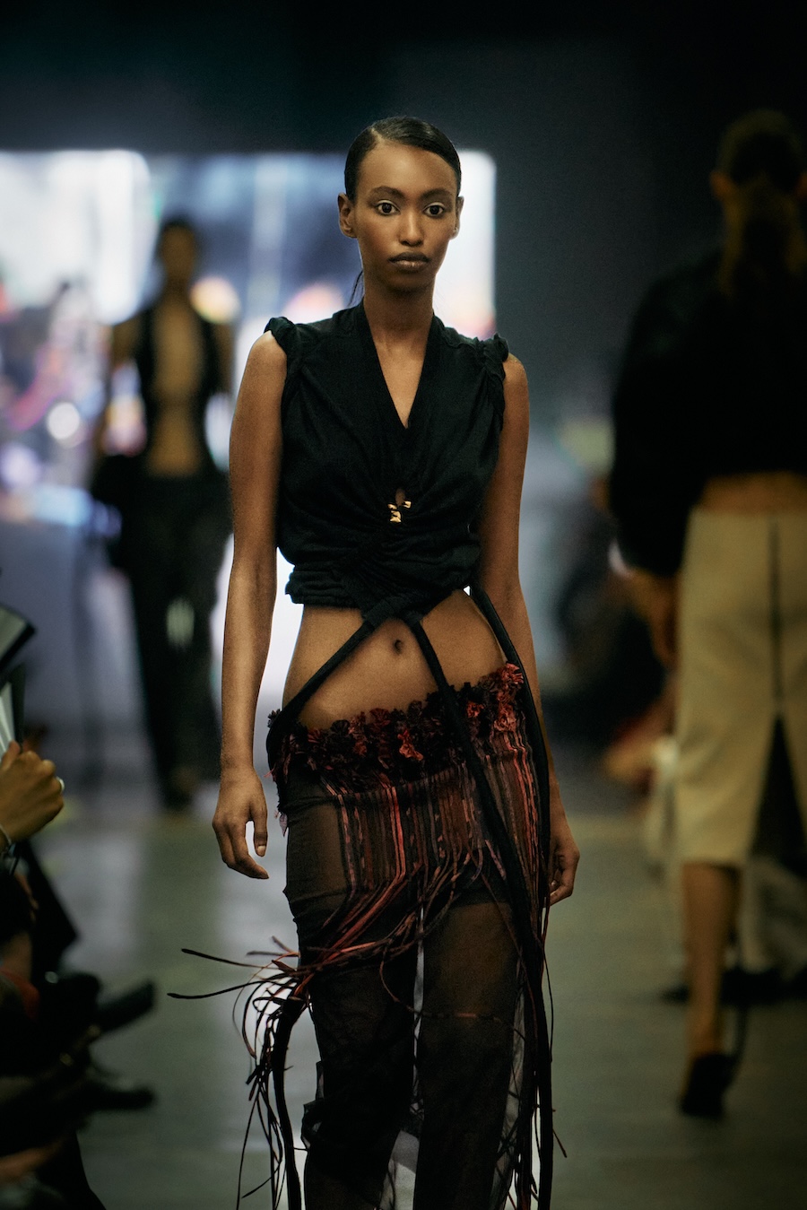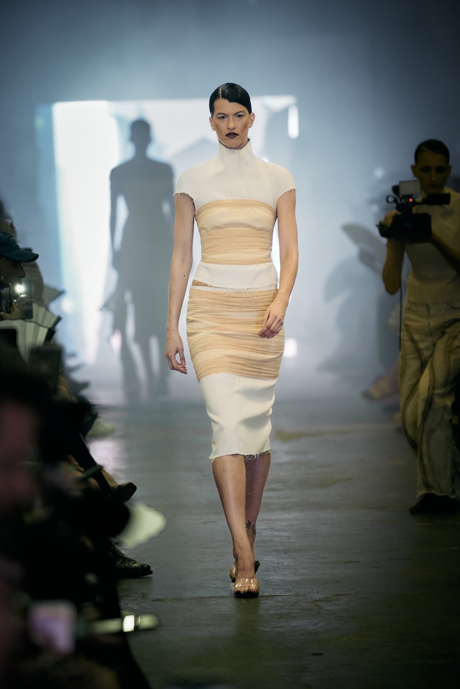 The show itself transcended mere presentation, evolving into a multi-sensory spectacle. A live camera captured the runway’s best moments and projected them throughout the venue, while a haunting soundtrack underscored the themes of the collection with an evocative monologue. The result? An emotional rollercoaster that deftly played with notions of strength and fragility, ease and rigidity, crafting a space for defiance wrapped in delicacy.