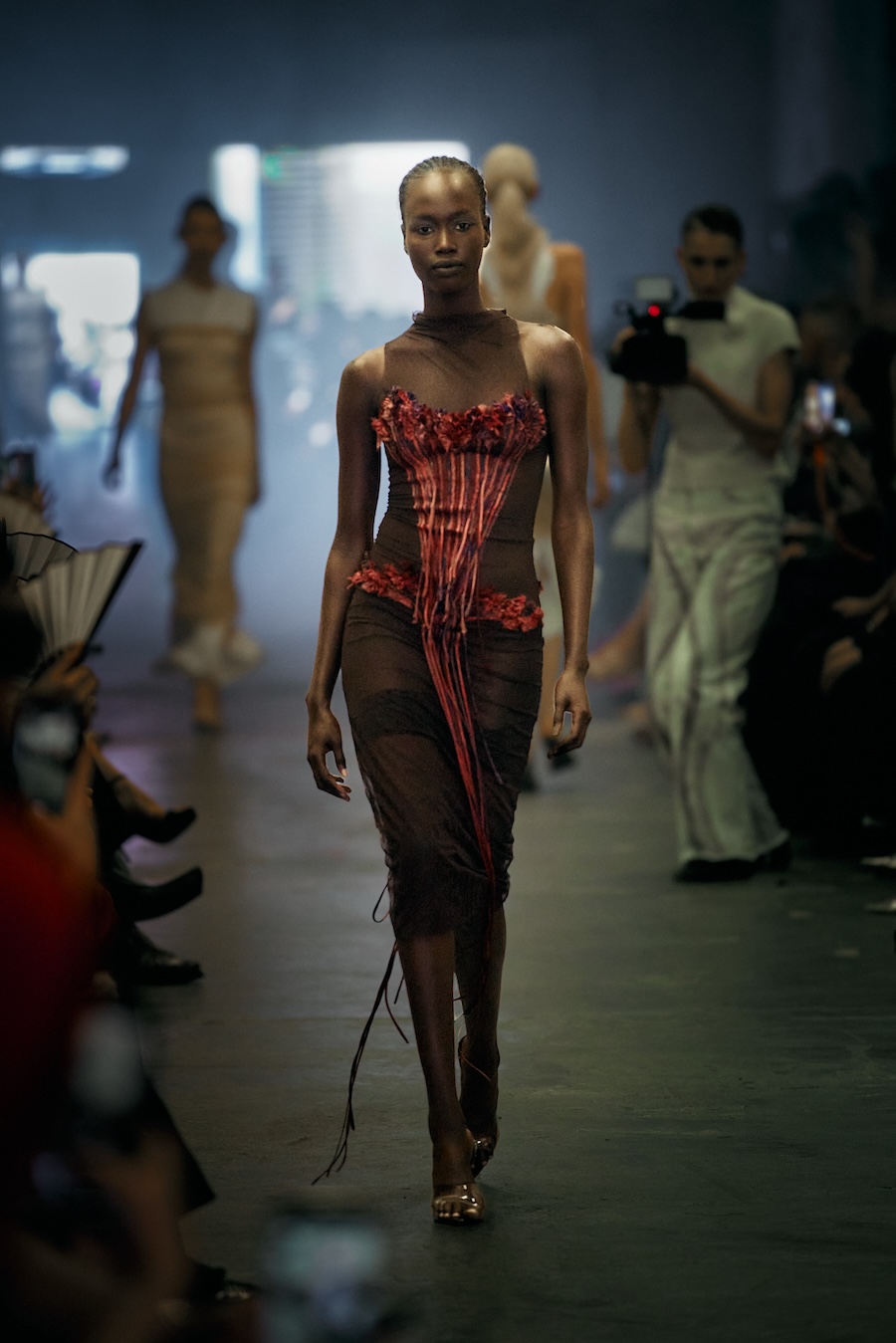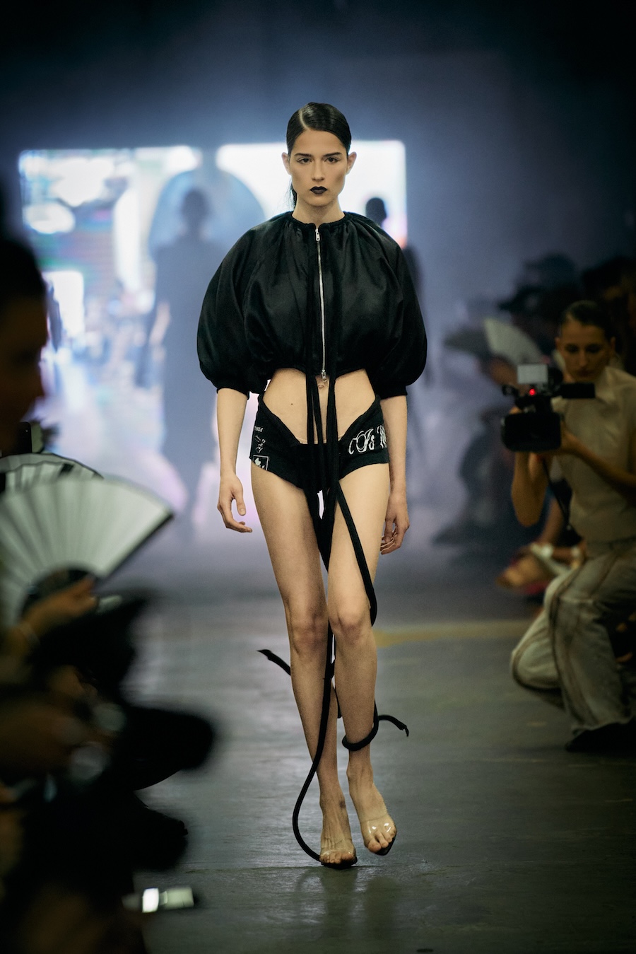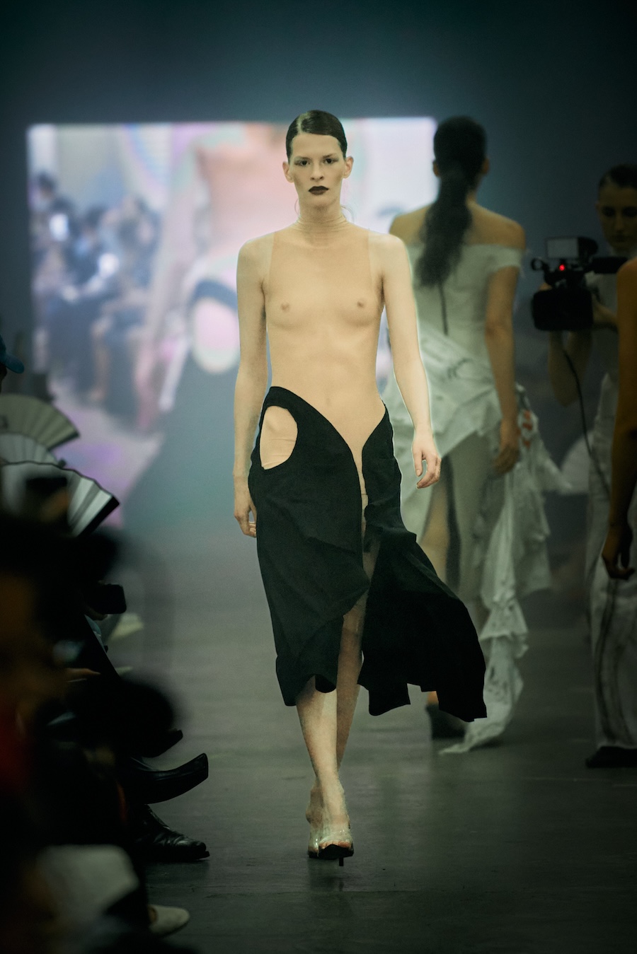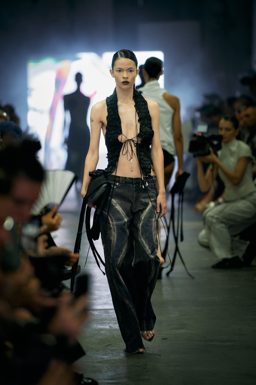 The show itself transcended mere presentation, evolving into a multi-sensory spectacle. A live camera captured the runway’s best moments and projected them throughout the venue, while a haunting soundtrack underscored the themes of the collection with an evocative monologue. The result? An emotional rollercoaster that deftly played with notions of strength and fragility, ease and rigidity, crafting a space for defiance wrapped in delicacy.