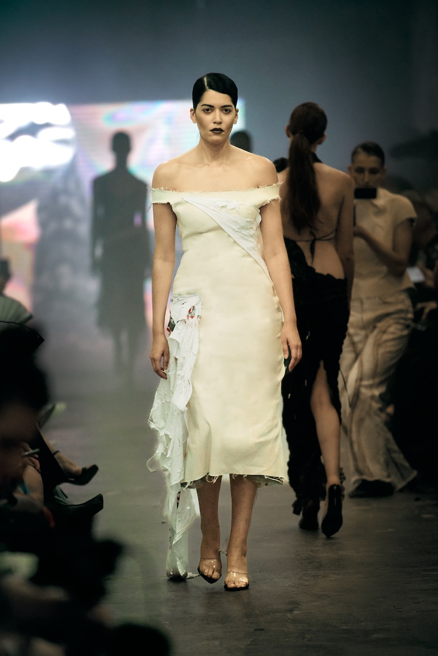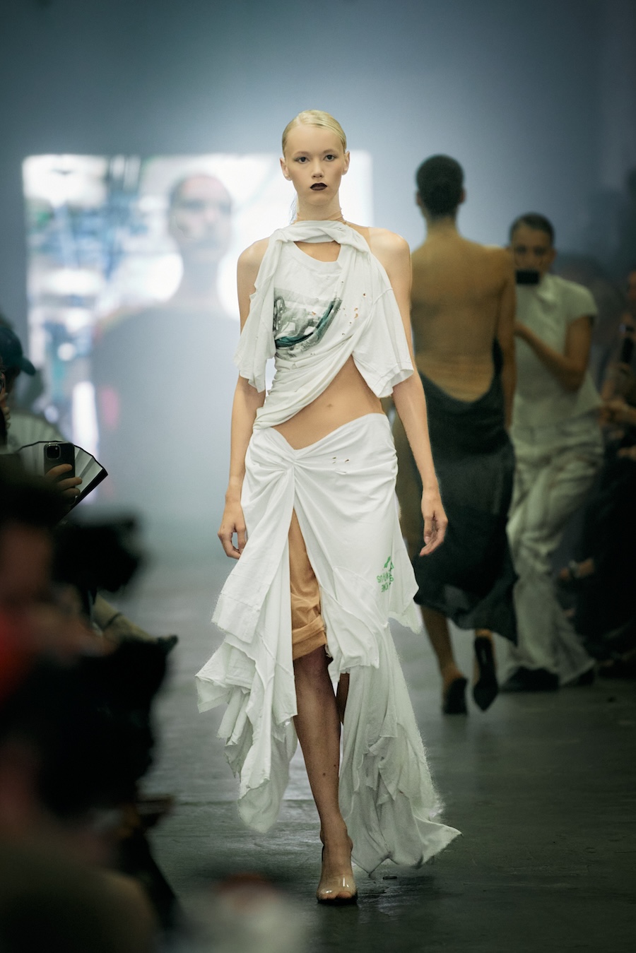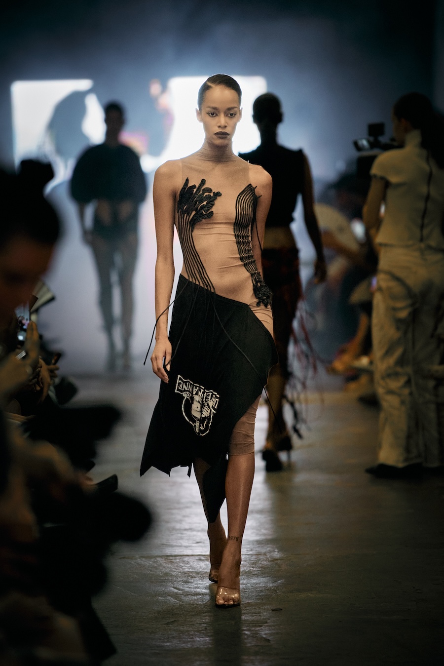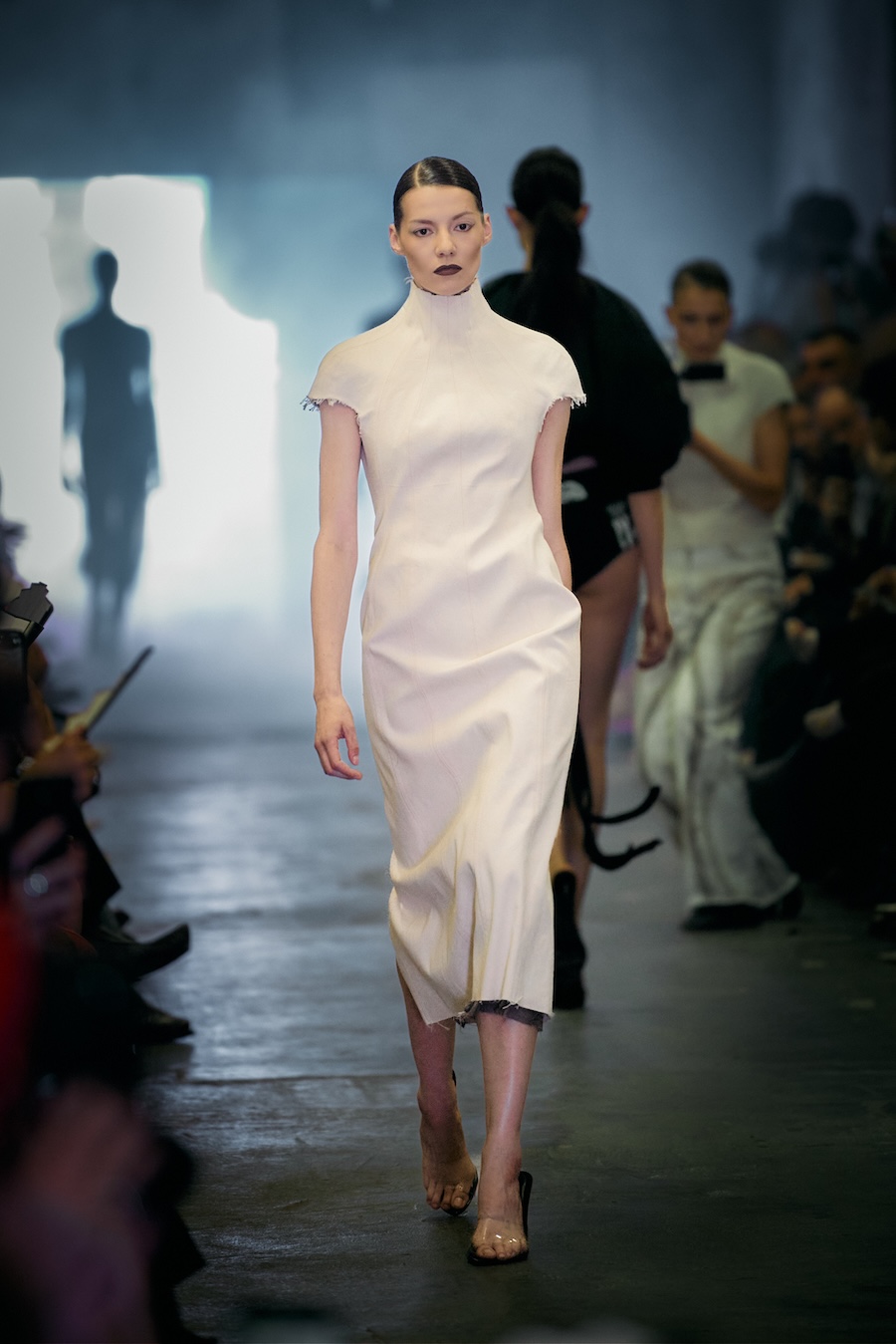 Immersed in the gritty elegance of an undone Berlin-chic environment, a select audience of 200, featuring notable fashion insiders like Jerry Hoffmann, Karolina Spakowski, Domiziana, Luisa Gaffron, and Emma Drogunova, was invited into a world where intimacy collided with chaos. The setting perfectly reflected the dual themes of the collection, amplifying the tension and beauty imbued in each piece.