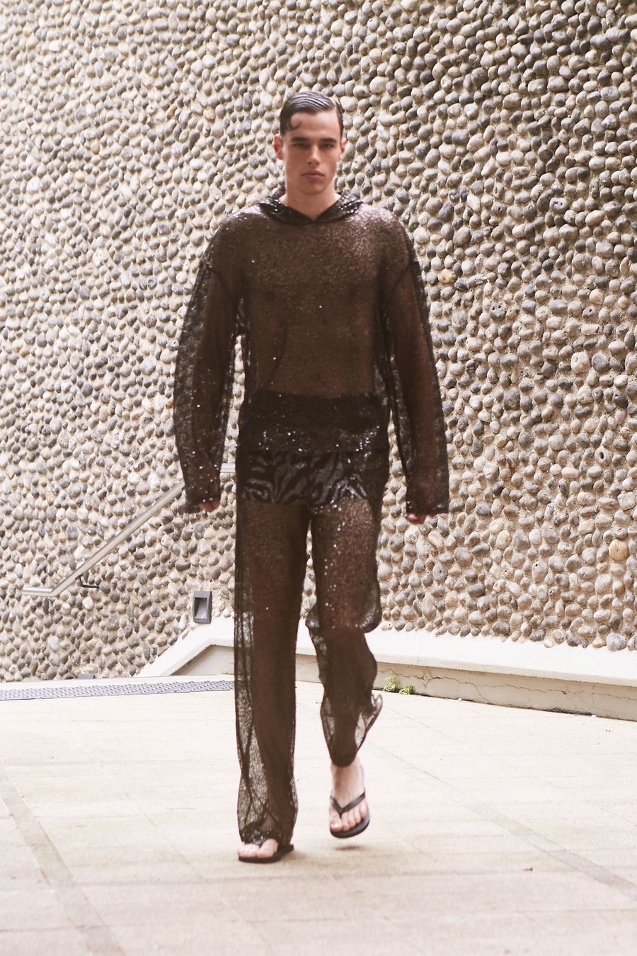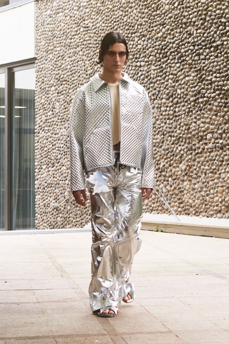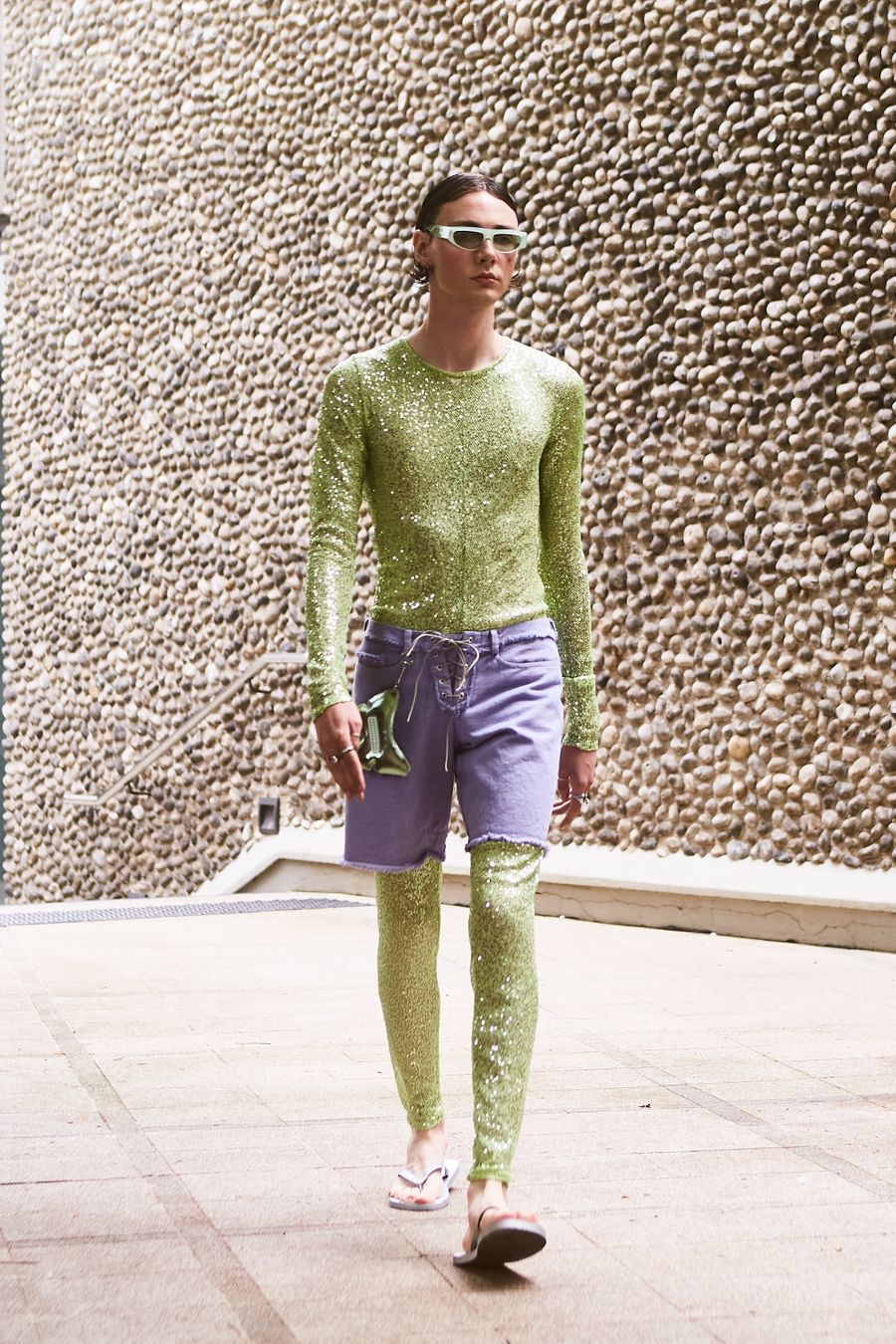 palette is pure and natural. Black, beige and silver are accompanied by light green, light blue and purple. Op-art prints, silver quilt and sequin mesh evoke a metaphorical rave feeling.