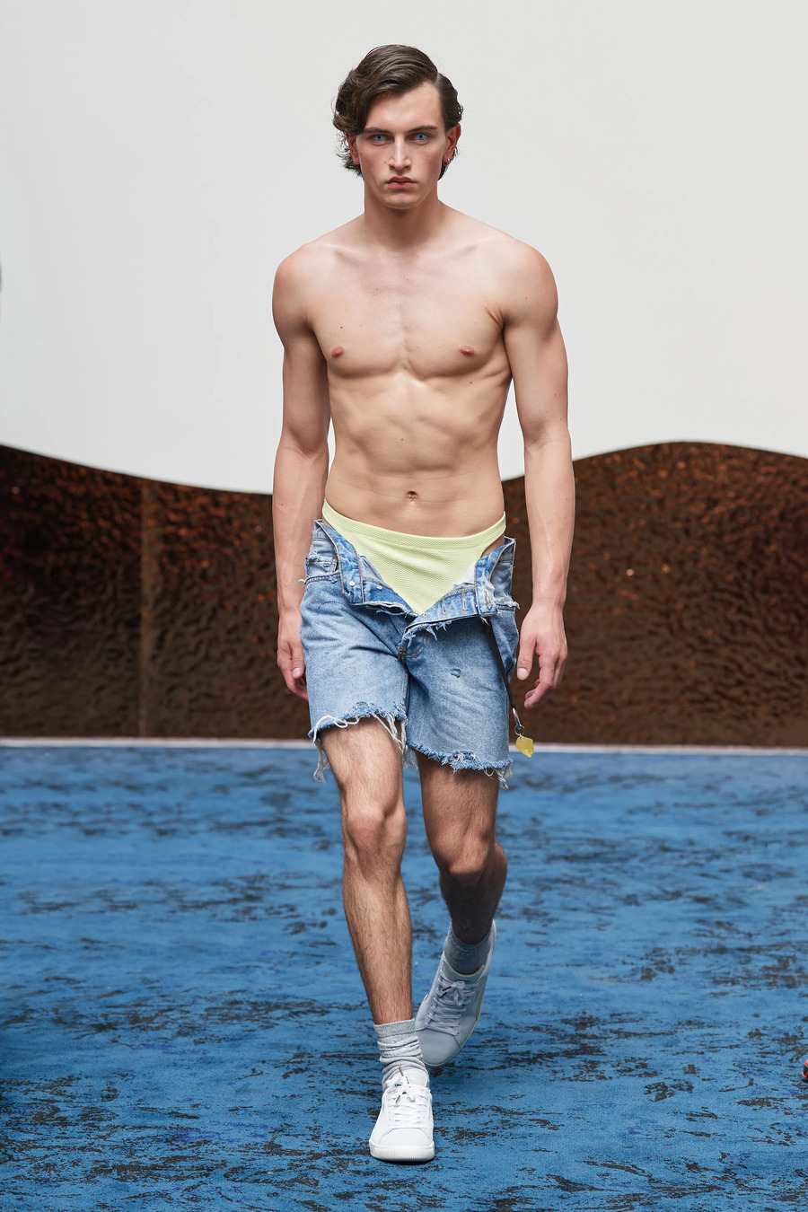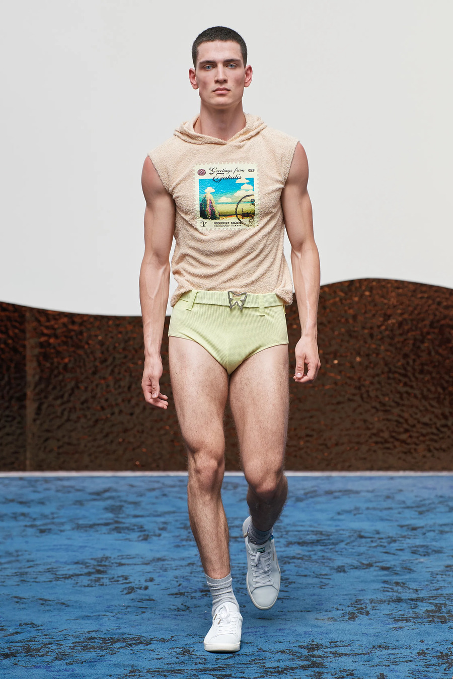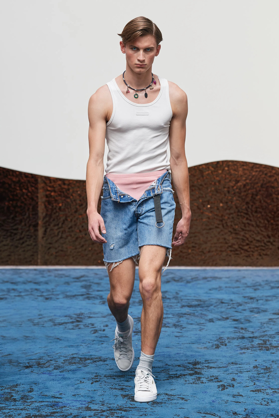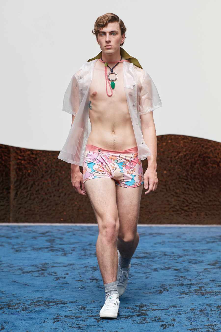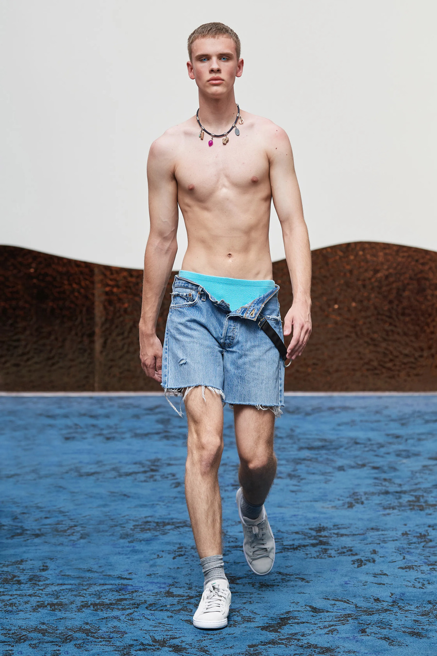 The dreamy “gaycation” sets the tone for the collection, featuring upcycled fight jackets and hybrid denim hotpants with an open fly and sewn-in swimwear. Adding a touch of magic and enchantment, AI-generated artworks draw from the symbolism of a cliche-ridden love novel.