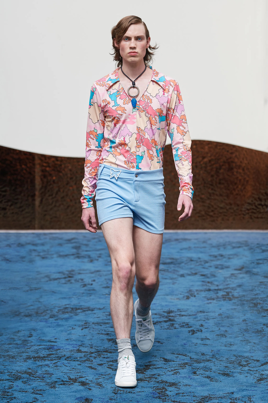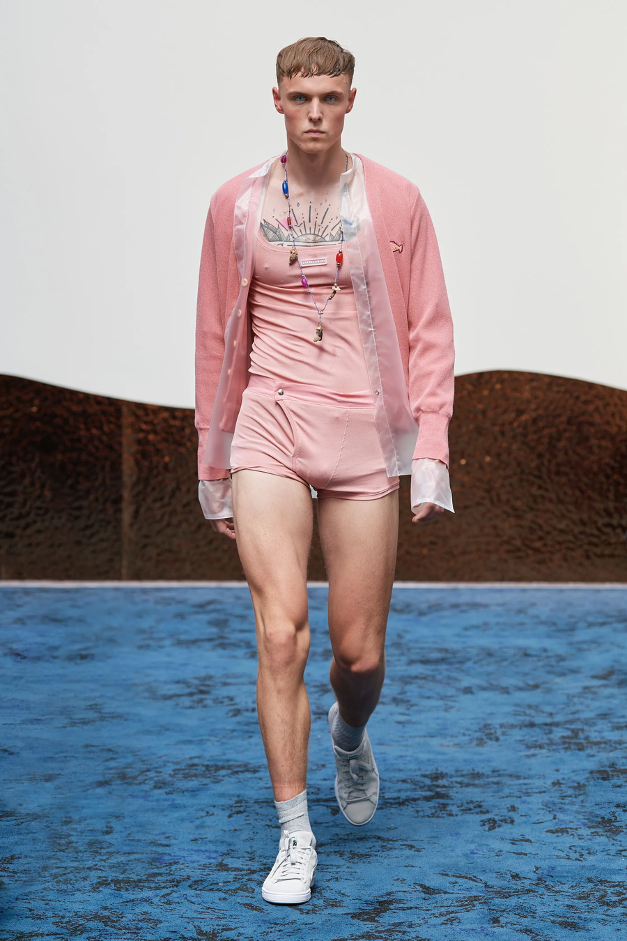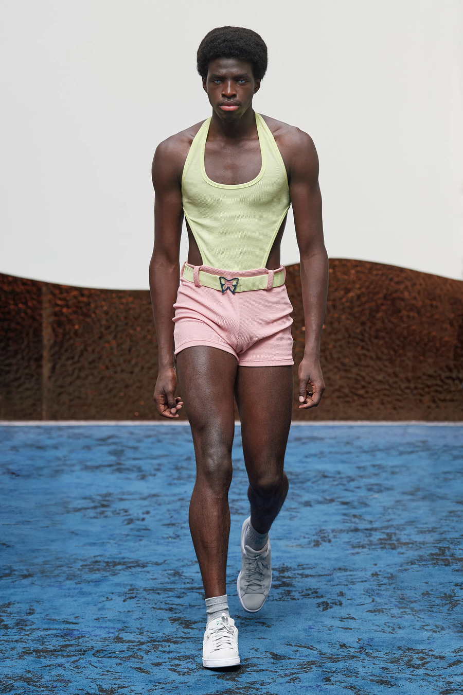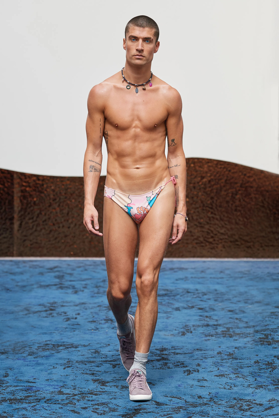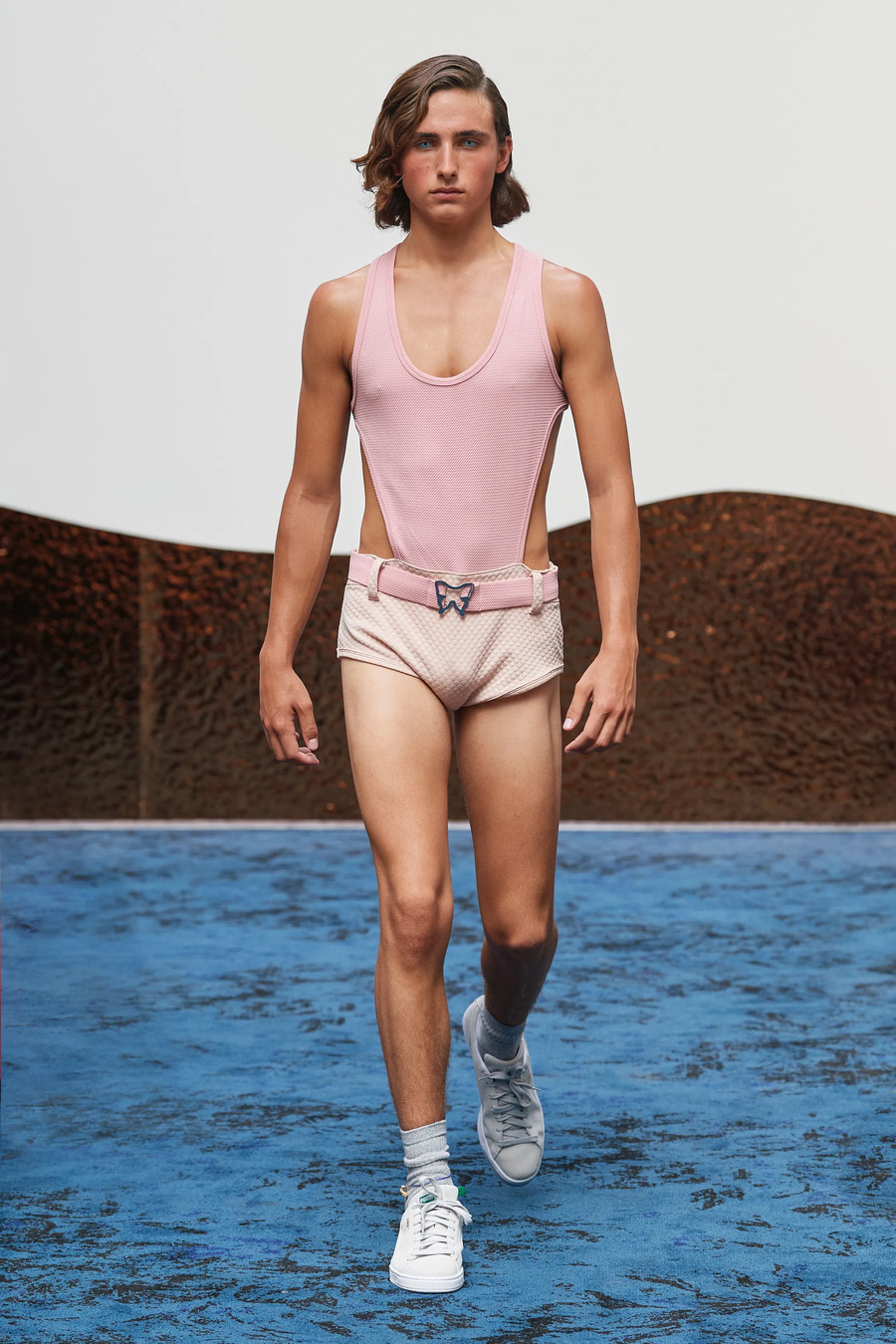The dreamy “gaycation” sets the tone for the collection, featuring upcycled fight jackets and hybrid denim hotpants with an open fly and sewn-in swimwear. Adding a touch of magic and enchantment, AI-generated artworks draw from the symbolism of a cliche-ridden love novel.
