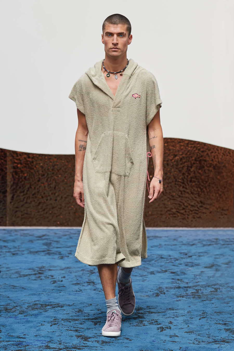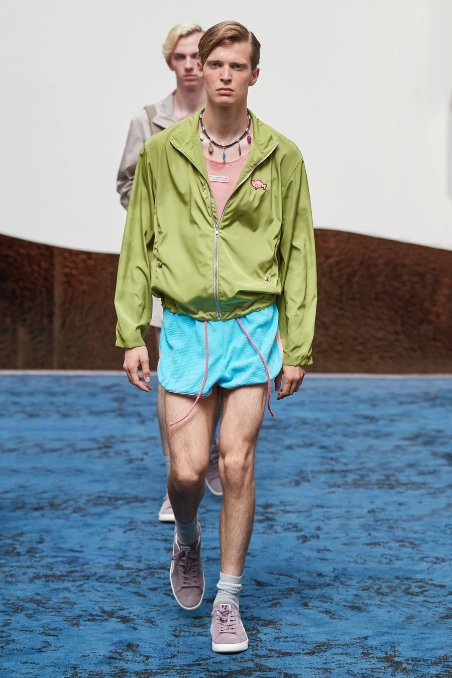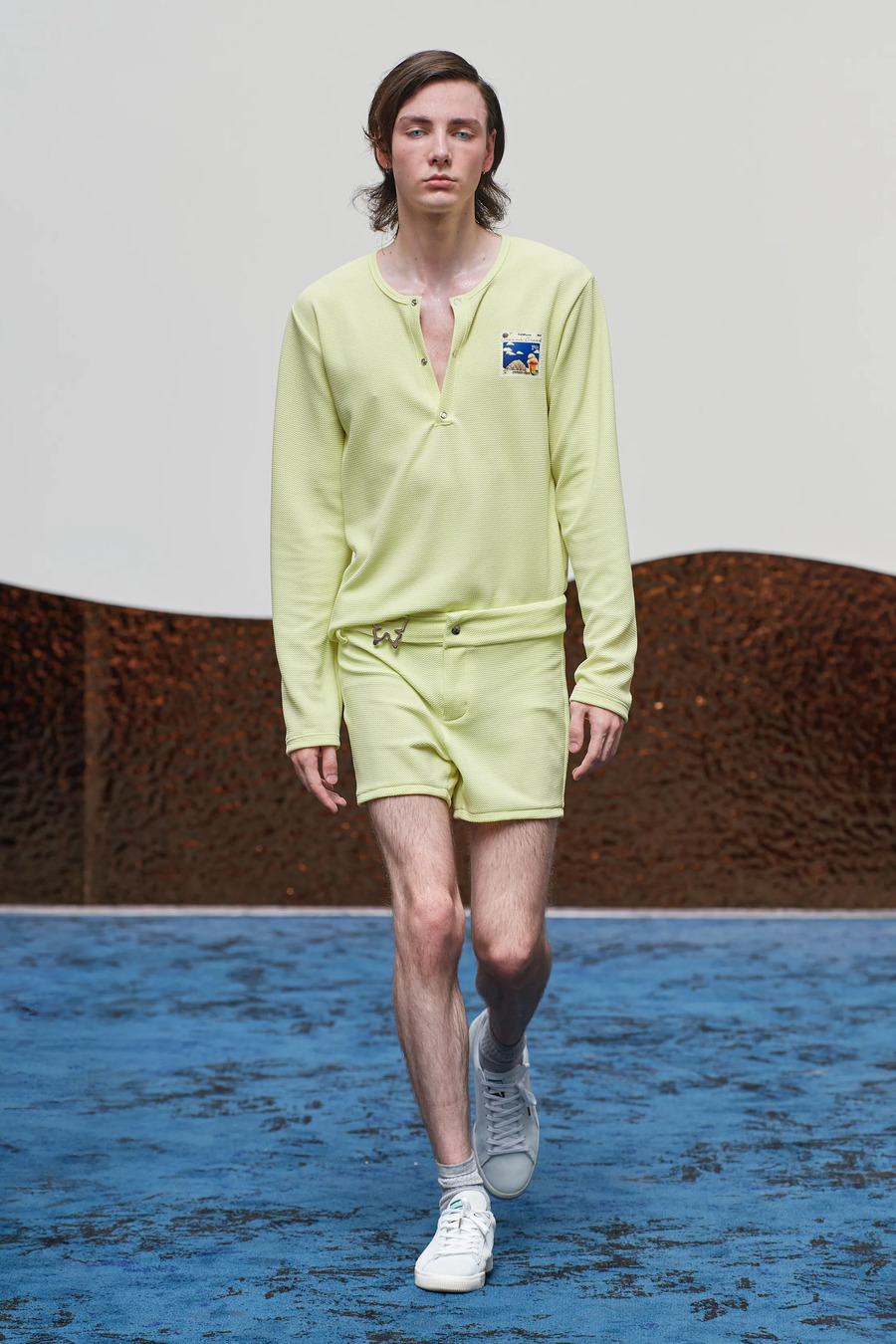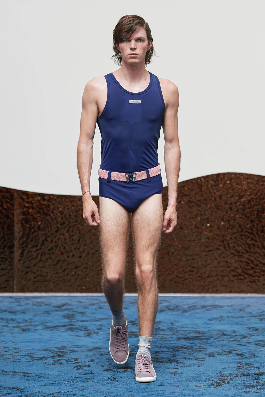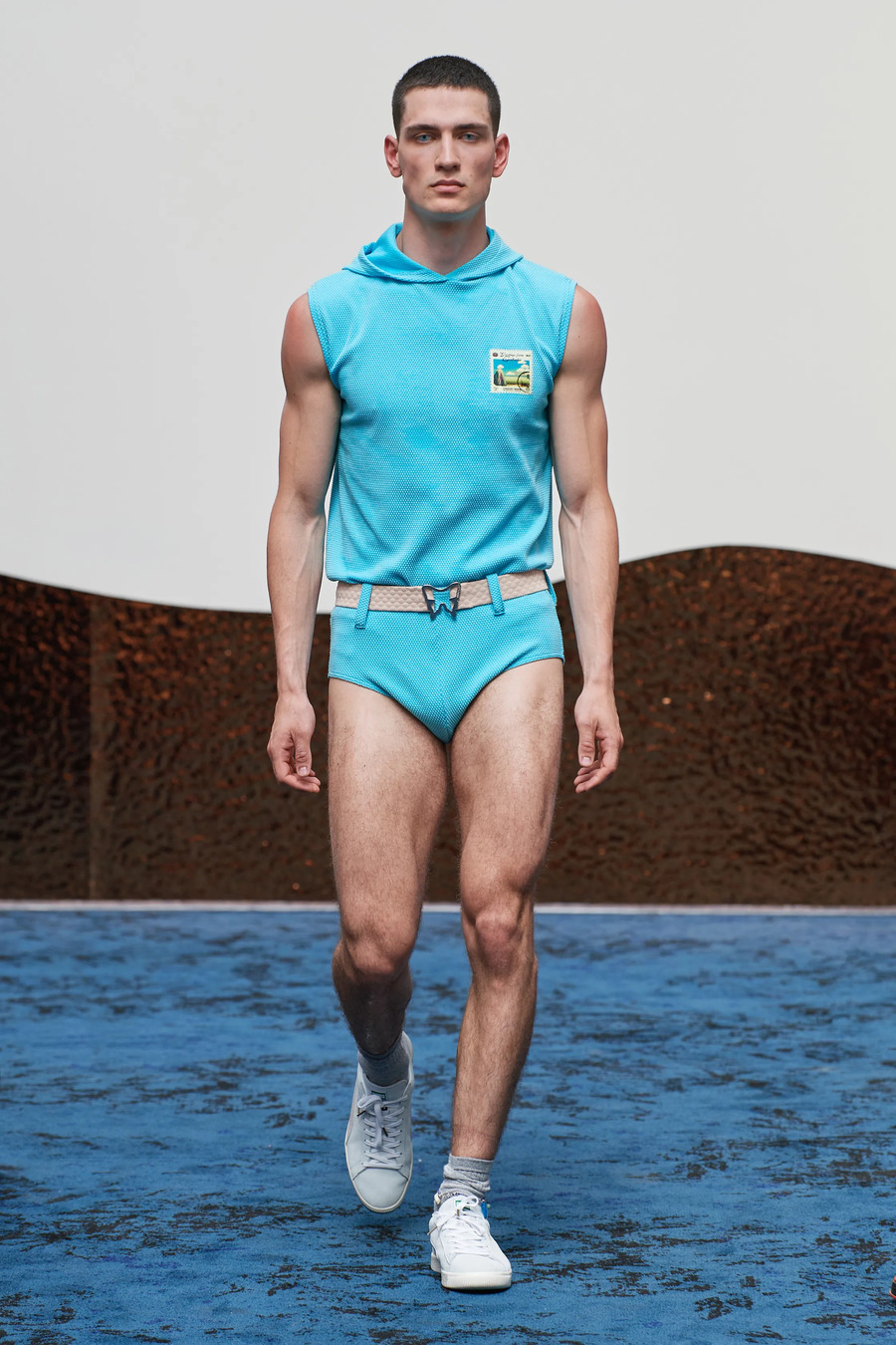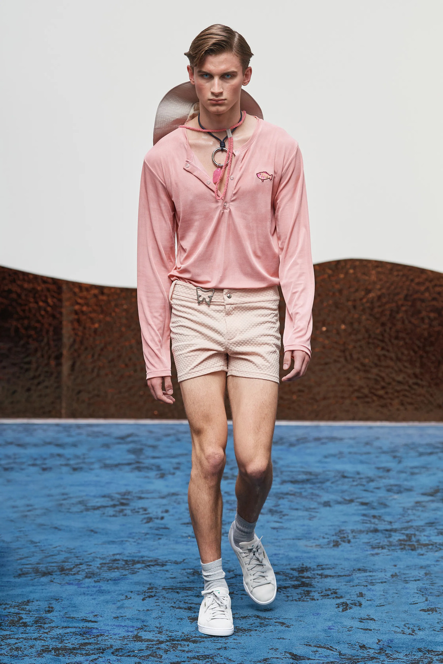 The dreamy “gaycation” sets the tone for the collection, featuring upcycled fight jackets and hybrid denim hotpants with an open fly and sewn-in swimwear. Adding a touch of magic and enchantment, AI-generated artworks draw from the symbolism of a cliche-ridden love novel.