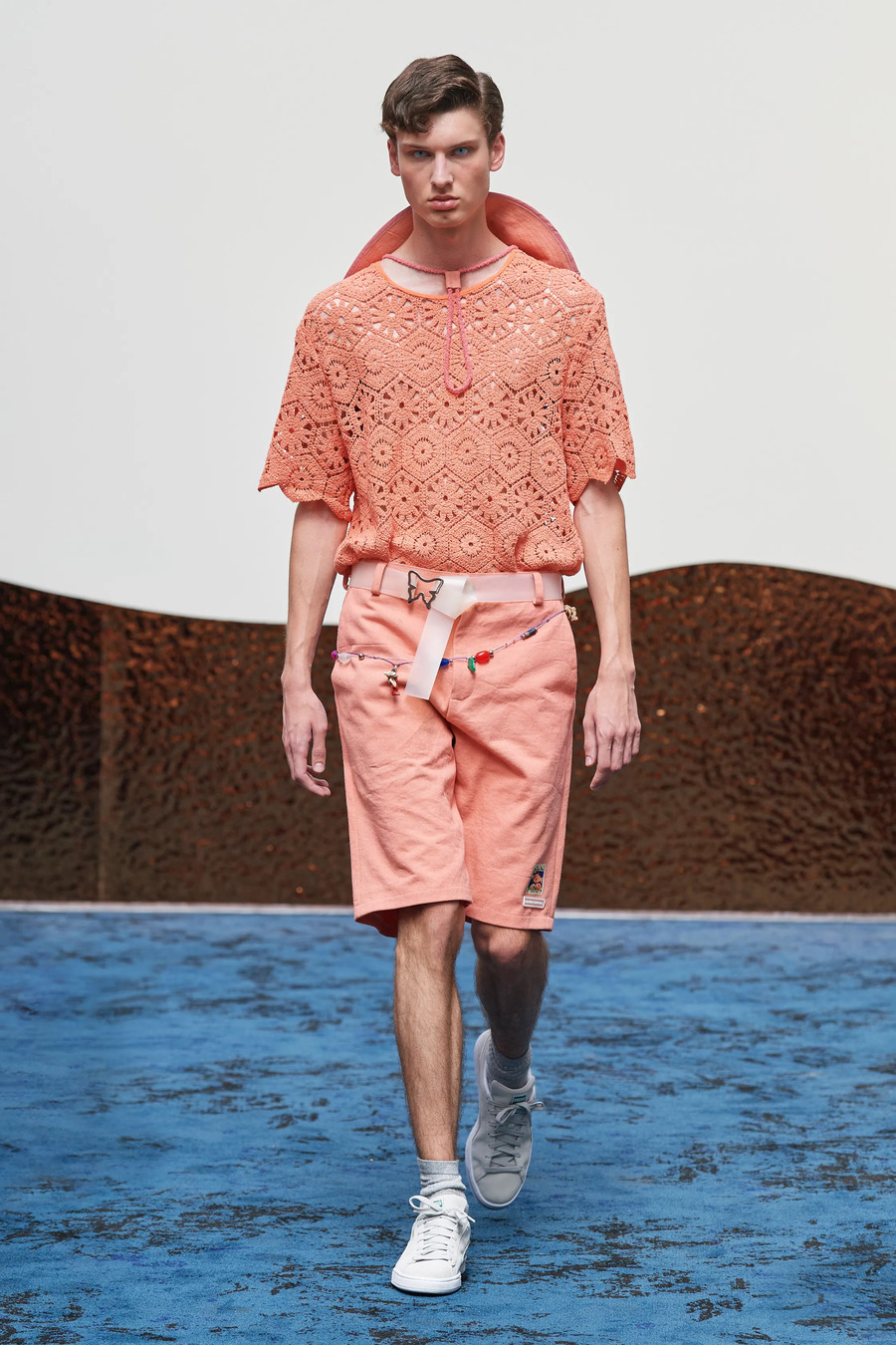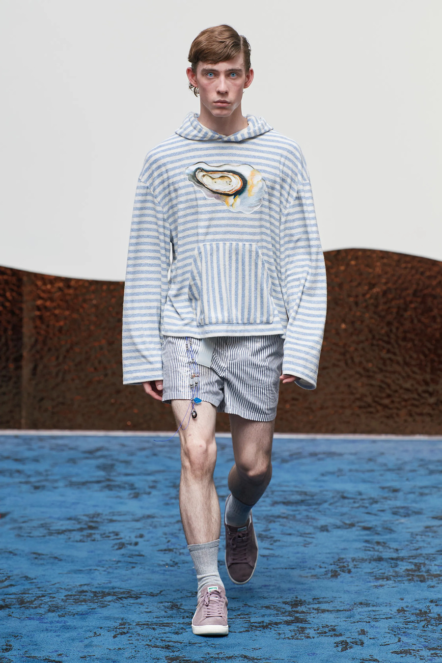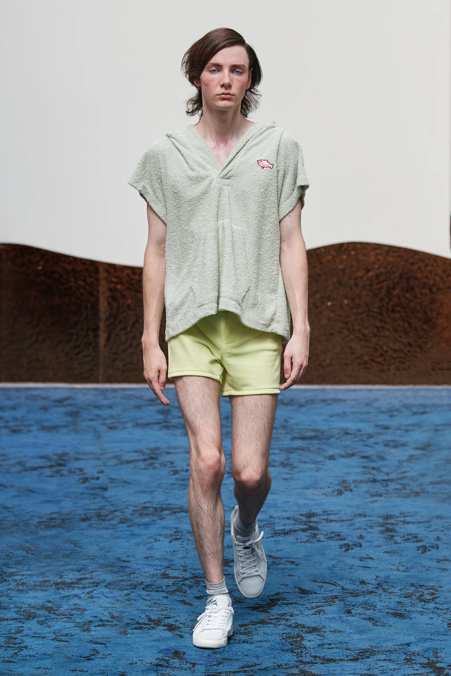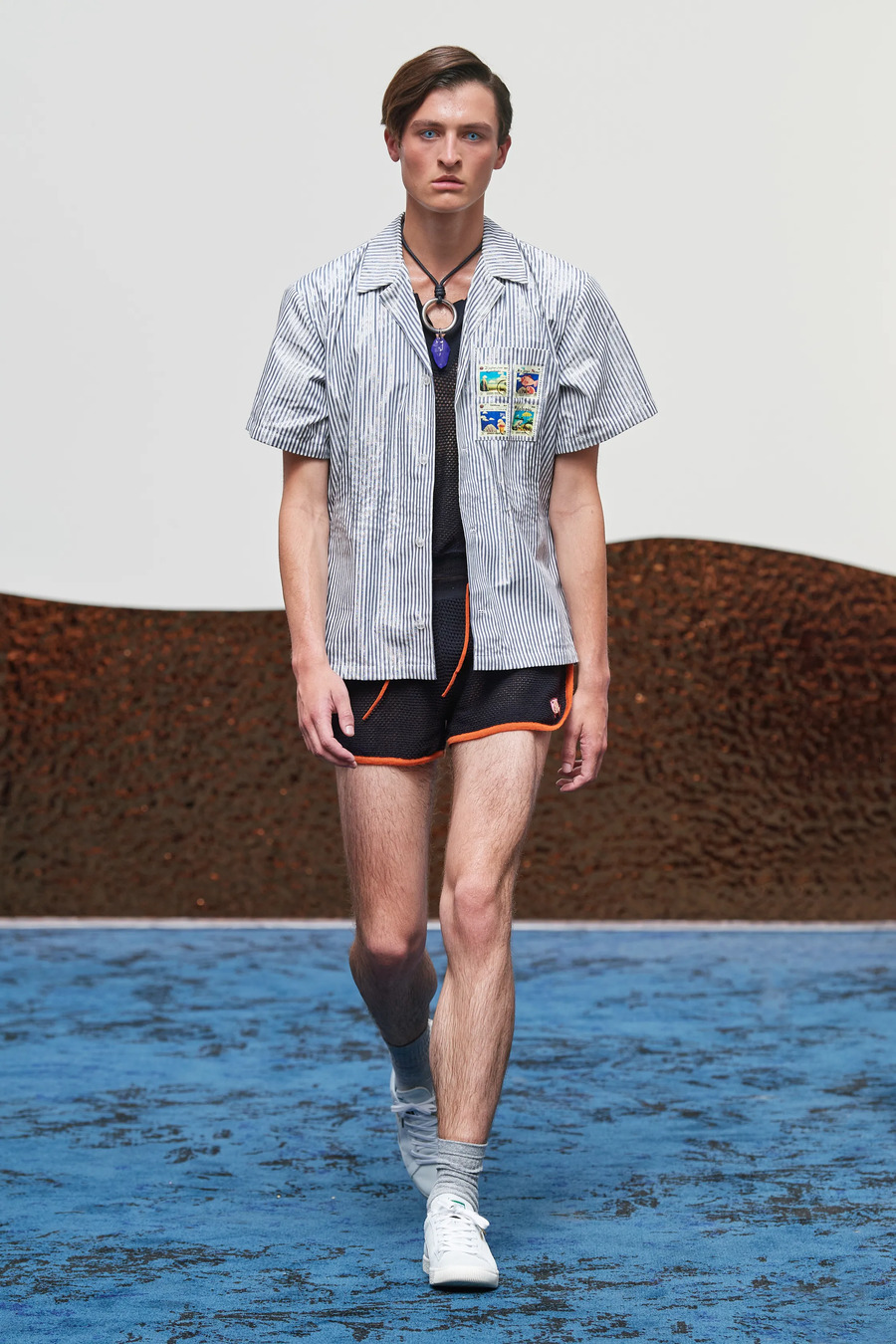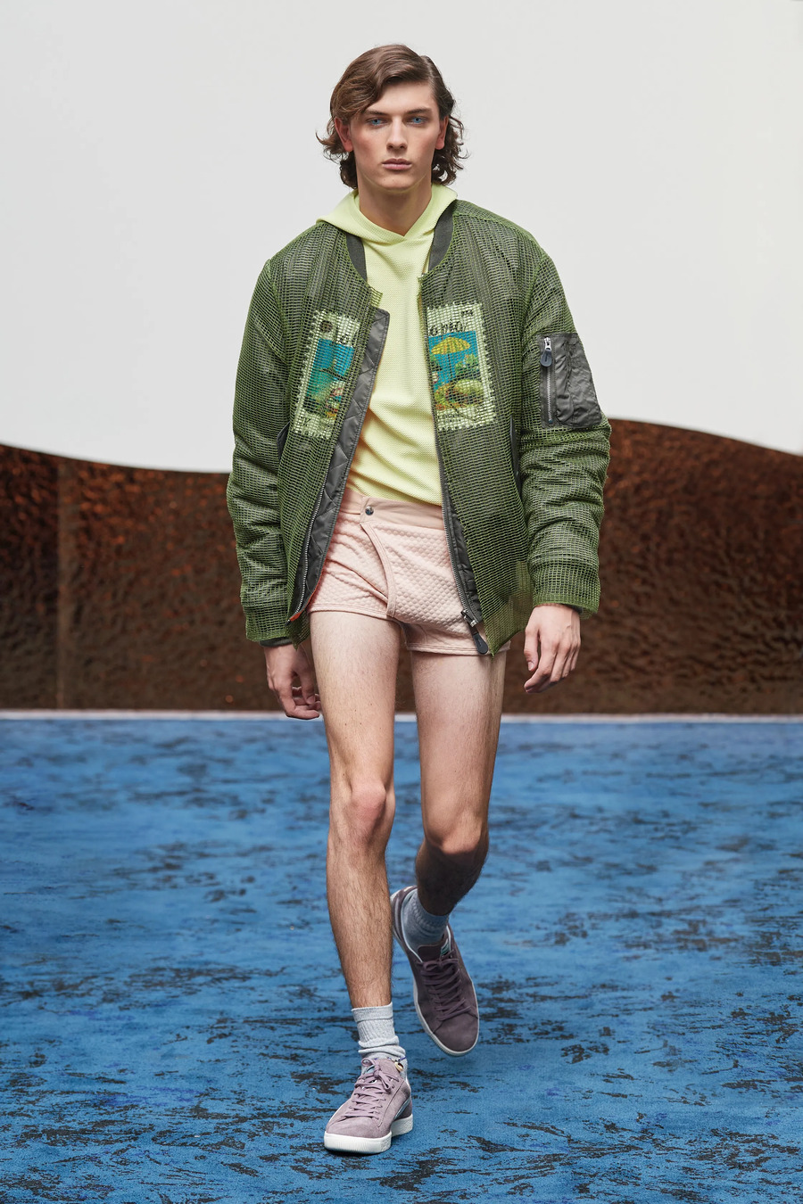 The dreamy “gaycation” sets the tone for the collection, featuring upcycled fight jackets and hybrid denim hotpants with an open fly and sewn-in swimwear. Adding a touch of magic and enchantment, AI-generated artworks draw from the symbolism of a cliche-ridden love novel.