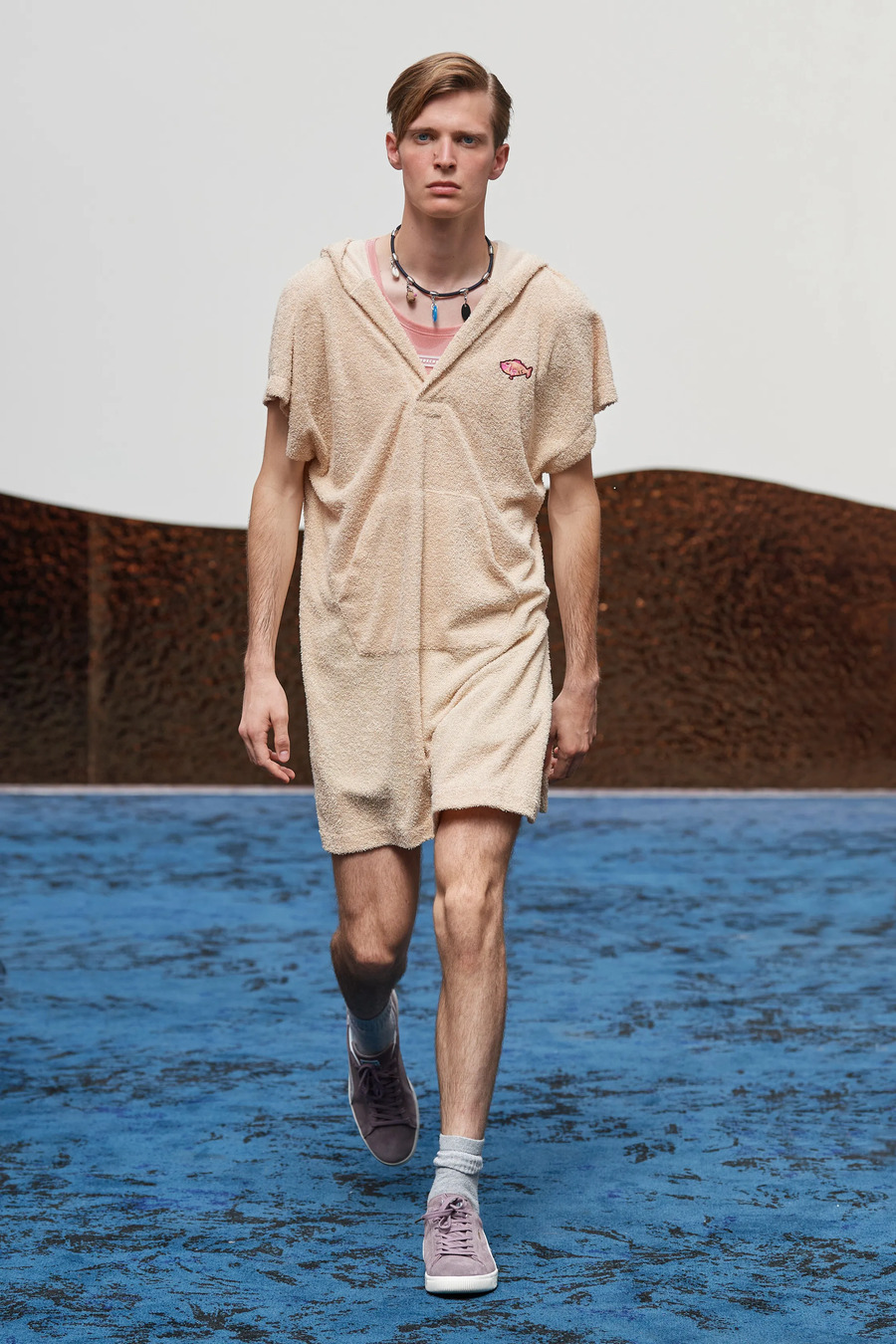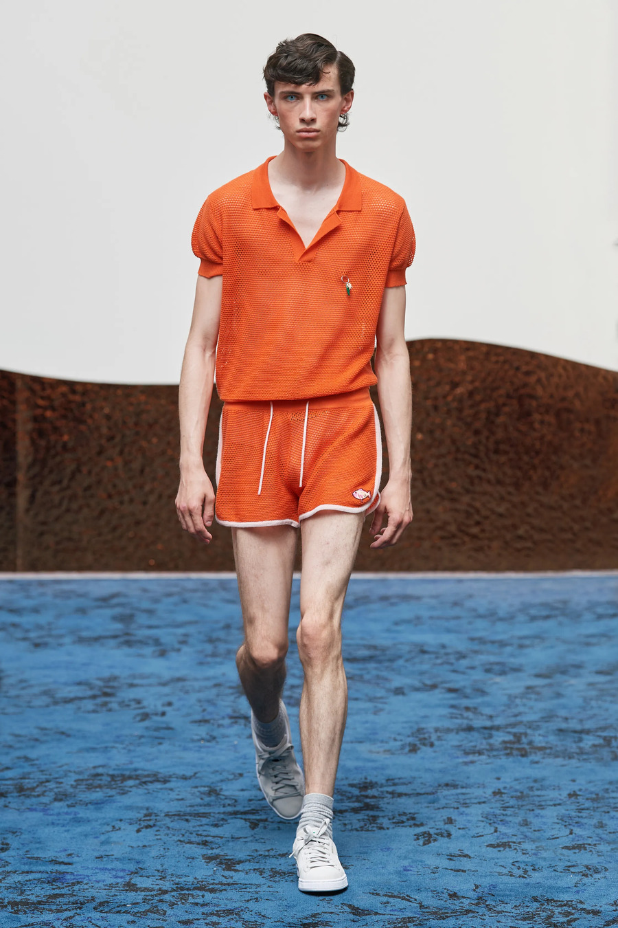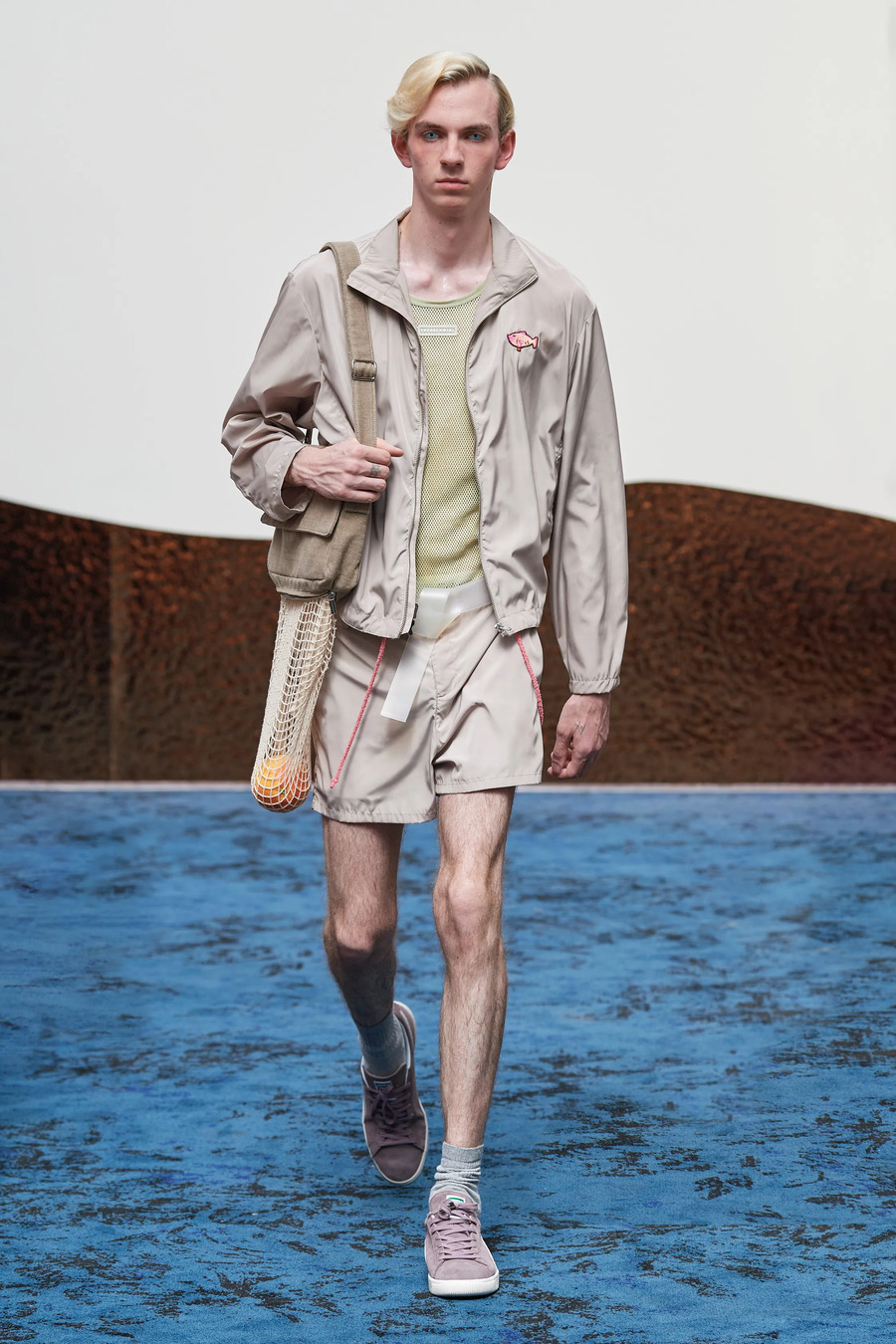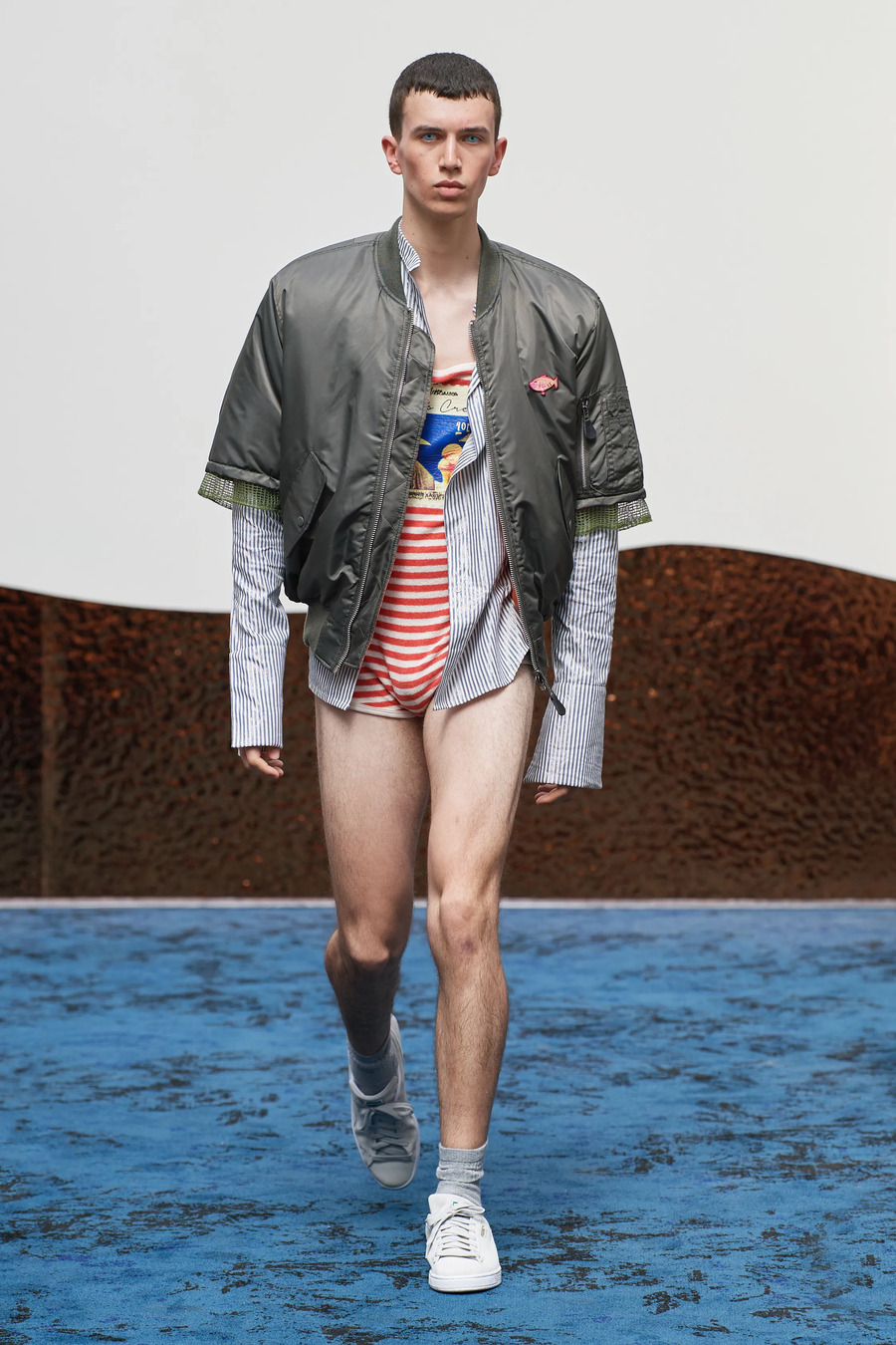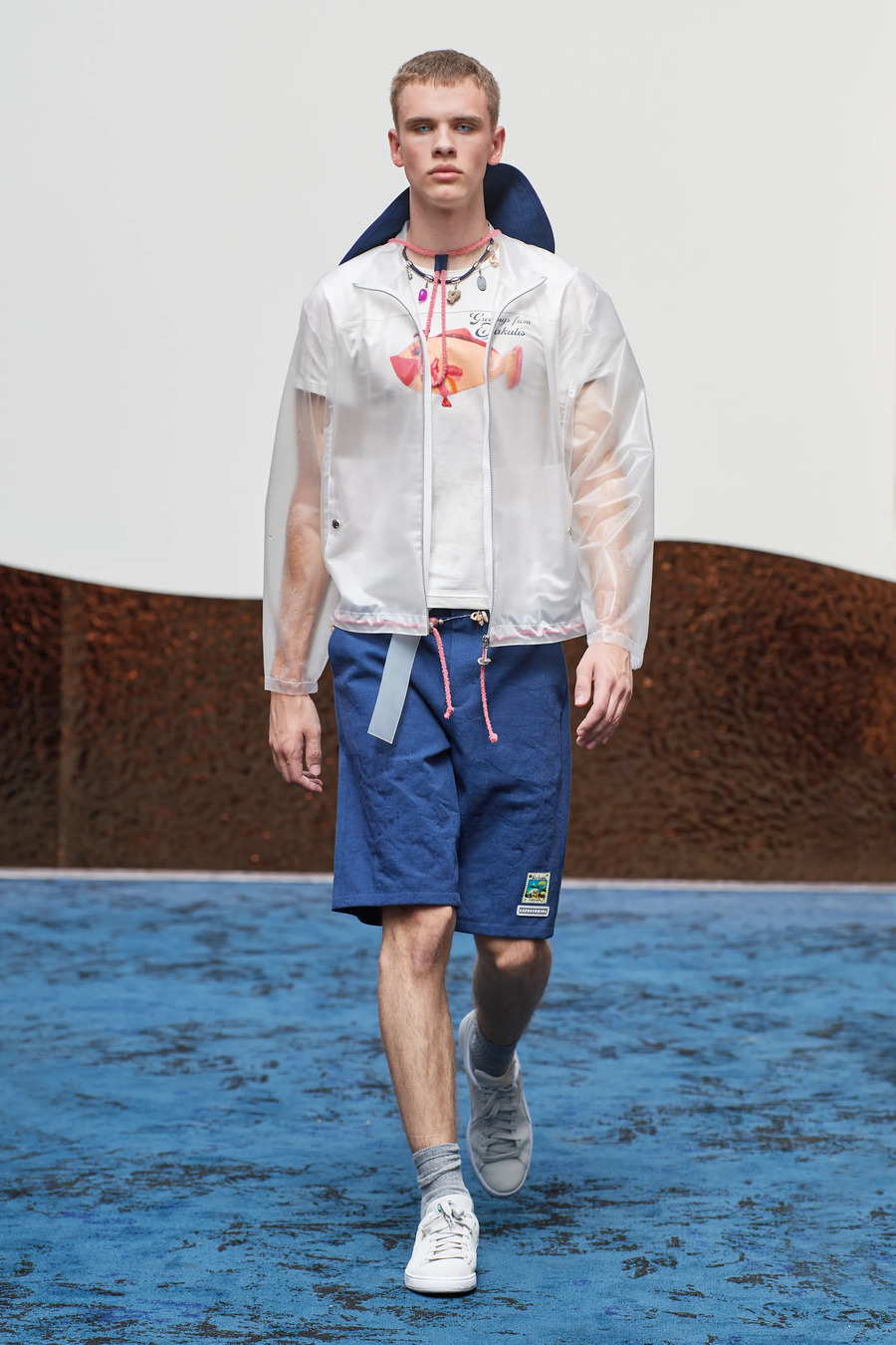 The dreamy “gaycation” sets the tone for the collection, featuring upcycled fight jackets and hybrid denim hotpants with an open fly and sewn-in swimwear. Adding a touch of magic and enchantment, AI-generated artworks draw from the symbolism of a cliche-ridden love novel.