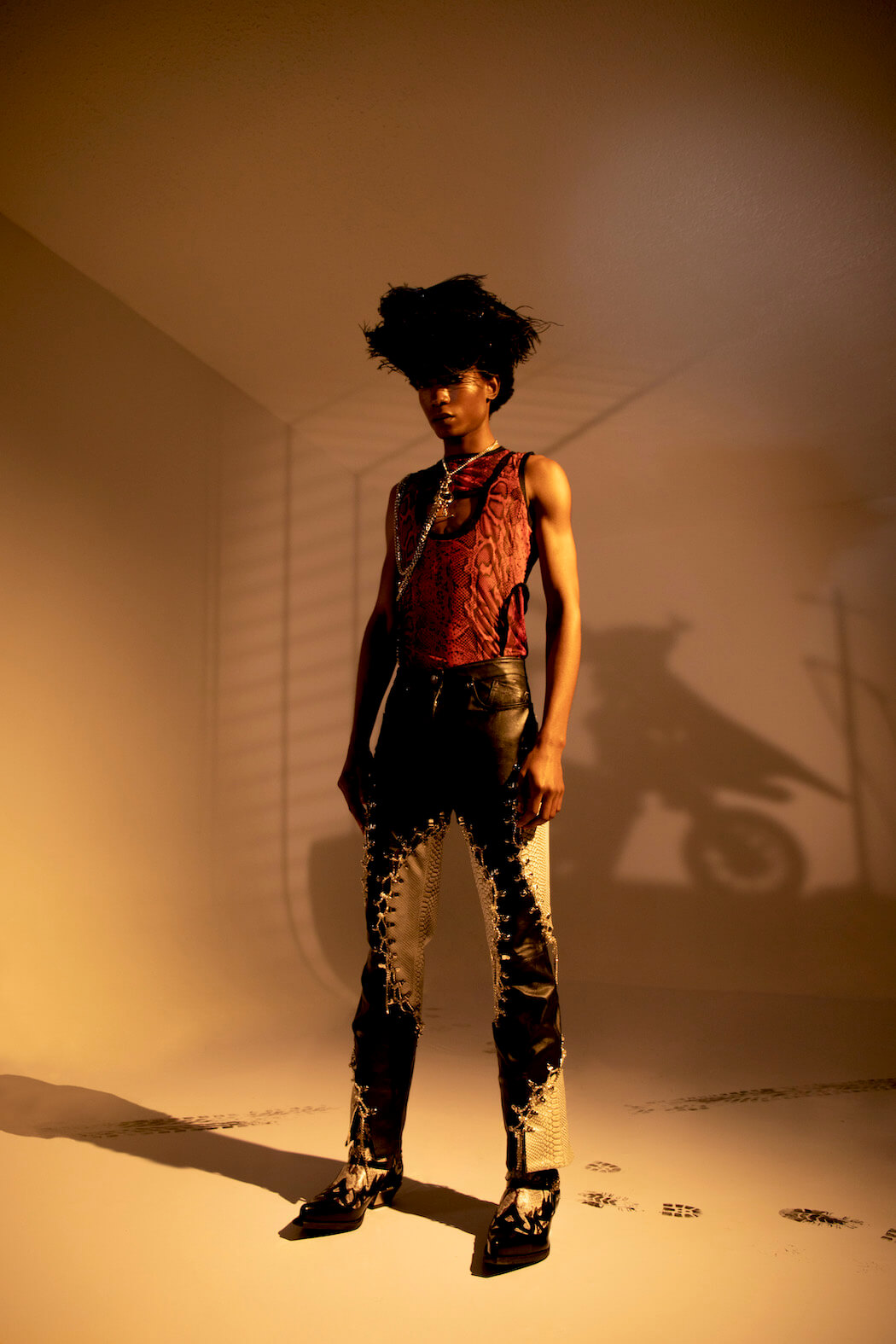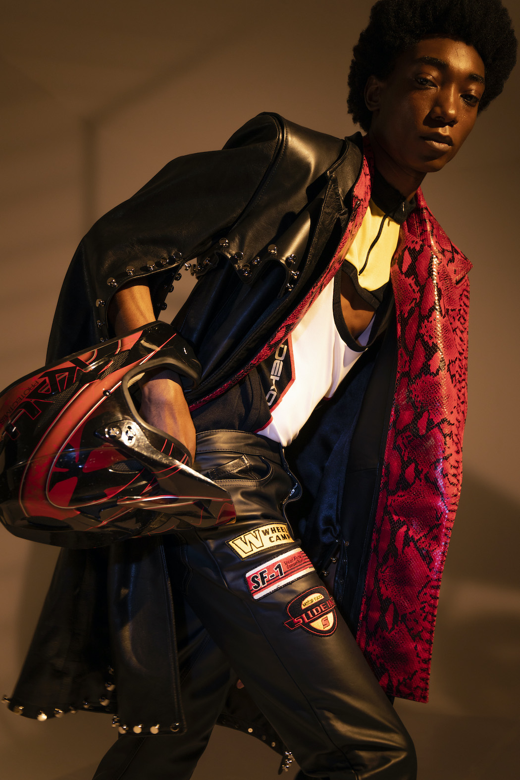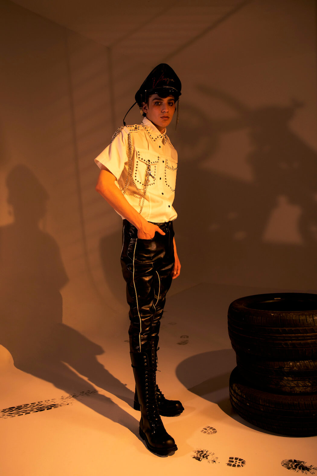 Entitled Leather Boys Pt II, the AW21 collection editorial is a collaboration showcasing Mateo’s own work and everyone he worked with, including Jewellery by Luke V Smith, Bags by Manon Planche, Hats by Benjamin Paul and New Rock Shoes.