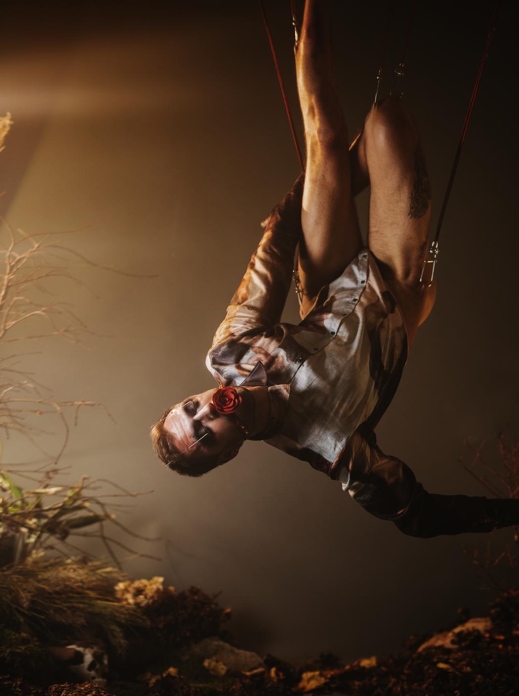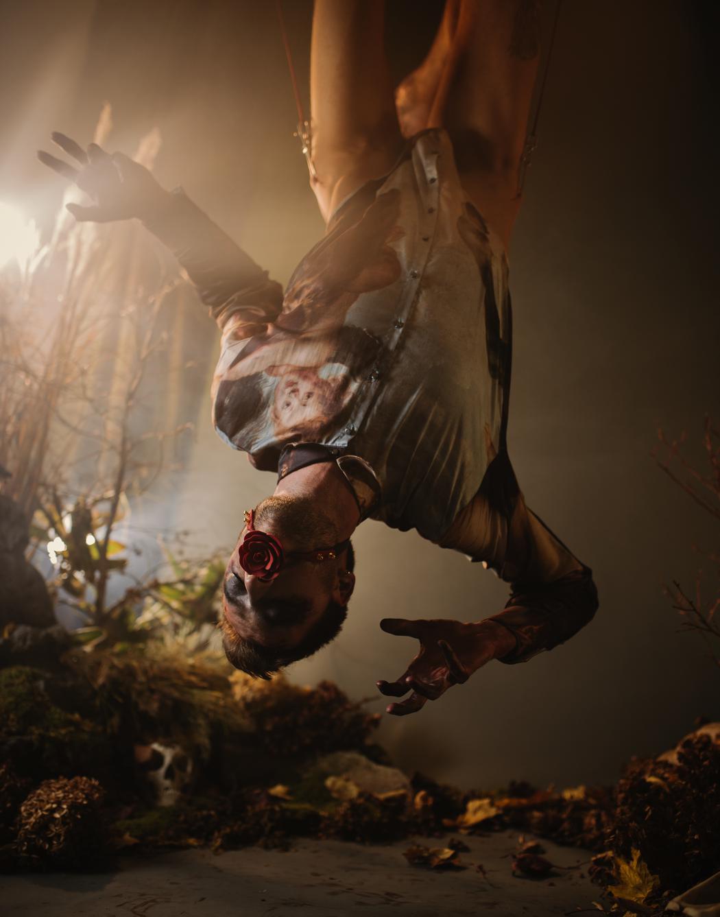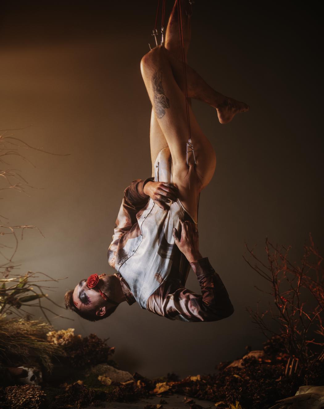 “This past year I began a new romantic relationship, my first in a while. Over time it began to feel like I was re-experiencing many emotions again, seemingly for the first time. Romance, love, strife, jealousy, sadness, joy, sex, and more- all of these feelings felt new, or when I contemplated on them more deeply, it was maybe experiencing them as a more mature human being. I had put my romantic life on the back burner for a number of years, mostly out of my own insecurities. It was as if this new renewal of feelings were holding up a mirror to how I felt I was, where I am now, and how I want to present myself. With the added circumstance of the pandemic and lockdown, it felt like there was only so much I could do to explore this awakening. During the spring I kept going back to a phrase I had learned when I visited France when I was younger- “faire l’ecole buissonnière,” meaning to play hooky from school. How it was explained to me at the time was ” a school of escape into nature,” which always stayed with me as a romantic notion. This meditation on the phrase kept giving me an image of getting pulled out of the ground and into the air- how I felt being reborn emotionally from nature, the ground, the air. After months of being forced into lockdown, I was finally able to birth the project by using body suspension, a community I am lucky to have found in NYC. Being able to suspend on the hooks was, as it always is, therapeutic, and gave me an artistic outlet to focus these new emotions as well as feel the tension of the physical tether of the hooks, with the feeling of flying in the air.”