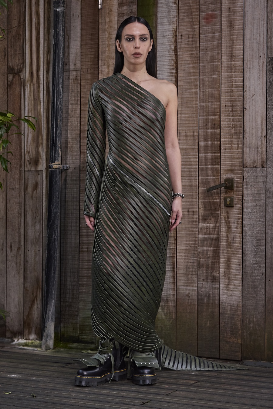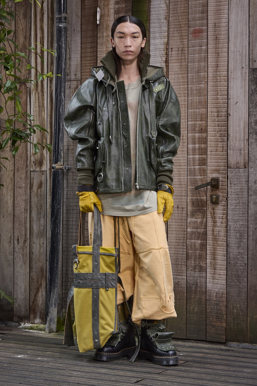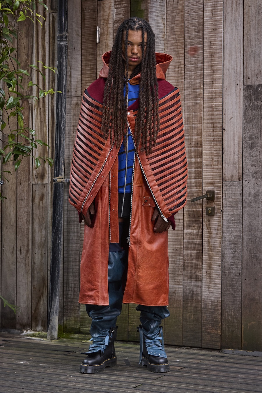 Key pieces include quilted leather parkas and modular capes, crafted from offcut leather strips, showcasing both technical precision and ease of wear. The curved shoulders maintain their shape while allowing for fluid movement, achieving a balance of structure and softness.