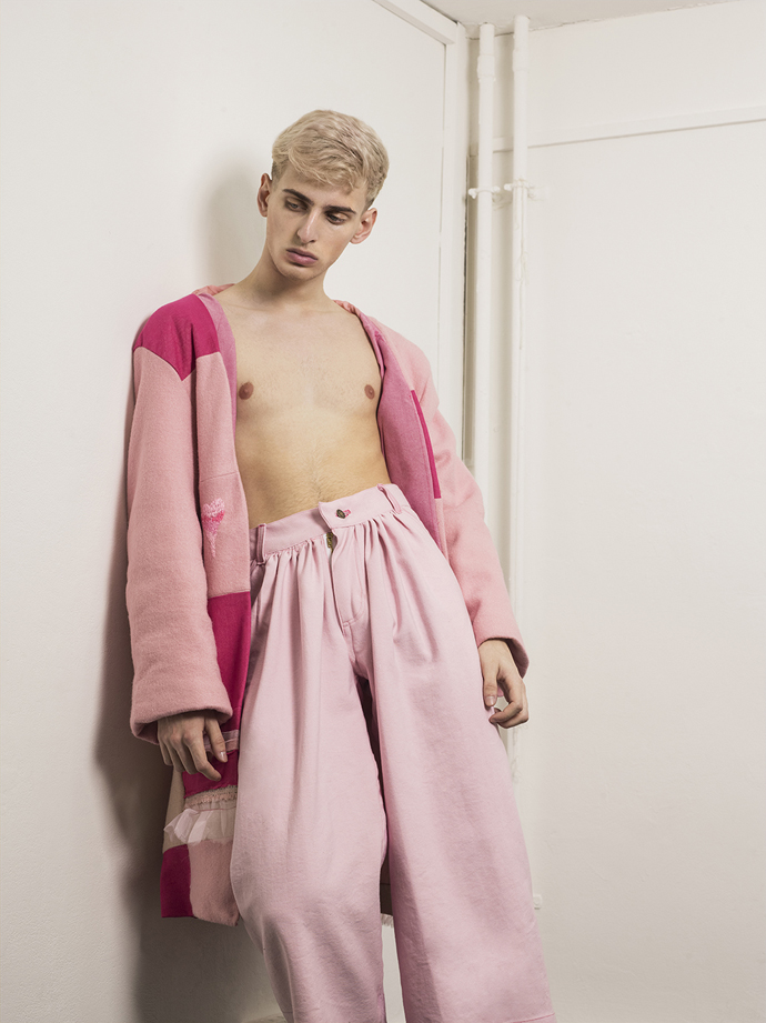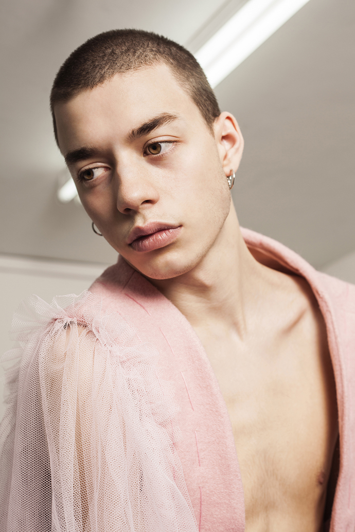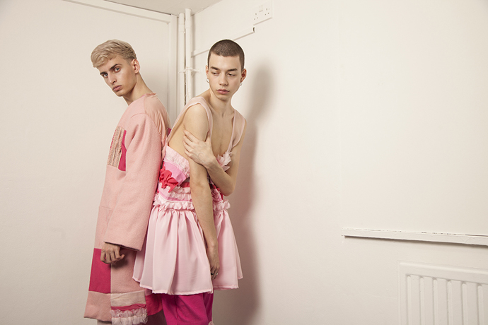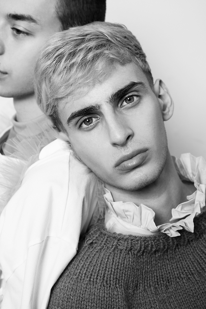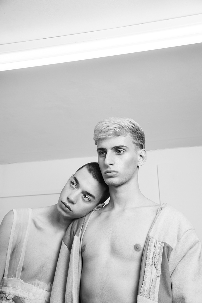 A KALTBLUT exclusive menswear editorial. Models are Reilee Cousins and Nikolas Santur. Photographer Shannon Darby-Jones has been greatly inspired by Grayson Perry’s book ‘The Descent of Man’ and has attempted to challenge stereotypes that society has embedded in us. What do you perceive to be a man? In collaboration with graduate designer Abbie Sparkes, who shares a very similar mind set. To challenge the default image we have of men, stereotypes are not conformed to in this story, as many have an out-dated, negative attitude to those who break the boundaries of ‘normal’, a dangerous word. These are the type of closed-minded individuals that Shannon enjoys challenging. Femininity in boys is a specific topic she has been experimenting with in the past three years, and feels she has found her niche. Styling by Lucy Bilcock.