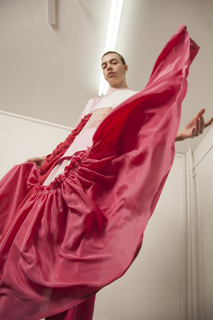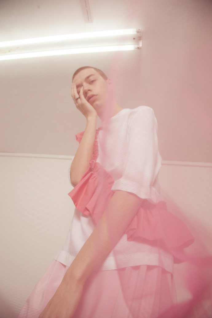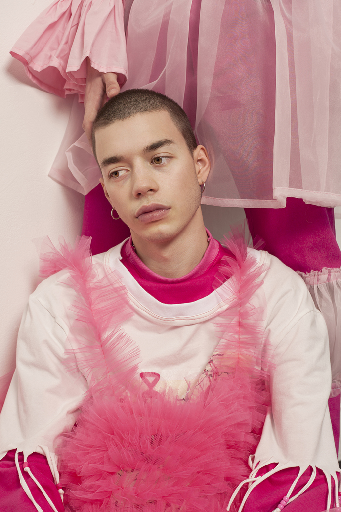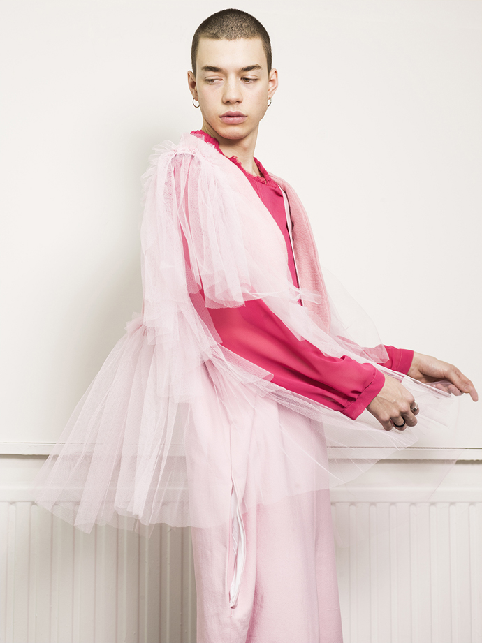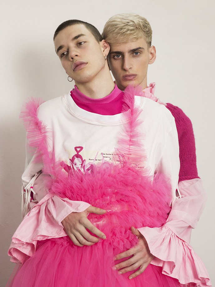 A KALTBLUT exclusive menswear editorial. Models are Reilee Cousins and Nikolas Santur. Photographer Shannon Darby-Jones has been greatly inspired by Grayson Perry’s book ‘The Descent of Man’ and has attempted to challenge stereotypes that society has embedded in us. What do you perceive to be a man? In collaboration with graduate designer Abbie Sparkes, who shares a very similar mind set. To challenge the default image we have of men, stereotypes are not conformed to in this story, as many have an out-dated, negative attitude to those who break the boundaries of ‘normal’, a dangerous word. These are the type of closed-minded individuals that Shannon enjoys challenging. Femininity in boys is a specific topic she has been experimenting with in the past three years, and feels she has found her niche. Styling by Lucy Bilcock.