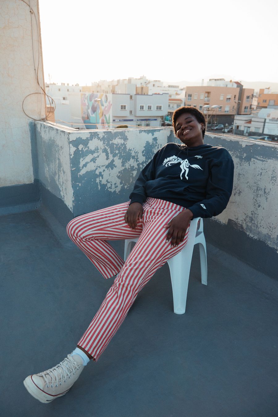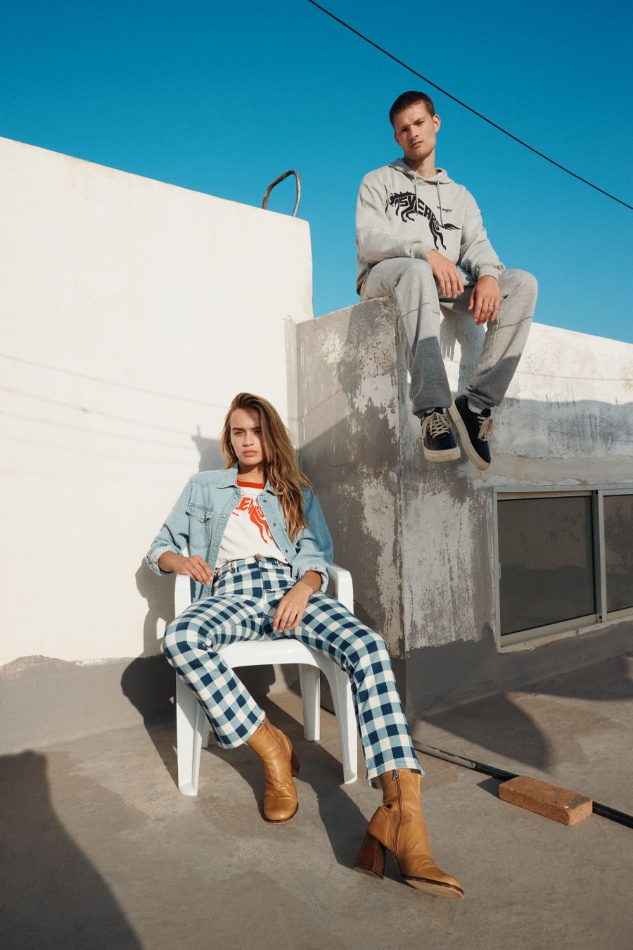 Playfulness and sunny optimism come to women’s printed denim, with ice- cream stripes on straight-leg Wild West jeans and bold checks on the flared silhouette Wrock fit. A denim duvet jacket brings transitional seasonal style, while A-line denim shorts bring a glimpse of summer. For men the anti-fit jacket – featuring dropped shoulders and amplified sleeves – creates an oversized, modern feel.