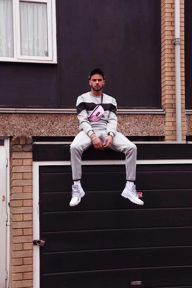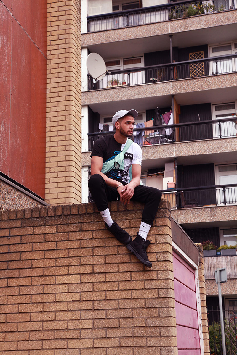 Sadiq wears ELLESE sweater and trousers, NIKE socks, PALLADIUM boots, NEW BALANCE cap and EASTPAK bumbag.